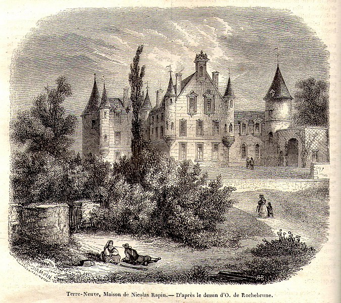 Le château de Terre-Neuve, manoir de la fin du XVIe siècle profondément remanié au milieu du XIXe siècle, témoigne du rayonnement économique et intellectuel du Bas-Poitou. À l’origine, une métairie achetée en 1584 par Nicolas Rapin à Jacques Poictier, parent de son épouse Marie Poictier, a servi de base à l'édification du manoir. Rien ne permet d'affirmer, contrairement à Benjamin Fillon, que la métairie fut incendiée lors du siège de Fontenay en 1587 ; les sources ne mentionnent alors que la destruction de maisons du faubourg Saint‑Martin. La terre fut anoblie le 5 novembre 1594 par André Gallier, seigneur de Guinefolle, information confirmée par les archives des Lazaristes, et le domaine dépendait en réalité du fief de Grissais, quoique les deux fiefs aient eu le même seigneur. Nicolas Rapin fit construire le manoir à la fin du XVIe siècle ; la datation précise et l'identité de l'architecte restent à déterminer, et l'attribution à Jean Morison proposée par Benjamin Fillon ne repose sur aucune source fiable. Jacques Poictier, qualifié d'"architecteur" dans un marché de 1578, témoin d'un marché de 1583, inspecteur de bâtiments en 1590 et propriétaire d'une carrière, pourrait avoir participé aux travaux. Le manoir paraît achevé en 1600, date à laquelle Rapin y donna une réception évoquée dans ses œuvres, et les inventaires du mobilier (1608, 1617, 1638) et les visites détaillées des lieux (1645, 1675) renseignent sur sa distribution ; des marchés pour la réfection d'une galerie sont également attestés en 1614 et 1632. Les Pères de la Mission, dits Lazaristes, achetèrent le manoir en 1701 et s'y installèrent ; leurs documents de 1756 décrivent des travaux comprenant la réfection de la clôture, le déplacement des écuries et du cellier, l'aménagement d'une chapelle en 1711 sous la direction du père Hesnard, des interventions à la cuisine en 1757 et des travaux au puits et aux dépendances en 1760‑1761, dates visibles sur des fronts de lucarnes. Vendu comme bien national pendant la Révolution, Terre‑Neuve fut acquis par Jacques Chevalier en décembre 1797, puis acheté en avril 1805 par Claude Tendron de Vassé, grand‑père d'Octave de Rochebrune. Octave de Rochebrune entreprit d'importantes transformations au milieu du XIXe siècle, parfois en sculptant lui‑même, comme l'attestent les états de section du cadastre de 1843 ; la campagne de 1848–1849 modifia la distribution, reconstruit l'escalier et repris surtout les façades de l'aile nord‑est, où figurent des inscriptions et des armes liées aux Tendron de Vassé, aux Guillaume de Rochebrune et à Alix Grelier de Fougeroux. Lors de ces travaux les toitures furent refaites en ardoise, la façade principale fut harmonisée par l'ajout de pilastres, statues et médaillons, et l'inscription portée à la fin du XVIe siècle par Nicolas Rapin fut replacée au‑dessus de la porte d'entrée. Rochebrune réutilisa de nombreux éléments architecturaux anciens de qualité, dont un groupe important provenant du château de Coulonges‑sur‑l'Autize (caissons, porte de chapelle, cheminée, porche et voûte d'escalier remontés au XIXe siècle), et fit reprendre et agrandir les communs, une opération datée 1876. Le logis conserve le plan en équerre du XVIe siècle et les échauguettes qui flanquent chacune de ses deux extrémités ; il s'ouvre sur une terrasse desservie par un escalier conduisant au parc. Au XIXe siècle Octave de Rochebrune ajouta au décor des éléments provenant également de Chambord — boiseries, panneaux et une porte attribuée au cabinet de François Ier — donnés par le comte de Chambord en 1867, ainsi que des pièces remontées et signalées par des eaux‑fortes et des plaques, produisant un assemblage au goût historiciste de l'époque. Une cheminée étudiée par Fulcanelli porte des symboles et une inscription latine (« Nascendo quotidie morimur ») mentionnées dans les sources. Une tapisserie des Gobelins, offerte par Louis XIV à Voyer d'Argenson, était autrefois placée dans le salon entre colonnes et fronton provenant de Chambord ; cet ensemble a fait l'objet de photographies et de descriptions anciennes. Le château a accueilli au fil du temps de nombreux érudits et personnalités ; parmi ses hôtes anciens figurent des contemporains de Rapin tels que le duc de Sully, Agrippa d'Aubigné et François Viète, et, au XXe siècle, l'écrivain Georges Simenon qui y séjourna de 1940 à 1942. Plusieurs éléments intérieurs — le porche antérieur à l'entrée principale, la lanterne d'escalier provenant de Coulonges, le grand salon avec ses boiseries et d'autres pièces — ont fait l'objet d'une protection au titre des monuments historiques par arrêté du 13 décembre 1978, et les façades et toitures ont été inscrites à l'Inventaire supplémentaire. La propriété, restée dans la descendance d'Octave de Rochebrune, ouvre au public chaque année d'avril à septembre depuis 1974 et abrite depuis 2018 un musée présentant les collections Fontenioux‑Rochebrune, un fonds d'environ trois cents objets et des prêts du musée Dobrée, ainsi que des pièces consacrées au mobilier de l'atelier et de la chambre de Rochebrune.