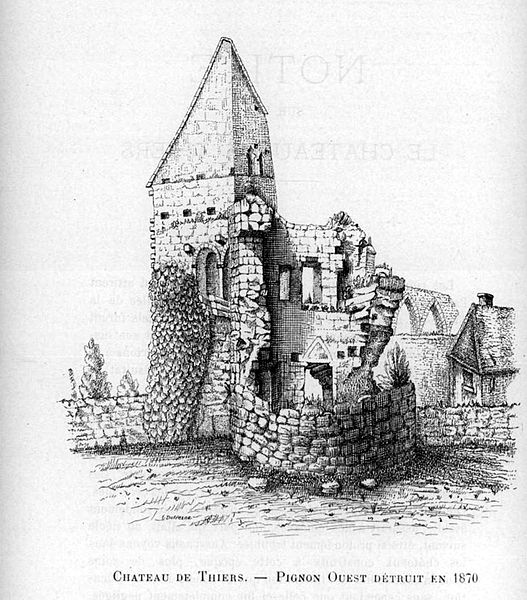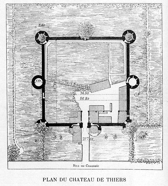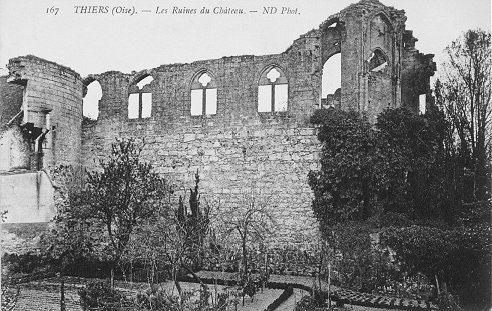 Le château de Thiers-sur-Thève est un ancien château fort aujourd'hui en ruine, dont les vestiges se dressent au nord du village de Thiers-sur-Thève, dans l'Oise, en région Hauts-de-France. Classés au titre des monuments historiques par la liste de 1862, ces restes accueillent depuis des siècles des activités forestières et agricoles et abritent aujourd'hui plusieurs maisons d'habitation. Conçu selon la typologie du XIIIe siècle avec une enceinte flanquée de tours cylindriques, il se distingue toutefois par une grande salle d'apparat dont la façade percée de larges fenêtres est exceptionnelle en Île-de-France. La fonction résidentielle et de représentation l'emporte ici sur le rôle strictement militaire : le château servait de relais de chasse aux évêques de Beauvais. Édifié après le milieu du XIIIe siècle, il n'a été château seigneurial que pendant moins d'une génération et fut partiellement ruiné en 1358 puis démantelé vers 1431. Situé en plaine, au nord du village et face à la place du village au sud, le site est entouré de terrains marécageux à l'ouest, au nord et à l'est et protégé par des douves alimentées par la Thève. Le château a été construit vers 1250-1260 par Thibault de Beaumont-Gâtinais et son épouse Jeanne de la famille des Bouteiller de Senlis. Après la mort de Thibault, ses héritiers vendirent l'ensemble en août 1276 à Renaud de Nanteuil, évêque de Beauvais, sous lequel la grande salle d'apparat paraît avoir été réalisée entre 1276 et 1283. De septembre 1310 à octobre 1311, onze templiers y furent détenus en attendant leur procès. Partiellement détruit lors de la Grande Jacquerie en 1358, une commission recommanda sa remise en état, mais l'idée fut finalement abandonnée avec l'accord du roi Charles V deux ans plus tard. Le démantèlement ordonné en 1431 comprit l'évidement de tours et l'abaissement des murailles à une hauteur d'environ 3 mètres. La seigneurie demeura la propriété des évêques de Beauvais pendant deux siècles, puis les terres furent acquises en 1564 par le connétable Anne de Montmorency. Le 24 janvier 1624, Estienne Chantrelle obtint la concession du château à la condition de bâtir une maison avec les pierres de la cour, sans démolir les ruines. Malgré la protection accordée en 1862, le pignon occidental fut démoli en 1870 pendant la guerre franco-prussienne. Le plan du château est celui d'un quadrilatère presque régulier de 56,80 m de côté, flanqué de neuf tours rondes de 9,60 à 10,30 m de diamètre. L'appareil associe un blocage de petits blocs de grès jusqu'au rez-de-chaussée et, au-dessus, des pierres de taille de calcaire, témoignant de deux campagnes de construction. Quatre tours occupent les angles, trois sont situées au milieu des courtines ouest, nord et est, et deux encadrent le portail au centre de la courtine sud ; à l'exception des deux dernières, les tours sont circulaires et débordent dans la cour. L'épaisseur des murs des tours n'excède pas 2 mètres, inférieure à celle des grandes forteresses édifiées sous Philippe Auguste, et leur état de conservation varie fortement selon les éléments. Toutes les tours comportaient des archères à fente triangulaire au rez-de-chaussée et plusieurs possédaient des escaliers ménagés dans l'épaisseur des murs. La tour de la courtine ouest, dite tour n°5, présentait une voûte en coupole et un sous-sol divisé en quatre compartiments, tandis que la tour d'angle sud-est, n°1, conserve des voûtes d'ogives au rez-de-chaussée et à l'étage. Les ogives reposent sur des culs-de-lampe pyramidaux moulurés et donnent naissance à des colonnes et colonnettes engagées formant des faisceaux, avec des chapiteaux sculptés de feuillages ; cette haute salle d'angle semble avoir abrité la chapelle, composée d'une salle principale octogonale reliée à la grande salle par un mur diaphragme à arc trilobé et de deux petites chapelles latérales dont les vestiges sont visibles. La grande salle d'apparat, située au premier étage au sud entre la porte et la tour de la chapelle, mesurait environ 25 m de long sur 8 m de large et révèle, malgré l'état de ruine, une façade résidentielle exceptionnellement soignée pour la région. Les murs extérieurs, percés de grandes fenêtres en tiers-point au tympan orné d'un oculus quatre-feuilles et subdivisées par un meneau, témoignent d'un aménagement luxueux ; trois de ces fenêtres subsistent au sud et une à l'est. Les murs sur cour comportaient de grandes arcades en tiers-point, sans doute garnies de vitraux, dont deux subsistent au nord ; le plancher reposait sur des arcades semblables dont cinq sont encore debout. Aujourd'hui le plancher et le mur occidental ont disparu et un petit bâtiment moderne occupe partiellement l'espace intérieur. Entre les deux tours centrales du flanc méridional subsiste une arcade en tiers-point, mais aucun dispositif défensif comme herse ou pont-levis n'est apparent : l'entrée était manifestement protégée par deux vantaux en bois. Les courtines ouest et est sont conservées sur une hauteur réduite ; des réparations de clôture ont rebâti certains pans effondrés avec des moellons de qualité médiocre en lieu et place des parements en pierre de taille. La courtine ouest abritait un couloir communiquant avec la tour d'angle sud-ouest et une salle aujourd'hui disparue ; son pignon occidental démoli en 1870 en était le dernier vestige. Près de cette tour, deux grands arcs en plein cintre et des consoles constituent les restes d'une latrine double, probablement construite à l'origine en bois. Dans l'ensemble, l'édifice est unique dans la région par l'alliance du langage de l'architecture religieuse et des caractéristiques des grandes demeures urbaines.