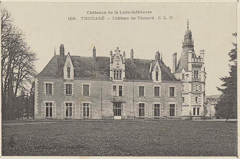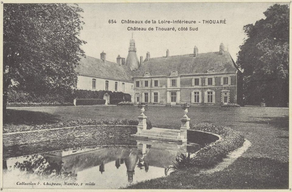 Le château de Thouaré, situé à Thouaré-sur-Loire en Loire-Atlantique, s’inscrit dans un vaste parc planté d’arbres centenaires. Dans sa configuration actuelle, il remonte au XIVe siècle ; il se compose de deux ailes et d’une tour-lanterne de style Renaissance. La façade associe des éléments de différentes époques, y compris des créneaux médiévaux, et des dépendances et écuries lui sont attenantes. Les douves du château sont d’origine ancienne, datées du Xe siècle. Les fenêtres à double meneau datent de la seconde moitié du XIXe siècle. Le pigeonnier, en pierre et tuffeau, date du XVe siècle ; son dôme en ardoise est surmonté d’une sculpture de pigeon et il comporte 1 189 niches, autrefois signe de la puissance seigneuriale. Le château est une propriété privée qui ne se visite pas régulièrement, mais il peut être loué pour des événements privés ; le pigeonnier est parfois ouvert lors des Journées européennes du patrimoine. Le site paraît avoir été occupé dès l’âge du bronze, sa situation en bord de Loire constituant un emplacement stratégique. L’édifice primitif, une motte féodale, aurait été établi au Xe siècle peut‑être sur les vestiges d’une villa gallo‑romaine et dépendait alors du duché de Bretagne. La seigneurie et le château auraient été fondés en 1254 par le chevalier Guillaume de Thouaré, sous le régime de l’évêché de Nantes. Au Moyen Âge, le bourg de Thouaré se forma autour du château ; la chapelle castrale devint la première église Saint‑Vincent avant son transfert au centre du bourg pour des raisons démographiques. Le roi Charles IX fit étape au château le 11 octobre 1565, accueilli par Charles de Bretagne d’Avaugour et sa femme Philippe de Saint‑Amadour. Le monument a été inscrit au titre des monuments historiques en 1982. La seigneurie a ensuite changé de main à plusieurs reprises : après Guillaume de Thouaré, la châtellenie passa par mariage à Briant IV de Montjean via Jeanne d’Ussé, vint ensuite à Gilles d’Elbiest puis, par héritage et alliances, aux familles Saint‑Amadour, d’Escoubleau et de Simiane. Anne Descartes, demi‑sœur de René Descartes, fut détentrice de la seigneurie avant sa vente à la famille Mosnier en 1704. Les Mosnier rendirent hommage pour le château au début du XVIIIe siècle ; la famille conserva la propriété jusqu’à la Révolution, durant laquelle le château fut pillé en 1792. Après la vente comme bien national, la veuve Louis Mosnier le récupéra puis le céda à la famille Cézard, dont Nicolas Sigisbert Cézard acquit la propriété en 1864 ou 1873 ; la famille, ensuite en faillite, vendit le domaine en 1880 et la famille Mathieu de Vienne en fit l’acquisition en 1882.