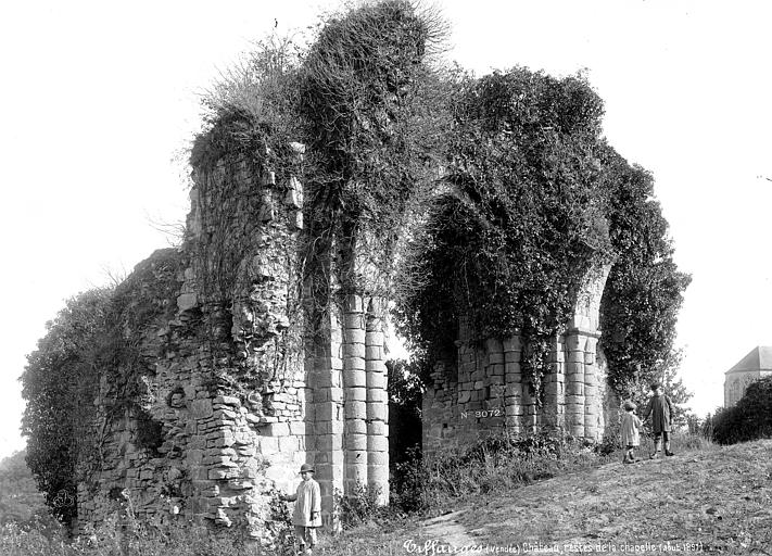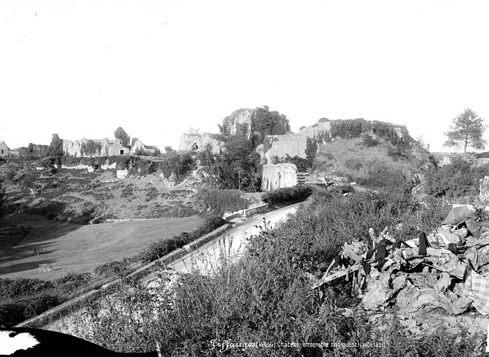 L’enceinte occupe un plateau granitique ovale de 220 m sur 150 m et était bordée de vingt tours ; à l’intérieur subsistent principalement les vestiges d’un donjon carré à contreforts et ceux de la chapelle castrale, tous deux datés du XIIe siècle. Le donjon roman, à l’angle sud, construit avec la porterie au premier quart du XIIe siècle, mesurait initialement 18 m de côté pour 24 m de hauteur ; il ne présente aujourd’hui qu’une hauteur de 18 m et se distingue par des contreforts aplatis aux angles, caractéristique de la tradition des châteaux de Thouars. L’enceinte est renforcée de tours à archères entre 1280 et 1340 ; le donjon est protégé par une chemise édifiée vers 1420‑1460 et, entre 1490 et 1530, la construction des boulevards et des tours du Pertuis, de la Ronde et du Vidame confère à la forteresse son extension finale. Après une première destruction pendant la guerre de Cent Ans, Richelieu fait raser la partie supérieure du donjon en 1626 en le comblant de gravats ; la chemise enserre le donjon sur les faces nord, est et sud, le front ouest étant protégé par la tour‑porte, et la défense est complétée par un châtelet à tour carrée et pont‑levier. La chapelle castrale Saint‑Vincent, à l’est du châtelet, conserve l’abside, un transept à bras très courts et une crypte romane — l’une des rares cryptes romanes subsistantes en Vendée — la nef ayant disparu. Au nord de l’enceinte se dresse la tour du Vidame, la plus imposante : tour d’artillerie en fer à cheval élevée vers 1520, aux murs très épais, coiffée d’un chemin de ronde percé de 37 mâchicoulis et dotée d’un effet acoustique particulier permettant de communiquer à voix basse d’un bout à l’autre.