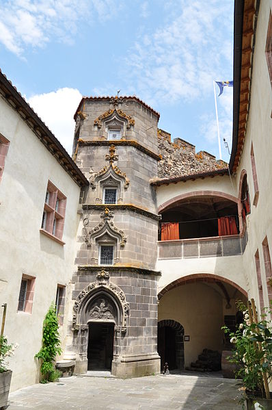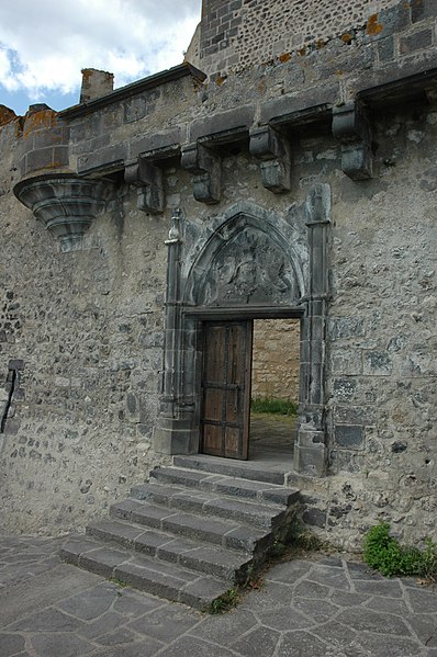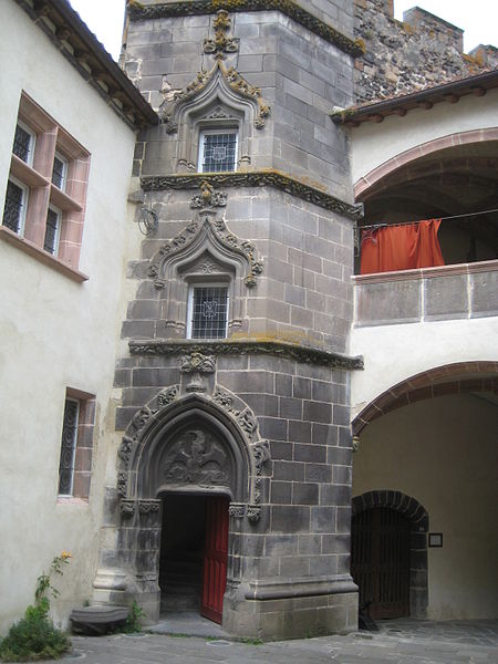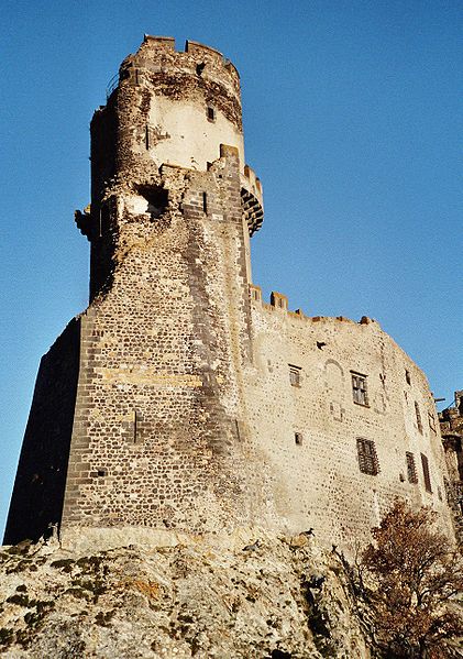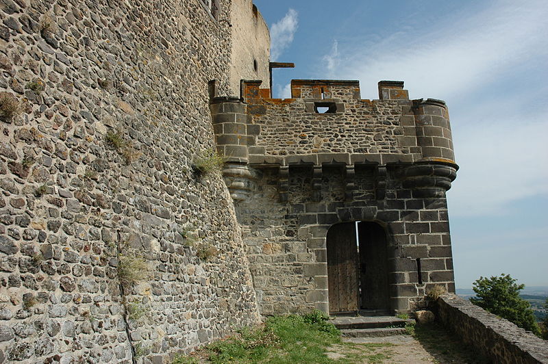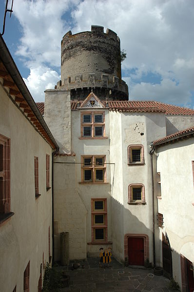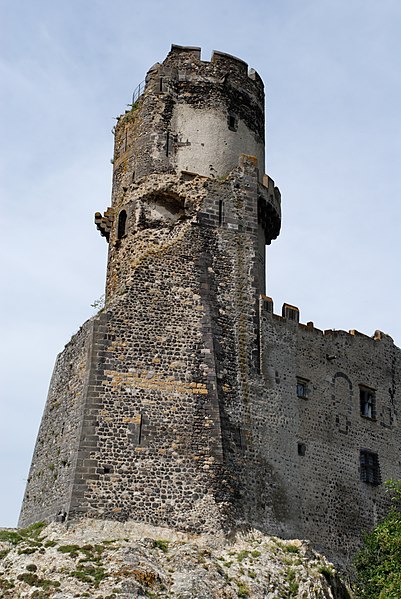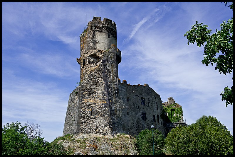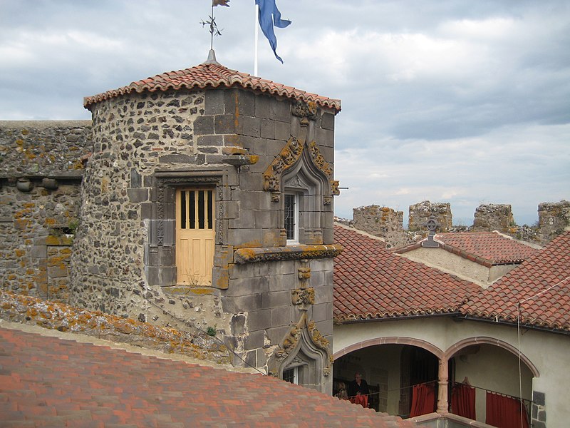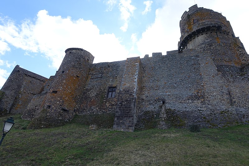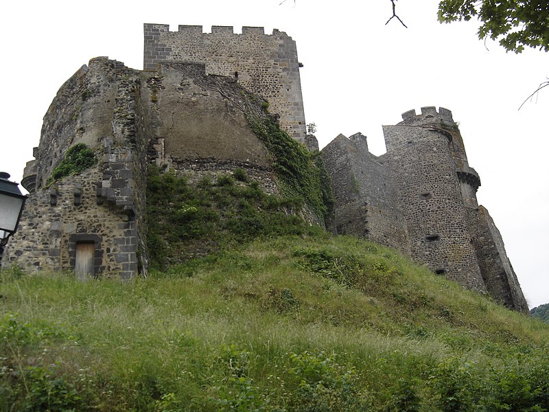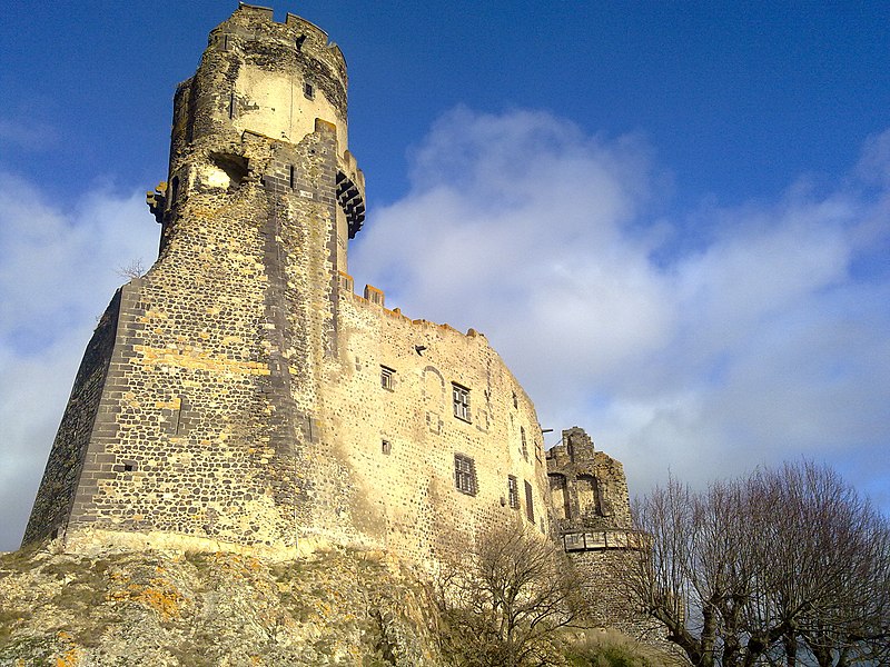 L'architecture aujourd'hui montre un ensemble composé de deux enceintes successives, chacune avec une tour-donjon : une tour d'habitation rectangulaire d'origine XIIe siècle remaniée aux XVe et XVIe siècles, et un donjon circulaire élevé entre le premier tiers du XIIIe et le début du XIVe siècle, protégé par une chemise pentagonale avec éperon face à l'attaque. La basse-cour, peu fortifiée et seulement ceinte d'un mur probablement du XV siècle, précède la haute-cour défendue par la tour de la Garde du XVIe siècle, dite « tour au miche », dont l'appareil de bossages ronds évoque des boulets ou une miche de pain. Le donjon a été ruiné lors du siège de 1595. Les logis conservent des crépis ornés de graffitis, dont une chasse au loup et des scènes obscènes, et un linteau martelé porte un relief représentant saint Georges terrassant le dragon. Le château a servi de résidence seigneuriale jusqu'au XIXe siècle, sans qu'un bourg ne se forme à son pied en raison de la proximité de Volvic.