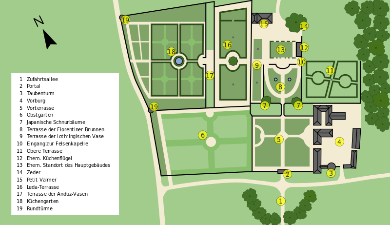 Le château de Valmer, situé près du village de Chançay en Indre-et-Loire, est un édifice de la Renaissance élevé entre le XVIe et le XVIIIe siècle. Ses jardins en terrasses à l'italienne, inscrits aux monuments historiques depuis le 11 mai 1930 et distingués « Jardin remarquable » en 2004, constituent l'originalité du lieu. Le parc, d'une superficie totale de 60 hectares, occupe un coteau dominant la vallée de la Brenne. Le fief de Valmer apparaît dans les sources en 1434 entre les mains de Catherine de Bueil, puis passe successivement à Jacques Binet (1461) et Macé Binet (1500). Le château historique est édifié par Jean Binet à partir de 1520 dans le style de la Renaissance italienne ; la chapelle troglodytique creusée dans le rocher date de la même époque. Propriété de Jean Coustely au moment des guerres de Religion, Valmer est pillé par les Protestants en 1562. Il revient ensuite à Claude Coustely en 1603, puis, en 1633, à Jean de La Baume Le Blanc de La Vallière. Le financier Thomas Bonneau acquiert le domaine le 23 mai 1640 ; il le transforme profondément en construisant notamment la haute terrasse, les communs et le pavillon du Petit Valmer, et il fait édifier une troisième chapelle. Après Thomas Bonneau, la seigneurie passe à Étienne-Dominique Chaufourneau, trésorier des gardes suisses, puis à sa sœur Geneviève-René Chaufourneau, avant d'être successivement détenue par Gatien Pinon, Nicolas Chaban, Marie Chaban puis Thomas Valleteau de Chabresy. Le corps principal du château est détruit par un incendie en 1948 ; seules subsistent des traces matérialisées sur l'une des terrasses par la plantation d'ifs. Les autres bâtiments et dépendances ont été préservés, notamment le pavillon Louis XIII et la chapelle troglodytique, et servent aux activités du domaine, propriété de la famille de Saint Venant depuis 1888 ; l'actuel propriétaire est Aymar de Saint Venant. L'aménagement en terrasses s'étend sur environ cinq hectares et sept niveaux répartis sur un dénivelé d'environ trente mètres, comprenant la terrasse de Devants, la haute terrasse des charmilles aménagée en chambres de verdure, la terrasse des vases d'Anduze, la terrasse de Léda, la terrasse des fontaines florentines, une terrasse interne du vase de Lorraine et, en contrebas, un potager d'un hectare. La chapelle abrite un bas-relief polychrome en pierre, probablement d'après un dessin de Jean Fouquet, retrouvé à Vernou-sur-Brenne en 1885, et le domaine conserve notamment la sculpture Léda et le Cygne de Jacques Sarrazin (ca. 1650), ainsi que des cheminées et salons remarquables. Les jardins, dessinés à partir de 1647 d'après la volonté de Thomas Bonneau, conservent des plans proches de ceux de 1695 ; certains éléments — fossé et clôture du jardin, entrée, avenue, canal, pont et bassin, terrasse en terre-plein, escalier indépendant, fabrique, jardin fleuri et jardin potager — ont été inscrits aux monuments historiques le 11 mai 1930. Le canal, tracé au bas de la propriété, était proportionné à la longueur de la grande terrasse pour créer un équilibre visuel. Le parc est animé par diverses sculptures et ornements : lions en terre cuite, vases en pierre, une statue de saint Hubert sur colonnette, quatre colonnes en pierre, deux fontaines sur la Terrasse des Parterres, et plusieurs statues sur la Terrasse de la Reine ; l'escalier conduisant au jardin fleuri et au potager est encadré de lions en pierre, et la statue de Léda sur sa terrasse a été remplacée par une figure masculine. Le potager clos d'un hectare, situé sur la terrasse la plus basse, constitue un conservatoire vivant d'environ 900 variétés anciennes ou disparues de fruits, légumes et plantes ; la pergola des courges est particulièrement remarquable et le domaine conserve plus de 3 500 sortes de semences. Le domaine viticole, exploité depuis 1888, produit des vins en AOC Vouvray (méthode traditionnelle, sec, demi-sec, moelleux) et en AOC Touraine (rosé) sur 28 hectares répartis sur sols argilo-calcaires et argilo-siliceux ; au XIXe siècle, la surface avait atteint 100 hectares avant de chuter à quelques hectares à la fin des années 1960.