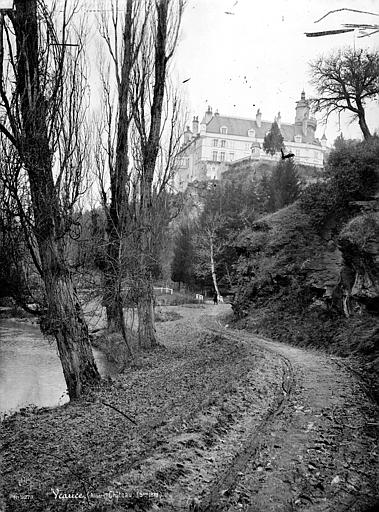 Le château de Veauce est établi sur un promontoire rocheux à mi-pente d'un vallon, dans la commune de Veauce, dans l'Allier, en région Auvergne-Rhône-Alpes ; il domine la forêt des Colettes à l'ouest, ses jardins au sud et à l'est, et le village au nord‑est. Il s'agit d'un château défensif constitué d'un ensemble de bâtiments et de courtines clos autour d'une cour d'honneur, dont les éléments, échelonnés du XIIIe au XIXe siècle, traduisent la transition d'une forteresse militaire à une habitation de plaisance. Le site comporte plusieurs bâtiments et cinq tours reliés par un chemin de ronde couvert, et a été largement remanié au milieu du XIXe siècle. Trois des tours datent des XIIIe et XIVe siècles. Au XVe siècle, une partie des fortifications nord fut démolie pour établir un logis en bordure du ravin ; celui‑ci, flanqué de deux tours, a conservé un aspect médiéval et présente des fenêtres à croisées de pierre, une tourelle d'escalier et une chapelle juchée sur une sorte de porche. Le tournebride, ou manoir des Noix, date également du XVe siècle ; destiné à loger la domesticité, il constitue un petit édifice autonome. Les communs ont été édifiés dans l'enceinte au XVIIIe siècle et, au nord‑est hors des murailles, une vaste terrasse a été aménagée aux XVIIe ou XVIIIe siècles selon les sources ; cette terrasse est cantonnée d'échauguettes et desservie par un escalier monumental. Au XIXe siècle, un nouveau corps de logis d'inspiration Renaissance a été élevé au nord‑est, sans doute à l'emplacement d'un logis de la Renaissance antérieur, et une porterie remplaça un autre bâtiment. La tour carrée, au nord‑ouest, est la partie la plus ancienne du château et remonte au XIe siècle ; elle comporte un assommoir, une meurtrière d'observation et une cloche. La tour de guet, aussi située au nord‑ouest et construite au XIIIe siècle, s'élève à 45 mètres et permettait de surveiller essentiellement le sud et l'est jusqu'à l'actuelle ville de Gannat ; sa base est en pierre de Charroux, une pierre locale perforée par des vers puis fossilisée, selon les études citées. Le donjon, positionné au nord‑est, compte quatre niveaux et est surnommé « la tour mal‑coiffée » en raison d'un crénelage absent au sud ; il fut surélevé vers les années 1850 lors de la rénovation de l'aile est et de la couverture du chemin de ronde, mais une partie de la tour s'est effondrée en 2006 et la végétation pousse aujourd'hui au deuxième étage depuis le trou du sommet. La tour de l'horloge, à l'est, était à l'origine une tour de garde du XIIIe siècle ; elle est communément appelée « tour de Lucie », surnom lié aux enquêtes et aux usages de ses salles lors des études de phénomènes paranormaux après l'effondrement du donjon. La tour d'accès, collée au sud, date du XVIe siècle et ne contient qu'un escalier en colimaçon desservant les étages. Avant la construction du château, un couvent de bénédictins occupait le site ; un premier château fort y fut probablement établi vers l'an 808, au moment où Charlemagne marqua les frontières du royaume d'Aquitaine. Le château fut reconstruit au XIe siècle et remanié au XIIIe siècle ; il appartient au XIIe siècle aux Bourbon. En 1400 la seigneurie de Veauce est érigée en baronnie par Louis II de Bourbon en faveur de Robert Dauphin, et après la mort du connétable Charles III de Bourbon en 1527 le château relève directement de la couronne. Plusieurs familles illustres se succèdent entre 1700 et 1970, parmi lesquelles Chauvigny de Blot, Le Loup, Du Buysson et les Cadier de Veauce, qui le conservent jusqu'au milieu du XXe siècle. Au milieu du XIXe siècle, alors que l'édifice était en mauvais état, le baron Charles de Cadier de Veauce fit entreprendre d'importants travaux de rénovation entre 1841 et 1846, lui donnant l'aspect actuel ; en 1849 il commanda à Edmond Tudot une série de lithogravures représentant le château et ses jardins. En 1971 le domaine est vendu à Ephraïm Tagori ; à sa mort en 1998 le château se dégrade et il est acquis en 2002 par Elisabeth Mincer. En 2015 est créé le fonds de dotation Calligramme - Elisabeth Mincer, dont le but est la sauvegarde du château et son développement comme centre de tourisme culturel et de nature accessible à tous ; ce fonds est renommé Universum en 2023. Au titre des monuments historiques, l'enceinte, la terrasse, les façades et toitures de l'ensemble, à l'exception de celles de la porterie, sont classées par arrêté du 30 août 1985 ; les façades et toitures de la porterie du XIXe siècle sont inscrites par arrêté du 27 octobre 1986 ; les dépendances comprenant le manoir des Noix, le pigeonnier, le haras, le chai, la laiterie, la maison du maître de meute et le chenil sont inscrites par arrêté du 3 février 2011. Selon la légende, Lucie, une jeune domestique d'environ dix‑neuf ans issue d'une famille noble appauvrie, aurait été courtisée par le baron Guy de Daillon et enfermée par la baronne dans la tour de l'horloge où elle serait morte ; elle reviendrait certaines nuits errer sur le chemin de ronde. L'engouement pour les phénomènes de châteaux hantés dans les années 1980 reconnut une médiatisation importante avec l'émission de France Inter « Boulevard de l'étrange » du 8 au 9 août 1984, au cours de laquelle l'équipe dirigée par le journaliste Jean‑Yves Casgha, accompagnée du médium Raymond Réant et d'une jeune témoin, affirma avoir observé une apparition et conserver des traces photographiques et sonores sans explication scientifique à ce jour.