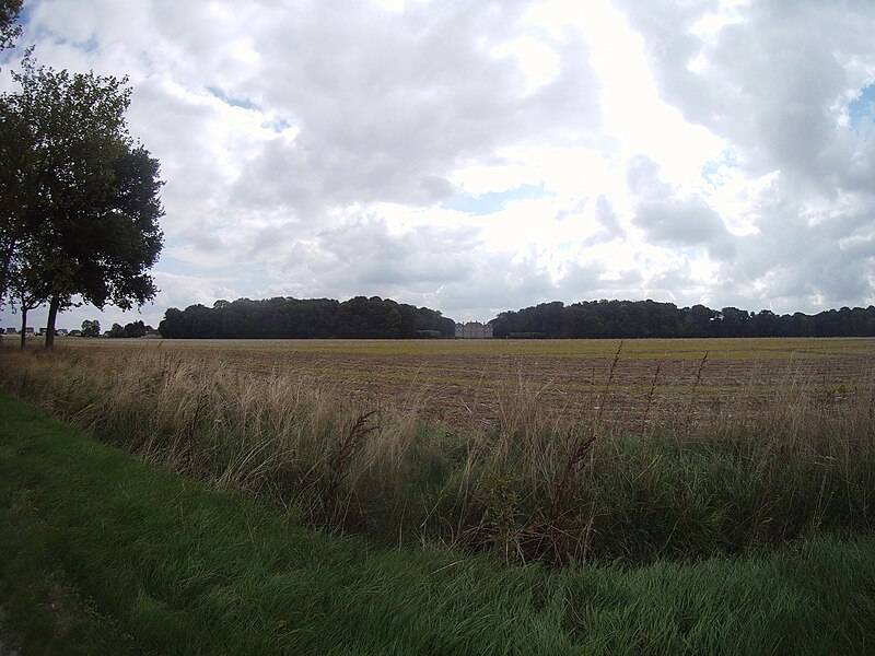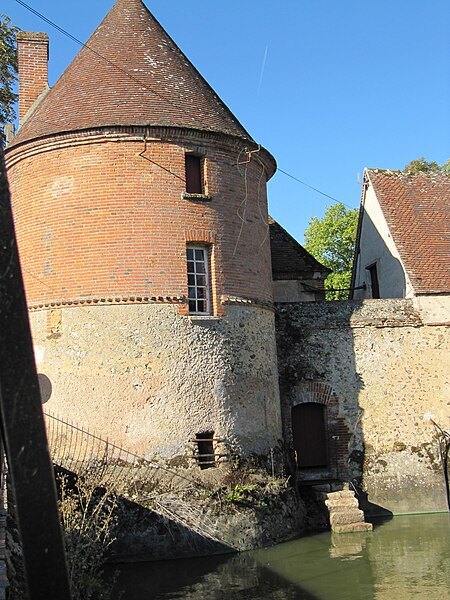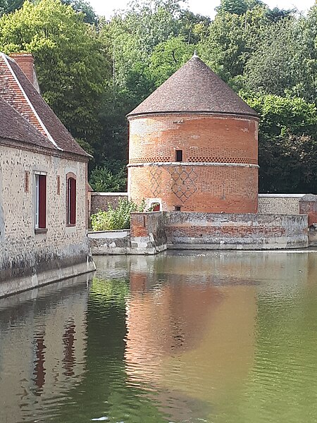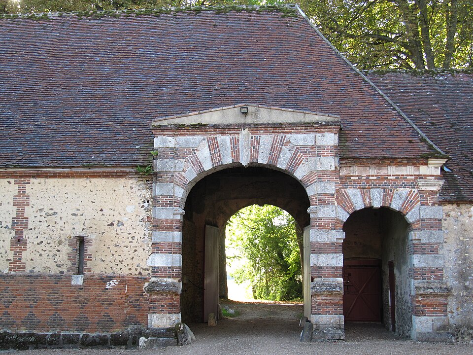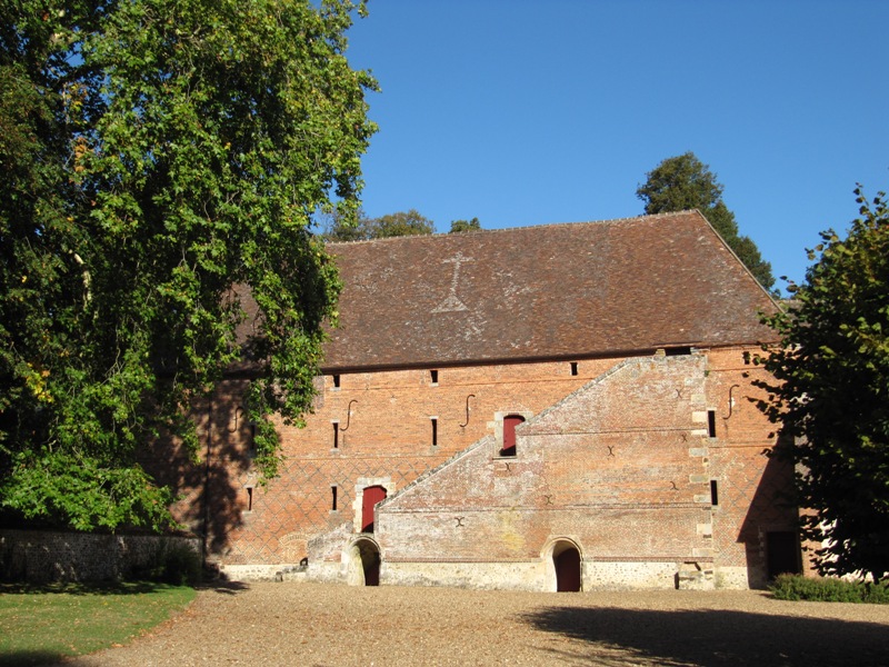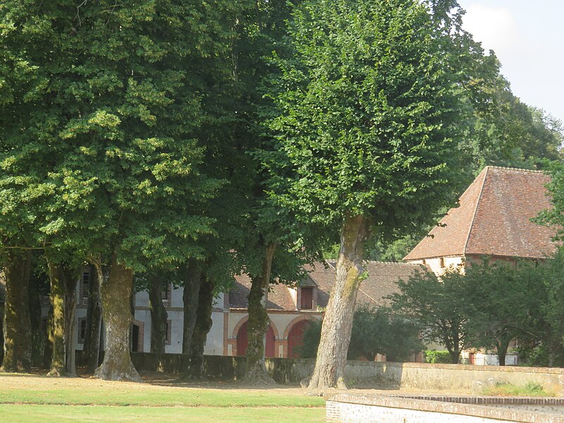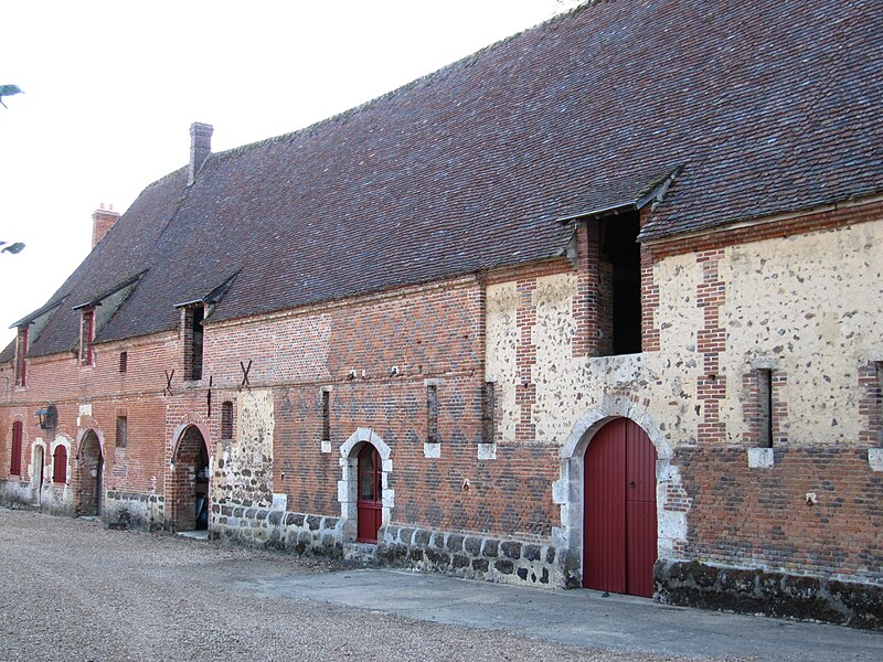 Les communs et bâtiments agricoles, situés à l’est et également protégés, forment un ensemble exceptionnel datant des XVIe et XVIIe siècles, organisé autour de deux quadrilatères accessibles par des porches à guichet. Le bâtiment nord, le plus ancien, sert de grange dîmière sur trois niveaux et présente des murs à parements losangés de brique et des angles appareillés en pierre. Il est prolongé à l’est par une grange; à l’angle nord‑est se trouve une fuye circulaire, également à parements losangés et décorée d’un dessin en forme de croix, dont les pigeons entraient par une triple rangée de jours aménagés en quinconce à mi‑hauteur. Un long bâtiment au soubassement en grison montre une façade en silex et brique, partiellement losangée et percée de portes cintrées, et, à l’autre angle de l’étang, une tour cylindrique porte le même motif en croix. Les documents ne signalent pas de chapelle pour le domaine.