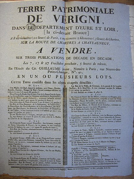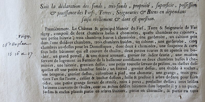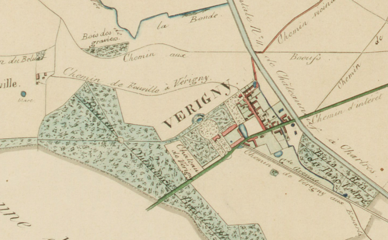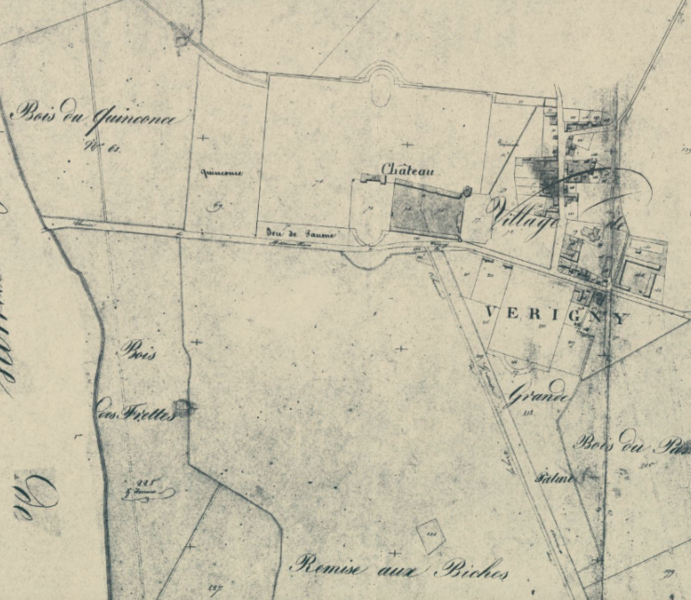La Révolution met fin aux droits seigneuriaux et la contribution foncière puis le cadastre modifient la fiscalité et la représentation du domaine : le cadastre de Vérigny est dressé en 1830 et une carte de 1868 précise la topographie et les chemins. Le château et ses communs sont partiellement protégés au titre des monuments historiques par arrêté du 5 décembre 1975, qui vise les façades et toitures du château et des communs, l’antichambre et le salon avec leur décor, ainsi qu’une partie ordonnancée du parc.