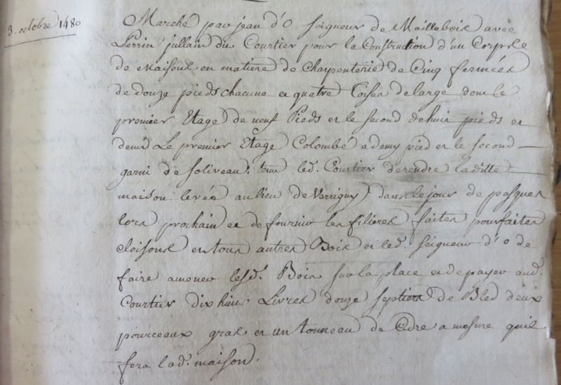 L’origine du site remonte au manoir seigneurial implanté après la guerre de Cent Ans, entouré de murs et d’éléments caractéristiques tels qu’une tour d’angle, un colombier, des meurtrières, une porterie, un étang et des bois, le seigneur exerçant jadis haute, moyenne et basse justice avec une prison au bas de la tour. Une description de 1480 atteste la construction d’un corps de logis avec charpente et étages définis, et en 1650 le lieu est décrit comme un principal manoir voisin d’une maison de fermier, organisés en deux quadrilatères fonctionnels et résidentiels, avec un parc de 47 arpents bordé d’une grande avenue plantée d’ormes. Des documents de 1751 et des baux de 1798 détaillent l’organisation des pièces de réception, des cuisines en souterrain, des chambres de domestiques, ainsi que des bâtiments agricoles — bergeries, étables, granges, pressoir à cidre et la grange dîmière composée de trois greniers superposés. Au XVIIIe siècle, le château neuf est séparé de la basse‑cour, ouvre sur un jardin à la française et compte, selon des sources du XIXe siècle, soixante‑dix‑huit ouvertures ; l’organisation intérieure comprend salles à manger et salons au rez‑de‑chaussée, cuisines et offices en sous‑sol, suites d’appartements pour les invités au premier étage et combles mansardés avec garde‑meuble et chambres de domestiques.