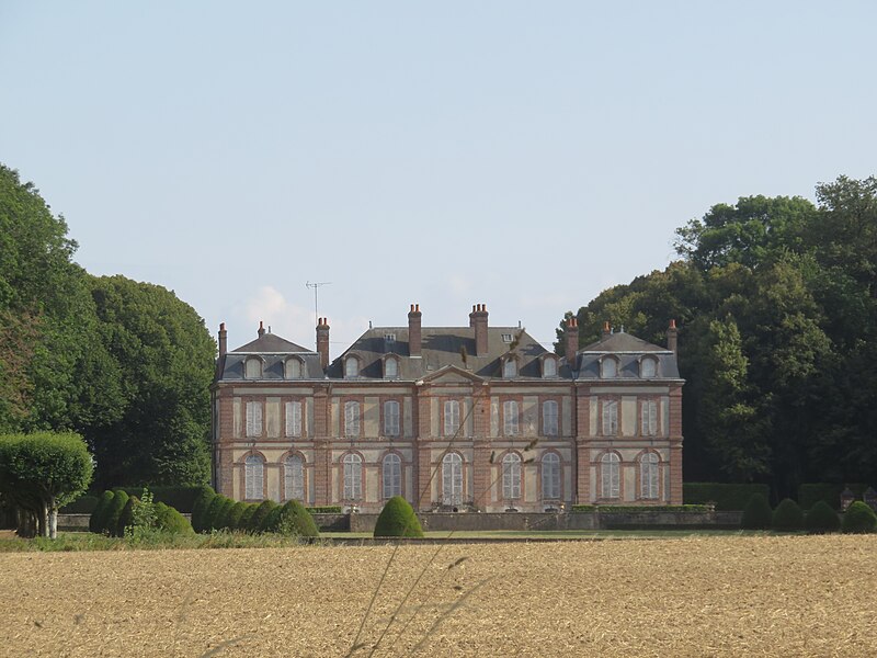 Le château de Vérigny se situe à Mittainvilliers-Vérigny, à quinze kilomètres au nord‑ouest de Chartres, dans le département d’Eure‑et‑Loir. L’édifice principal a été construit vers 1750 et le parc aménagé entre 1755 et 1765 ; il s’agit d’un bâtiment classique composé d’un corps de logis flanqué de deux pavillons en saillie. Précédé d’une vaste cour d’honneur bordée de douves sèches, le château présente sur ses façades un enduit clair rehaussé de chaînes d’angle, de cordons horizontaux et d’encadrements de baies en brique. Côté sud, des pilastres de brique soutiennent un fronton percé d’une haute lucarne cintrée encadrée de pots à feu ; côté nord, le fronton est triangulaire. Les combles, peu développés, se profilent en croupe au centre et à la Mansart sur les ailes. Les portes d’entrée centrales de chaque façade sont dotées d’une rampe en fer forgé de style Louis XV dont l’élégance contraste avec la sobriété du décor. À l’intérieur, les escaliers occupent les angles des ailes tandis que le corps central abrite des pièces de réception en enfilade ; le grand salon conserve de belles boiseries sculptées et des dessus‑de‑porte en grisaille représentant des jeux d’enfants.