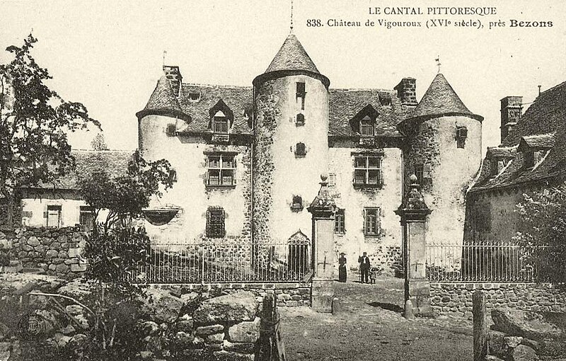 Le château de Vigouroux, situé à Saint-Martin-sous-Vigouroux dans le Cantal, s’inscrit dans une seigneurie attestée depuis le XIe siècle et dépendant des vicomtés de Murat puis de Carlat, qui en furent les possesseurs jusqu’en 1791 ; le domaine comprenait autrefois un château fort, chef-lieu d’une châtellenie, et un château de plaisance construit à proximité par la famille de Berthomier, seul édifice subsistant aujourd’hui. Une famille de Vigouroux est attestée dès le XIIe siècle et, du XIe siècle, subsistent quelques fondations de la forteresse primitive, autrefois bien plus vaste, détruite en 1360 par Jean Chandos, lieutenant du roi d’Angleterre. Le château actuel paraît avoir été élevé au XVIe siècle sur les soubassements de la forteresse ruinée et avec ses matériaux; son plan d’origine a été conservé en grande partie, mais l’ensemble, à l’exception de la tour centrale abritant l’escalier, a été réduit d’un étage, sans doute au XVIIIe siècle, période où une aile fut ajoutée et des boiseries installées. La tour des archives, à l’arrière, a été rasée pendant la Révolution ; le bas-relief représentant l’Annonciation qui ornait le linteau de la porte de la tour centrale a probablement été martelé à cette époque. Certaines fenêtres conservent des éléments de vitraux aux armes des Lastic datés des XVIIe‑XVIIIe siècles, et la chambre du deuxième étage est décorée de papiers peints d’époque; la chapelle castrale était placée sous l’invocation de Saint-Laurent. En 1273 Marquèze de Peyre, veuve du vicomte Pierre IV de Murat, rendit hommage pour Vigouroux à Henri II de Rodez, en sa qualité de vicomte de Carlat, et en 1328 Helis de Murat reçut une dot de 10 000 livres assise sur la terre de Vigouroux lors de son mariage avec Bernard de Cardaillac. La seigneurie supérieure connut des bouleversements : en 1477 elle fut confisquée à Jacques d’Armagnac, décapité après sa révolte, donnée à Jean de L’Isle puis rendue au duc de Nemours ; en 1489 ce dernier vendit les vicomtés de Carlat et de Murat à Pierre II de Bourbon en échange du comté de l’Isle-Jourdain. L’ensemble fut ensuite confisqué à Pierre de Bourbon et annexé à la couronne, entrant à plusieurs reprises dans l’apanage des reines douairières ; en 1641 Louis XIII l’attribua, avec le Carladès, à Honoré II Grimaldi de Monaco et à ses descendants, qui le conservèrent jusqu’à la Révolution française. En 1616 Jacques de Berthomier apporta le château moderne en dot à Annet Ier de Lastic, donnant naissance à la branche de Lastic‑Vigouroux qui résida de façon continue dans le château neuf, installé à côté de l’ancien fort. Annet II de Lastic épousa en 1638 Marie de Greil de la Volpilhère, qui lui apporta la seigneurie de Saint‑Martin‑sous‑Vigouroux et lui donna sept enfants. Annet V de Lastic, marié en 1720 à Marie Coste, fit édifier vers cette époque un nouveau corps de logis en équerre contre la tour Est, tandis que le logis et les deux tours furent abaissés d’un étage. Joseph‑Annet de Lastic, page de Louis XVI, chambellan de l’impératrice Joséphine, inspecteur général des Haras et député du Cantal, épousa Octavie de Lastic‑Sieujac, unissant ainsi les deux branches familiales ; leurs fils Antoine‑Annet dit Tony (page de Charles X), Harold et Octave furent membres de la Société cantalienne. En 1780 subsistait encore un tronçon de tour de l’ancien château, détruit par la suite dont les matériaux furent employés par M. de Lastic pour construire les écuries du château actuel. Vers 1845 Joseph de Lastic vendit le domaine à M. Beaufils‑Coste.