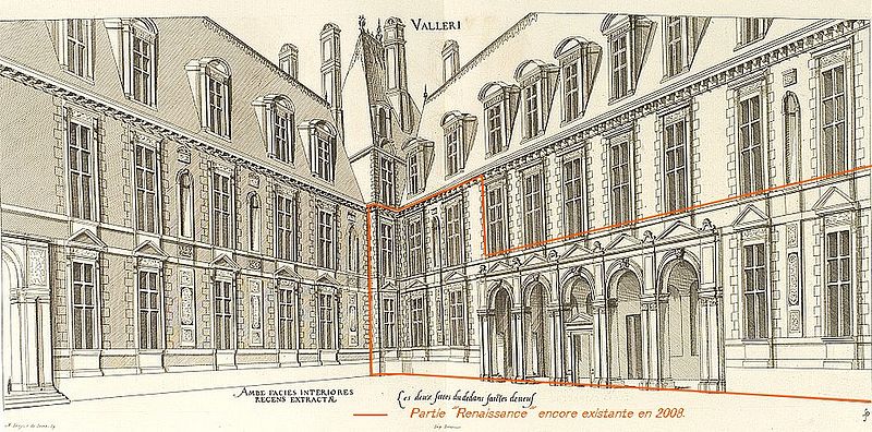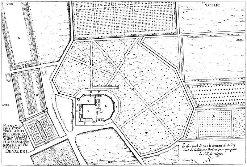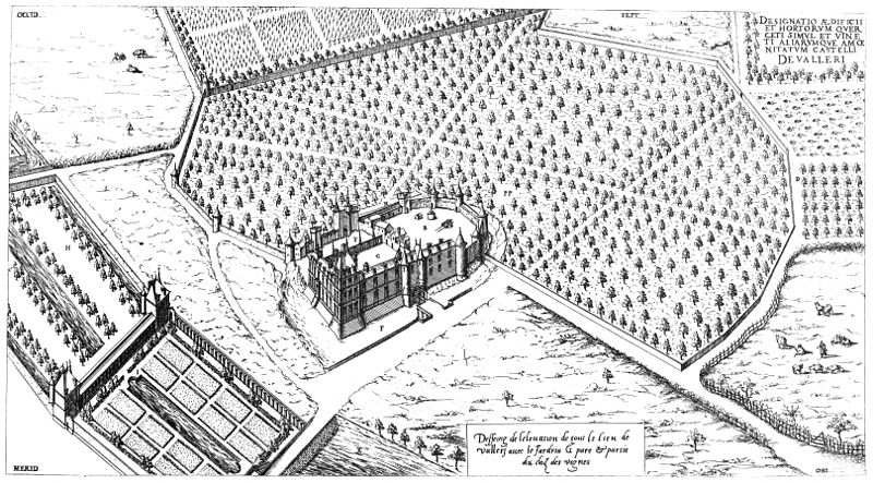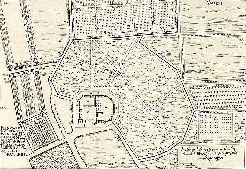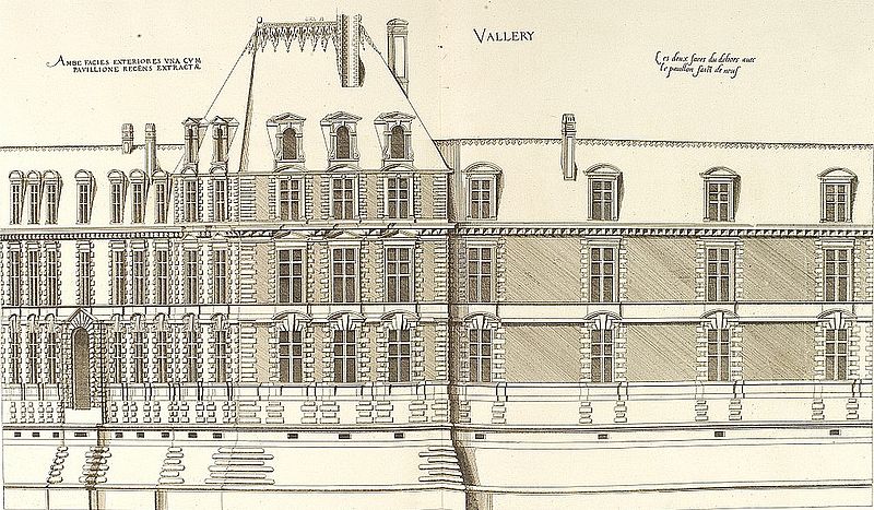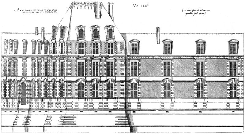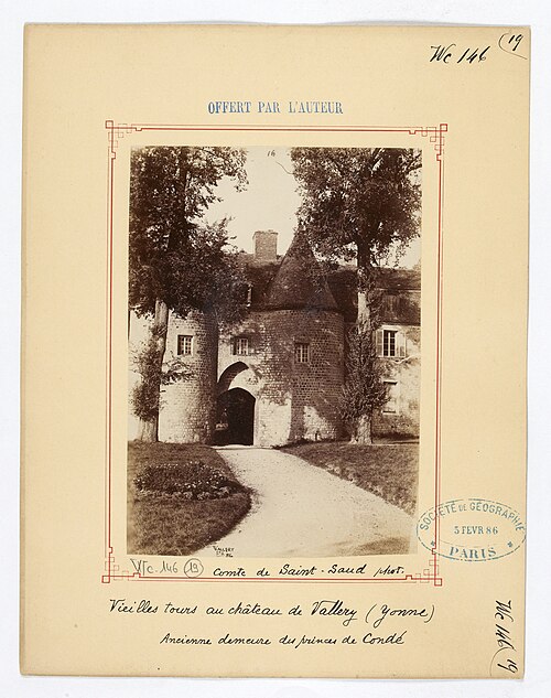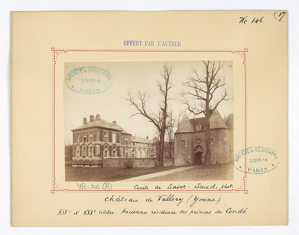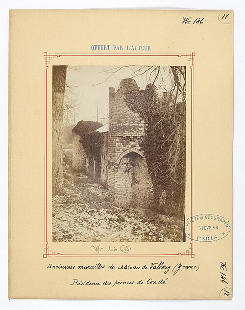Le château de Vallery, dit aussi château des Condé, est situé dans la commune de Vallery, dans le département de l'Yonne, en Bourgogne‑Franche‑Comté. Ancien château fort des XIIe‑XIIIe siècles, il a fait l'objet de réaménagements importants aux XVIe et XIXe siècles. Lié à la famille de Condé jusqu'en 1747, il devint également un foyer actif du protestantisme. L'ensemble conserve d'importantes fortifications médiévales : tours circulaires, courtines et vestiges de l'enceinte du début du XIIIe siècle ; le châtelet d'entrée a été remanié au XVe siècle. À la suite de l'achat de la seigneurie par Jacques d'Albon, maréchal de France, le 16 avril 1548, une reconstruction est entreprise à partir de 1548, vraisemblablement sous la direction de Pierre Lescot ; des marchés de maçonnerie (18 avril 1555), de fourniture de briques (21 février 1556) et de charpenterie (26 juin 1559) sont documentés. Le projet comprenait un corps de logis au sud, un pavillon d'angle au sud‑ouest et une galerie sur portique à l'ouest ; les travaux furent interrompus après la mort du roi en 1559 puis celle du maréchal en 1562. En 1564 la veuve du maréchal céda la propriété à Louis de Bourbon, prince de Condé, qui fit décorer les plafonds de l'aile sud (marché du 5 novembre 1566). Après 1682 l'aile sud fut démolie et le portique fermé; en 1747 Elisabeth de Condé vendit le domaine à Jacques Cordier de Launay. Au début du XIXe siècle Charles‑Michel Cordier modifia lourdement le corps occidental en démolissant la partie nord de l'aile ouest, en dérasant la galerie, en supprimant le dernier étage carré et les combles du pavillon d'angle, puis en abaissant les toits et en complétant les façades par des pastiches; de nombreuses transformations intérieures, dont le cloisonnement de la galerie, eurent lieu dans la seconde moitié du siècle. Dans la basse‑cour subsistent des vestiges de communs, un colombier très ruiné attribué au XVIe siècle et, au sud, un ancien logis médiéval sans doute reconstruit au XVIIIe siècle et très remanié qui conserve une porte du XVe siècle. Le XXe siècle a laissé le château se dégrader, et depuis 1989 il est utilisé par une société privée pour l'organisation de réceptions. Le jardin d'agrément, daté du XVIe siècle et conçu par Pierre Lescot pour le maréchal de Saint‑André, était un jardin régulier formé de seize carrés autour d'un bassin rectangulaire ; la galerie de vingt‑neuf arceaux qui reliait deux pavillons a disparu, mais l'aulnaie avec son bassin et son canal subsiste. L'enceinte médiévale entourait un parc clos planté en partie de vignes de cépages variés. Le portique et le pavillon de jardin, la digue, le verger, le jardin potager, ainsi que le bassin et le canal d'irrigation ont été classés au titre des monuments historiques le 12 juillet 1946 ; le château et ses dépendances sont classés depuis le 4 octobre 2001. Sur le plan architectural, Jacques Androuet du Cerceau a rapproché la décoration et l'ordonnance du palais de Vallery de celles du Louvre de la même époque, soulignant l'usage combiné de pierre et de brique et l'emploi de marbre polychrome pour certains ornements. L'ancienne muraille du XIIe siècle délimitait deux zones, la cour d'honneur et la basse‑cour, cette dernière abritant des écuries placées à un niveau différent en raison de la forte déclivité du terrain.
