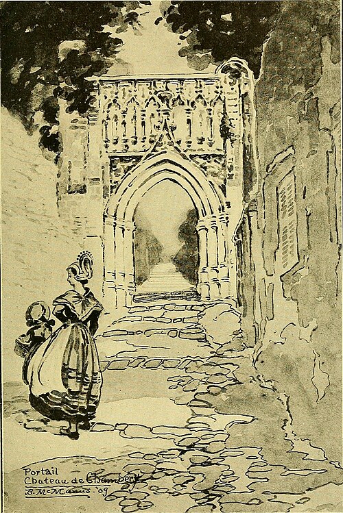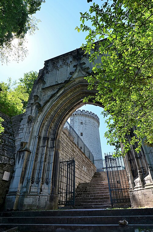 Sur le plan architectural, le château présente la forme d'un quadrilatère irrégulier avec un donjon carré, une tourelle de guet, une haute tour semi‑circulaire et la haute chapelle, tandis que des vestiges de la motte primordiale subsistent sous une plate‑forme à l'est. Les jardins actuels occupent l'emplacement de bâtiments disparus, comme la Grande Salle et la tour des Poudres, emportés par les incendies et les démolitions des XVIIIe et XIXe siècles ; le portail du XVe siècle du monastère Saint‑Dominique y a été réinstallé. La tour Yolande abrite l'histoire du carillon exposé à l'Exposition universelle de 1937, installé ensuite au château en 1938 et remplacé en 1993 par l'instrument actuel de 70 cloches dont la grosse cloche pèse 5 100 kg.