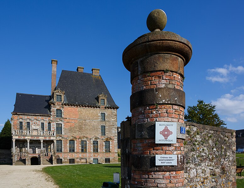 Le château de Montgommery se dresse à Ducey, aujourd'hui commune déléguée de Ducey-Les Chéris, dans le département de la Manche en Normandie, à proximité de la Sélune. C'est une ancienne demeure du XVIIe siècle dont une partie est protégée au titre des monuments historiques. Au début du XVIe siècle, l'ancien château du hameau de Mortrie passa à la famille de Montgommery par le mariage de Claude de La Boissière avec Jacques Ier de Montgommery ; le manoir médiéval subsista jusqu'au début du XVIIe siècle, parallèlement à l'érection d'un nouveau logis. Gabriel Ier de Montgommery, régicide involontaire du roi Henri II, s'y réfugia en fuyant la haine de Catherine de Médicis ; converti au protestantisme, il fut exécuté le 26 juin 1574 et ses biens furent confisqués. Réhabilité en 1576 par Henri III, son fils Gabriel II, devenu gouverneur de Pontorson, put réoccuper le manoir en 1596 après son mariage avec Suzanne de Bouquetôt. Vers 1624, Gabriel II fit édifier de nouveaux bâtiments dont une faible partie reste visible aujourd'hui. Au XIXe siècle, le château se dégrade ; une distillerie, aujourd'hui disparue, fut installée dans la cour et fonctionna de 1970 à 1980. La commune acquit le site en 1986 et entreprit sa restauration. Ce qui subsiste présente un corps de logis central percé de hautes fenêtres surmontées de frontons pointus ou arrondis et bâti sur des caves à demi enterrées. À gauche du logis se trouve la partie centrale du manoir de Gabriel II, accessible par un escalier de granit menant à une terrasse dotée d'un balcon soutenu par quatre colonnes aux chapiteaux d'inspiration corinthienne ; l'alternance des lignes, l'emploi de la brique et de la pierre, les demi-fenêtres à frontons et certains décors intérieurs témoignent du style Louis XIII. Séparée depuis les années 1860, une longue aile terminée par un pavillon subsiste dans une propriété distincte ; à l'origine, deux bâtiments perpendiculaires étaient reliés par un gros pavillon d'angle et une aile supplémentaire devait former un ensemble en U autour du corps central, mais ces éléments furent partiellement détruits au début du XIXe siècle pour permettre l'ouverture de nouvelles fenêtres, d'où l'aspect hétéroclite de la façade du pavillon. L'intérieur conserve un escalier à double révolution, au premier étage un plafond à poutres apparentes décorées de motifs floraux comparable à celui du château de Blois, un haut de cheminée du XVIIe siècle et des pavés armoriés. Au début du XVIIe siècle, Gabriel II fit également édifier un nouveau lieu de culte protestant, presque en continuité avec la chapelle Saint‑Germain que les Montgommery avaient transformée en prêche au XVIe siècle. Le château est classé au titre des monuments historiques par décret du 20 janvier 1923 ; les façades et les toitures du petit pavillon et des communs sont inscrites par arrêté du 14 juin 1990. Une garniture de lit, datée de la limite XVIIe–XVIIIe siècle et composée de neuf éléments de tentures d'un lit à baldaquin, est classée au titre des objets depuis le 20 décembre 1999. Divers éléments intérieurs et des dépendances bénéficient également d'une protection, notamment le grand escalier, l'entrée à colonnes baguées, le plafond et la cheminée de la chambre dorée, le plafond du petit cabinet dit « Vénus et l'amour », ainsi que l'entrée du château.