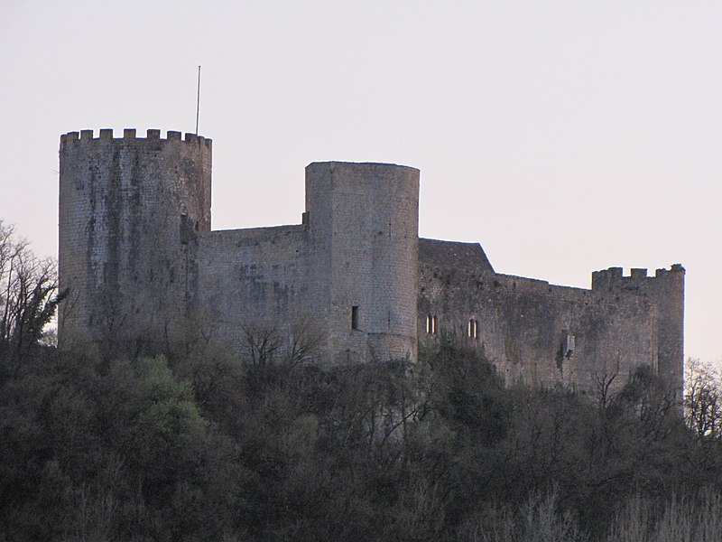Le château de Sauveterre, dit « des rois-ducs », est une forteresse édifiée sur un éperon rocheux dominant les vallées de la Lémance et du Sendroux, non loin du Périgord noir et du Quercy. Construit à la fin du XIIIe siècle sur l’ordre d’Édouard Ier pour défendre l’est de l’Agenais, il est mentionné comme castrum dans l’ordonnance de 1289. Bâti selon une conception de défense jugée archaïque, il n’intégrait pas certaines innovations militaires contemporaines. Des travaux furent menés au début du XIVe siècle, notamment en 1304–1305, avec l’intervention du maître maçon Guillaume de Genève. Un village fortifié, ou castelnau, se développa en liaison étroite avec la forteresse, comme l’attestent l’octroi d’un consulat et l’existence d’enceintes. Pendant les conflits du XIVe et XVe siècles, le château changea plusieurs fois de main : pris et repris au gré des affrontements entre les couronnes d’Angleterre et de France, il fut reconquis par Édouard III en 1348 puis définitivement occupé par les Français en 1432. Remanié aux XVe et XVIe siècles, il conserva l’essentiel de ses éléments médiévaux et devint à la fin du Moyen Âge une résidence seigneuriale. Après 1476 la famille Sermet s’y installa durablement ; le site passa au milieu du XVIe siècle à Antoine de Saint Astier puis, par mariage au début du XVIIe siècle, à une branche de la famille de Losse jusqu’à la Révolution. Le château fut incendié en 1789 et acheté en 1936 par l’aviateur Jean Mermoz. L’ensemble du monument, son terrain d’assiette et son fossé ont été classés au titre des monuments historiques par arrêté du 19 septembre 2003. Sur le plan architectural, la forteresse conserve des structures médiévales importantes et s’étend sur près d’un demi-hectare hors fossé. Elle présente un plan allongé en pentagone, trois tours reliées par des courtines et un donjon de plan interne hexagonal et de forme semi-circulaire tournée vers la basse-cour. Le donjon, massif et haut d’environ vingt mètres, comporte deux étages voûtés et une plate-forme crénelée sommitale; les tours nord et ouest reproduisent l’ordonnancement hexagonal intérieur et associent fonctions militaires et domestiques, avec cheminées, latrines en encorbellement et meurtrières. Les murs d’enceinte, divisés en plusieurs tronçons, présentent des épaisseurs et hauteurs adaptées aux secteurs défensifs et conservent de nombreuses meurtrières. À l’est, un fossé large d’environ vingt mètres a été taillé dans le rocher et un mur de défense au nord se prolonge jusqu’au château, formant un éperon barré. Les vestiges d’habitations montrent des éléments du XIIIe et du XVe siècle, des trous de poutre et des corbeaux ayant soutenu des étages ou un balcon, tandis que les approvisionnements en eau étaient assurés par une citerne contre la tour nord, un puits et une citerne à ciel ouvert dans la cour. La basse-cour est dominée par un mur rectiligne fortifié qui surplombe le fossé, comportait un chemin de ronde et plusieurs meurtrières et constituait l’unique accès apparent au site. Au total, vingt et une meurtrières de modèles variés sont dénombrées sur le site, traduisant la combinaison d’une défense active et d’aménagements domestiques. L’ensemble, bâti principalement en pierre de taille de moyen appareil et jointé à la chaux, illustre les pratiques constructives médiévales et leurs remaniements ultérieurs.