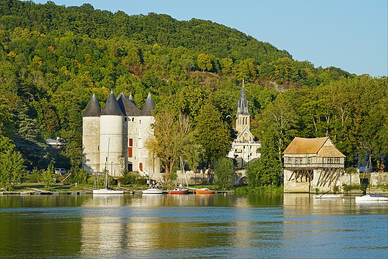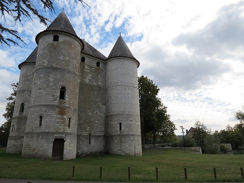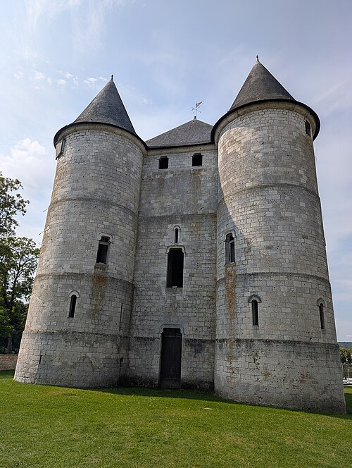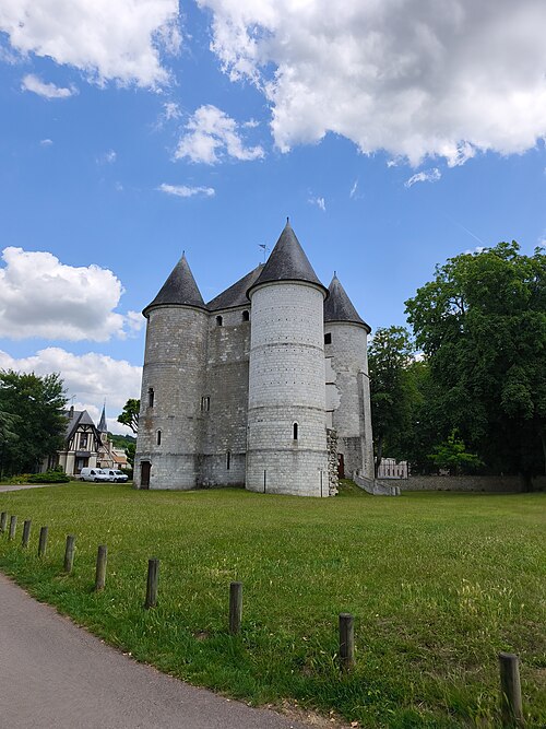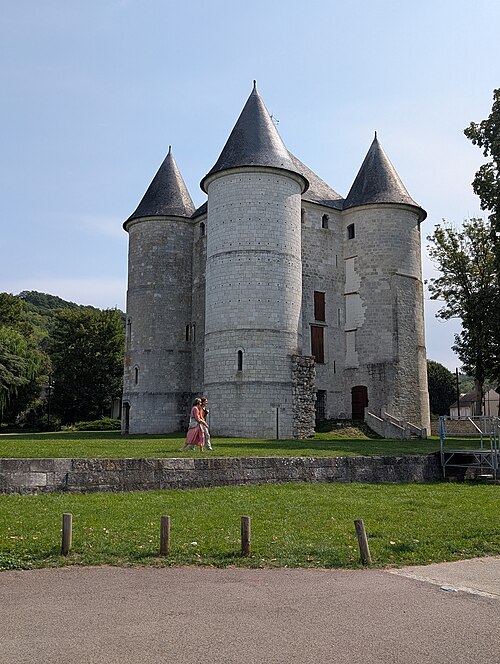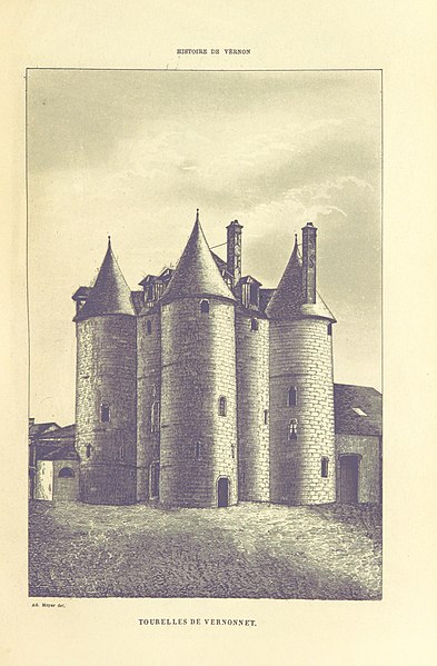 L'ancien château de Vernonnet, dit château des Tourelles, est un édifice du XIIIe siècle situé à Vernon, dans l'Eure, au bord de la Seine dans le Vexin normand. Construit probablement sous le règne de Philippe Auguste pour renforcer la défense de la rive droite et protéger le pont, il remplaça un ouvrage antérieur attribué éventuellement au duc Henri Ier de Normandie. Placé parallèlement au pont sur son côté nord‑ouest, il se distinguait des fortifications qui barrent habituellement l'axe du pont. À l'origine, le château comprenait un donjon carré flanqué de quatre tourelles cylindriques, un logis carré adossé au flanc sud et, autour de l'ensemble, des courtines et des douves. Le donjon, de plan carré de 10,50 m de côté, est bâti en calcaire de Vernon et s'élève sur trois niveaux ; ses tourelles mesurent 6,30 m de diamètre, environ 14 m de hauteur, avec des murs d'une épaisseur de 1,10 à 1,80 m. Le premier étage abrite une grande salle voûtée sur croisée d'ogives dont la clé plate porte une sculpture de feuilles de vigne et de grappes ; les nervures retombent sur des culs‑de‑lampe sculptés de feuillages et de têtes humaines. Le second étage, qualifié de chapelle, est lui aussi voûté sur croisée d'ogives et présente des retombées sculptées en têtes d'anges. Un escalier à vis ancien se trouve dans la tourelle nord tandis que la tourelle sud reçoit un escalier moderne ; la cage de l'escalier, située dans l'angle sud, déborde légèrement sur les salles intérieures. L'aménagement intérieur montre des couloirs voûtés, des archères et des niches‑fenêtres hautes, ainsi qu'une cheminée monumentale en partie conservée au premier étage. Le rez‑de‑chaussée, autrefois éclairé par de grandes fentes de jour et desservant des tourelles munies d'archères, a pu servir de prison, fait confirmé par des dispositifs de fermeture dans les couloirs d'accès. La hauteur du sol intérieur a été relevée d'environ 90 cm pour faire face aux crues de la Seine, ce qui a réduit la taille des ouvertures d'origine. Le château abritait une garnison et fut pris et remanié à plusieurs reprises, notamment par les Anglais au cours des conflits médiévaux. En 1760 le maréchal de Belle‑Isle céda l'édifice à M. Le Moine de Belle‑Isle, qui entreprit entre 1760 et 1765 une importante restauration attestée par une inscription datée de 1763. Ces travaux comportèrent l'ouverture de nouvelles portes et fenêtres, l'aménagement d'un escalier en vis dans la tourelle sud et le remplacement du couronnement primitif par un parapet crénelé supportant une charpente et une couverture. Après la restauration, le château fut vendu au meunier Planter (date donnée comme 1765 ou 1778 selon les sources), qui transforma l'édifice en minoterie en perçant de larges ouvertures, en aménageant des planchers et des plates‑formes et en comblant certaines archères. Sous la Révolution il servit de prison, puis de 1841 à 1849 il fut utilisé comme caserne ; remis au domaine, il passa ensuite entre diverses mains avant d'être acheté en 1854 par l'industriel Ogerau, qui fit fonctionner une tannerie sur le site. La Seconde Guerre mondiale l'endommagea : des bombardements en 1940 détruisirent la toiture et une bombe en 1944 détruisit la tourelle ouest ; des campagnes de restauration ont eu lieu en 1959‑1960, en 1982, puis des reconstructions partielles de la tourelle ouest en 1984 et 1997, et une campagne achevée en septembre 2019 a permis de poursuivre la remise en état. La ville de Vernon a acquis le château le 4 octobre 1955 ; il est compris dans un site inscrit depuis le 22 novembre 1943 et classé au titre des monuments historiques depuis le 12 janvier 1945. Le château, qui forme un ensemble avec le vieux moulin, l'ancien pont et les îles voisines, a également servi de décor au tournage du film Les grandes vacances. Depuis le 9 décembre 2016 il bénéficie d'une mise en lumière architecturale mettant en valeur les tourelles et la végétation environnante, complétée par un éclairage intérieur et des projections lors des périodes festives.