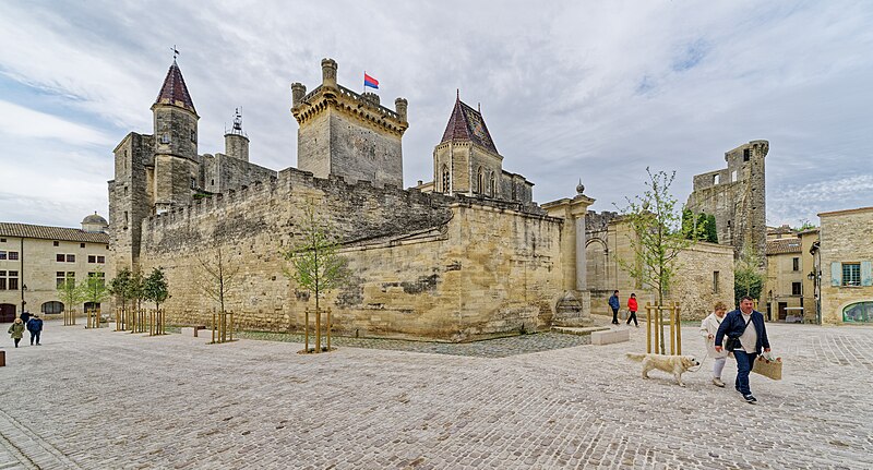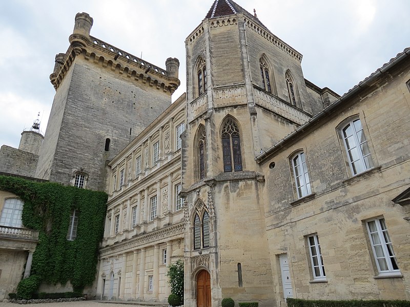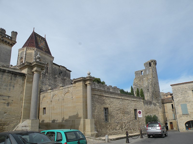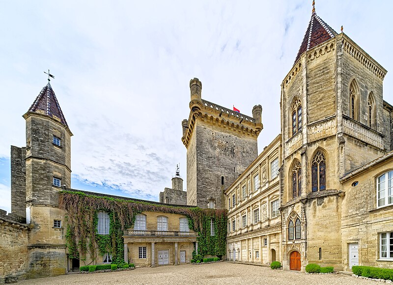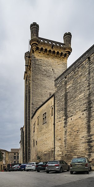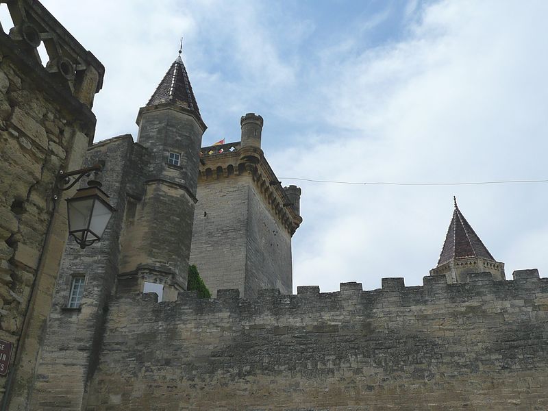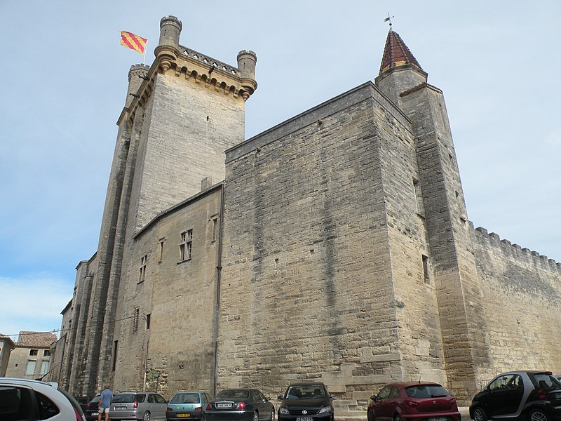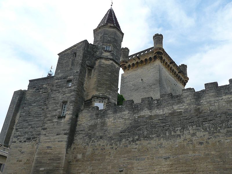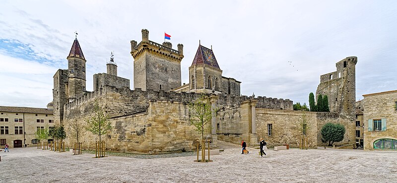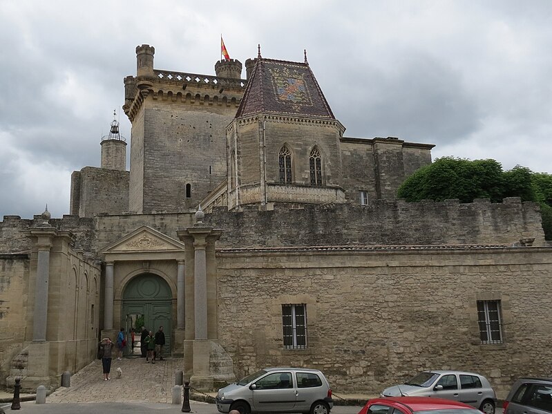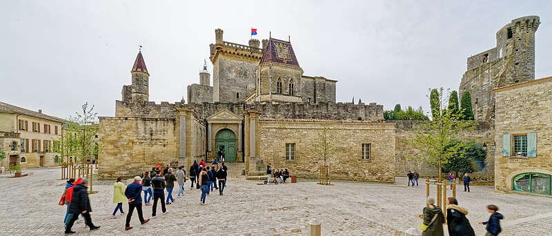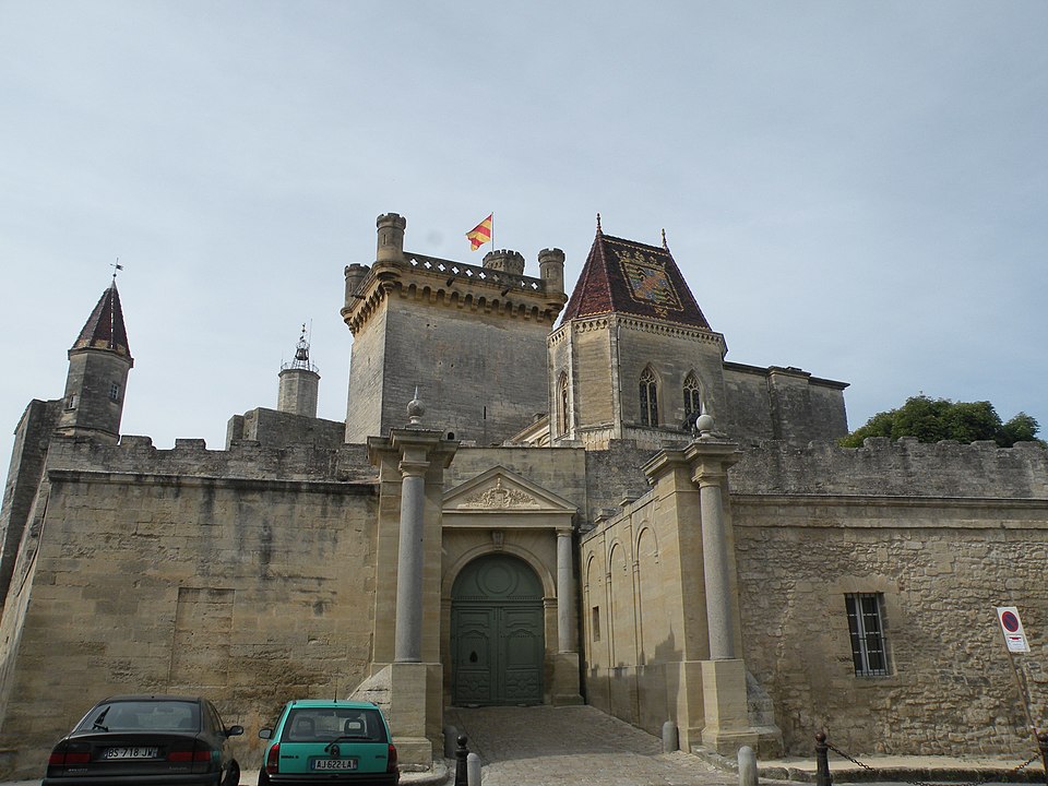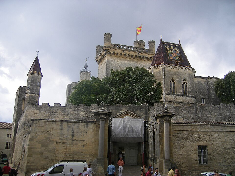 Le château dit Le Duché, ou château d'Uzès, est un château fort du XIe siècle situé dans la ville médiévale d'Uzès, dans le Gard, en Occitanie. Il constitue le fief de la même maison depuis neuf siècles et fait l'objet d'une inscription aux monuments historiques depuis 1934, avec un classement partiel datant de 1889. Le site était occupé dès l'époque romaine par un castrum établi sur le point culminant d'Ucetia, entre Languedoc et Provence, à proximité des Volques Arécomiques. La seigneurie d'Uzès fut fondée au XIe siècle par Elzéart d'Uzès et la ville fortifiée ainsi que le château furent édifiés sur cet ancien castrum. L'ensemble fortifié comprend remparts et tours d'angle, un donjon de 42 mètres appelé tour Bermonde élevé au XIIe siècle par Bermond Ier d'Uzès, un logis seigneurial dont la façade Renaissance date du XVIe siècle, des caves millénaires et une chapelle castrale gothique flamboyante du XVIe siècle coiffée d'une toiture en tuiles vernissées de Bourgogne portant les armes d'Antoine de Crussol. Le bâtiment dit de la Vicomté a été édifié par Robert, descendant direct à la huitième génération du premier seigneur d'Uzès, après que Philippe VI eut élevé en 1328 la viguerie d'Uzès en vicomté pour le récompenser de sa bravoure à la bataille de Cassel. L'aile de la Renaissance est due à Antoine de Crussol, premier duc d'Uzès, dont la fidélité à la cause royale pendant les guerres de Religion lui valut les faveurs de Charles IX. Antoine de Crussol, membre du conseil privé, chevalier d'honneur de la reine et de l'ordre de Saint-Michel, commandait pour le roi les provinces du Languedoc, de Provence et du Dauphiné ; en 1572 il obtint l'érection de son duché « en prairie afin de le "décorer de tous les titres et prérogatives qui pourraient de plus en plus l'exhausser et extoller" ». En 1566 l'évêque Jehan II de Saint-Gelais convertit le diocèse d'Uzès au protestantisme ; la cité, largement protestante, prit parti pour la Réforme et fut durement éprouvée par les guerres de Religion. Alors vicomte protestant, Antoine de Crussol s'efforça de réconcilier catholiques et protestants du sud de la France ; Charles IX érigea Uzès en duché en 1565 et le nomma premier duc, puis duc et pair de France en février 1572, avant le massacre de la Saint-Barthélemy et la conversion ultérieure du duc au catholicisme. Le château fut vendu comme bien national pendant la Révolution et transformé en collège ; le dixième duc, Marie‑François‑Emmanuel de Crussol, le racheta lors de la Restauration en 1824, mais il redevint par la suite un collège en raison de difficultés financières. En 1951 la marquise de Crussol entreprit d'importants travaux de restauration et l'acheta en 1957 à son neveu Emmanuel Jacques, quinzième duc d'Uzès ; au début des années 1960 elle intervint auprès d'André Malraux, et la loi Malraux de 1962 permit la création d'un secteur sauvegardé à Uzès en 1965. Aujourd'hui le château est ouvert à la visite et reste la propriété du dix-septième duc, Jacques‑Emmanuel de Crussol d'Uzès ; la cité médiévale est, avec le château, protégée comme secteur sauvegardé depuis 1978 et labellisée ville d'art et d'histoire depuis 2008. L'alignement des trois tours-donjons d'Uzès symbolise les trois pouvoirs médiévaux — royal, épiscopal et ducal — : la tour du Roi, dite aussi tour des Prisons, avec ses mâchicoulis et son jardin médiéval, la tour de l'Évêque ou tour de l'Horloge couronnée d'un campanile, et la tour du Duché, le donjon de 42 mètres du XIIe siècle ; s'y ajoute la tour Fenestrelle de la cathédrale Saint-Théodorit, haute de 42 mètres et datée du XIIe siècle, qui forme une quatrième tour caractéristique d'Uzès.