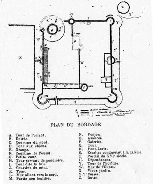 Le château du Bordage avec le logis en totalité, la tour de l'Orient et la tour aux chiens en totalité, le porche d'entrée et les courtines, les façades et toitures des communs, les deux rabines au nord, la ferme du Bordage ainsi que l'ensemble de leurs sols d'assiettes (cad. AC 6, 7, 8, 11, 12, 13, 14, 15, 16, 17, 18, 19, 20, 21, 48, 49, 50, 51, 52, 82) : inscription par arrêté du 10 juin 2020