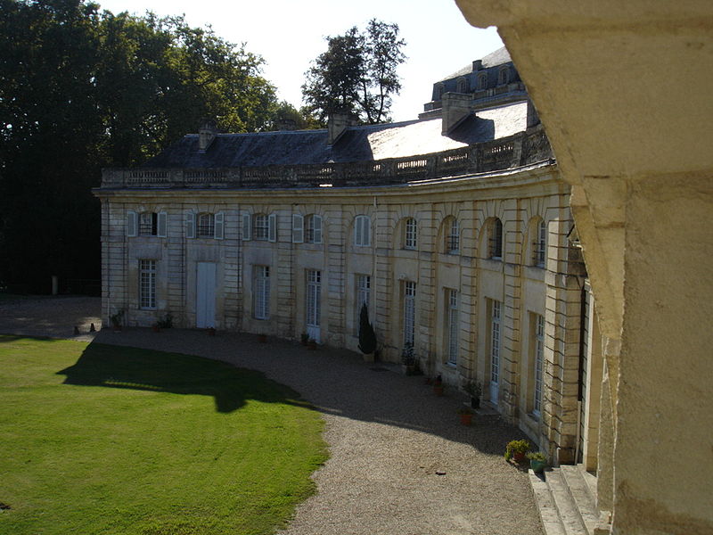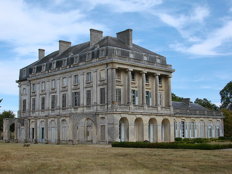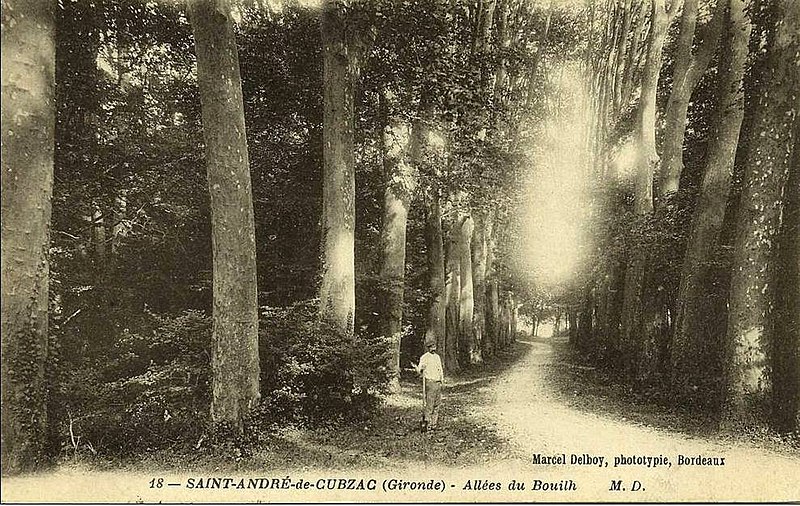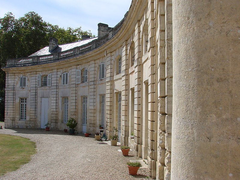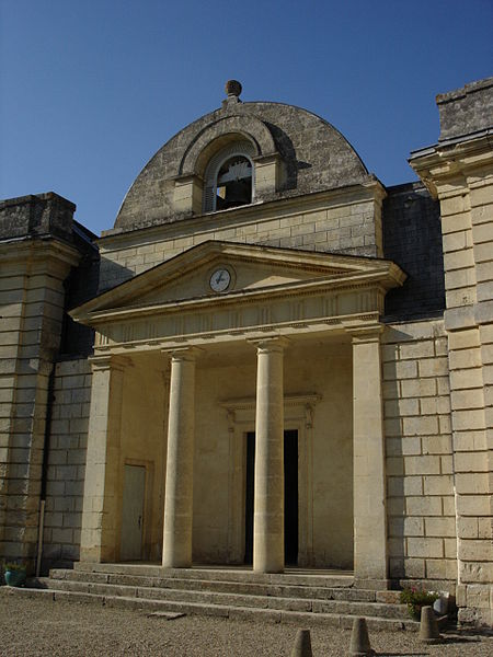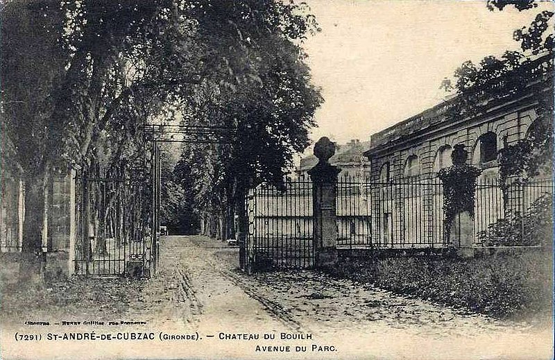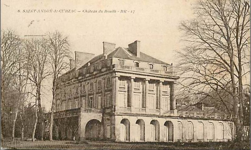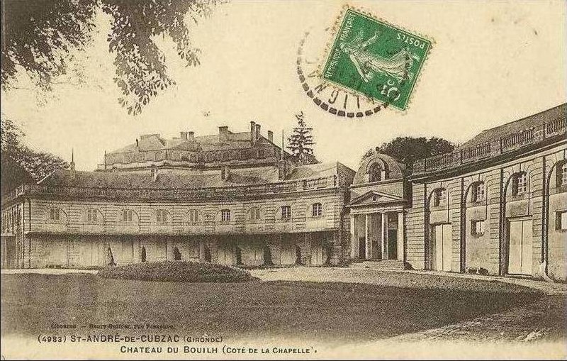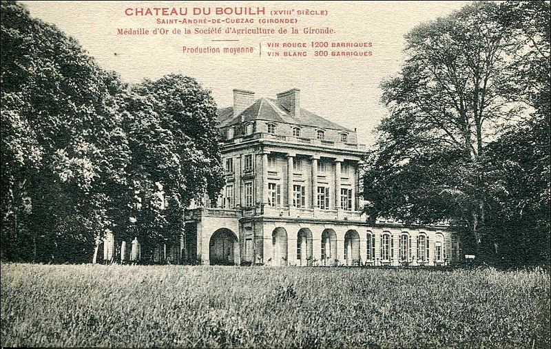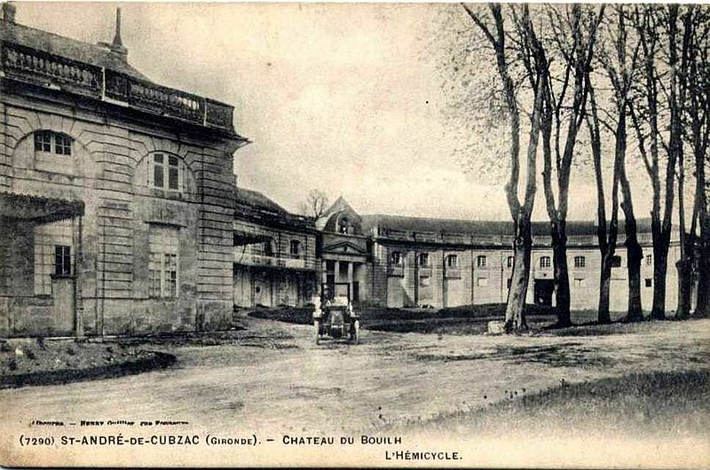 Le château du Bouilh, situé à Saint-André-de-Cubzac en Gironde, comprend un pavillon d'honneur et des communs disposés en hémicycle, construits au XVIIIe siècle sur des plans de l'architecte Victor Louis, qui y travailla de la fin 1786 à août 1789. Une branche de la famille de La Tour du Pin s'établit en Guyenne sous le règne d'Henri III ou Henri IV et reçut la baronnie de Cubzac ; l'un de ses seigneurs fit ériger un château à l'emplacement d'une ancienne maison noble, bâti dans le goût du XVIe siècle, dont il ne subsiste rien hormis une fuie. Sous Louis XV le vieux château fut démoli pour laisser place à un édifice plus conforme au goût du siècle, mais le projet resta inachevé. Les travaux reprirent au XVIIIe siècle selon les plans ambitieux de Victor Louis, si vastes que Jean-Frédéric de La Tour du Pin Gouvernet n'en réalisa qu'une partie ; une machine hydraulique assurait la distribution d'eau dans le parc et les appartements. En 1797 le château est décrit en état d'abandon ; De La Tour du Pin, ministre de la Guerre en 1789-1790, fut compromis dans le procès de la reine et exécuté en 1794, mais la propriété ne fut pas vendue comme bien national. Le projet de Victor Louis prévoyait deux vastes corps de logis reliés par une large galerie semi-elliptique : seul le corps de logis ouest et la galerie furent terminés, le corps est restant à l'état de projet. Au centre de l'ellipse se trouve la chapelle, flanquée de dépendances, et le corps d'habitation ouest s'élève sur plusieurs étages. Sous la terrasse s'étend un important château d'eau octogonal, percé de plusieurs portes, décoré de guirlandes et surmonté d'une tour octogonale abritant la machine hydraulique. Derrière le château, les chais et les cuviers occupent une ancienne cuisine souterraine dont la voûte est soutenue par des piliers naturels, tandis qu'à l'extérieur une construction regroupe les cuves ; les pressoirs reçoivent la vendange par de larges fenêtres établies à un mètre du sol, permettant aux charrettes de déverser directement dans les pressoirs puis les cuves. Le seul vestige de l'ancien manoir médiéval est la fuie circulaire de 12 mètres de diamètre dont les parois renferment 1 200 logettes à pigeons ; l'ancien château comprenait peu de pièces — une salle basse, une salle haute, quatre chambres, une cuisine et des cellules — et était entouré de murailles et de douves franchies par un pont-levis. Les premières traces d'habitat sur le Cubzaguais remontent à la période magdalénienne ; un oppidum existait à l'époque celte à Cubzac-les-Ponts et le nom de Cubzac trouve son origine, selon deux hypothèses, soit dans une tribu des Bituriges Vivisques appelée « Cubes », soit dans une villa attribuée à un certain Cupitus. Au VIIIe siècle le promontoire calcaire accueillait le château des Quatre Fils Aymon, qui fut suivi par plusieurs résidences seigneuriales jusqu'au XVIe siècle, époque où le Bouilh devint le siège du fief. La maison noble du Bouilh est attestée dès 1300, Milon du Bouilh rendant hommage en 1304 ; la baronnie passa ensuite entre plusieurs mains, notamment Bertrand de Montferrand, puis fut vendue en 1524 à Clinet de Lannes et transmise au sein des familles Durfort et La Tour du Pin par alliances. Jean-Frédéric de La Tour du Pin Gouvernet, propriétaire au moment de la reconstruction, cumulait de nombreux titres et fut lieutenant-général des armées ; il entreprit la construction avec Victor Louis pour offrir un séjour digne au roi, mais arrêta les travaux lorsqu'il fut nommé ministre pour éviter toute accusation d'emploi des deniers publics. Le domaine resta inachevé mais a été inscrit à l'Inventaire des Monuments Historiques dès 1938 et classé, avec ses dépendances — la tour d'entrée, le château d'eau, la fuie, les chais, le bâtiment des cuviers, la maison de l'Intendant, le parc et les jardins — par arrêté du 17 mars 1943. Sous la Restauration l'héritier vendit la propriété en 1835 à Florentin Hubert de Montfleury ; le domaine passa ensuite à Louis Henri Hubert-Delisle, puis, par mariage en 1864, aux descendants de Noéline Hubert-Delisle et d'Édouard de Feuilhade de Chauvin, qui en sont aujourd'hui propriétaires. Le château se trouve sur le 45e parallèle, à 26 kilomètres de Bordeaux et de Blaye et à 29 kilomètres de Saint-Émilion, et il a servi de décor à plusieurs films, dont La Cousine Bette (1996), Monsieur Léon (2006) et La Maison des Rocheville (2010).