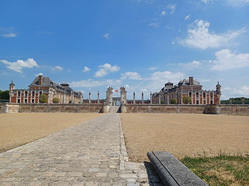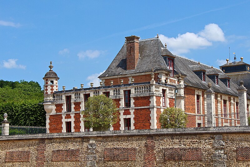 Le bâtiment, de plan essentiellement carré, comprend un corps de logis et des communs symétriques séparés par une cour d'honneur, reliés côté entrée par une galerie à balustrade et côté parc par un mur ponctué de pilastres et d'une porte monumentale surmontée de statues allégoriques. Les ailes et les communs développent chacun environ 80 mètres, en brique et pierre, sur deux niveaux couronnés d'ardoises ; l'ordonnance et le jeu des volumes relèvent d'un vocabulaire classique, ponctué de frontons, d'échauguettes et de bustes inspirés de motifs antiques. La chapelle du château est dédiée à saint Alexandre.