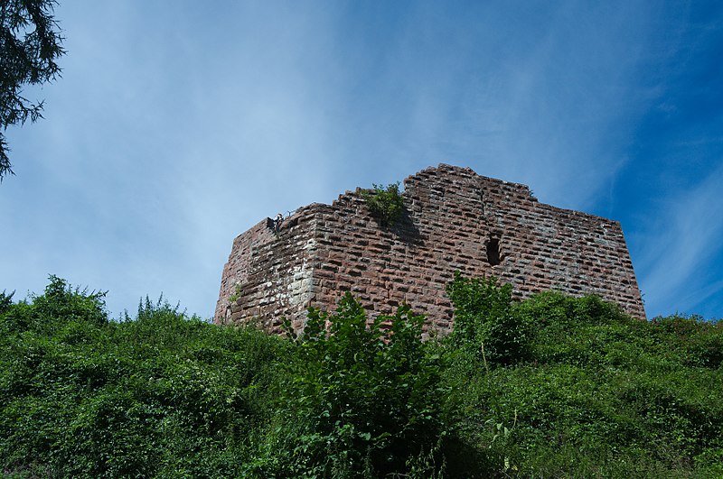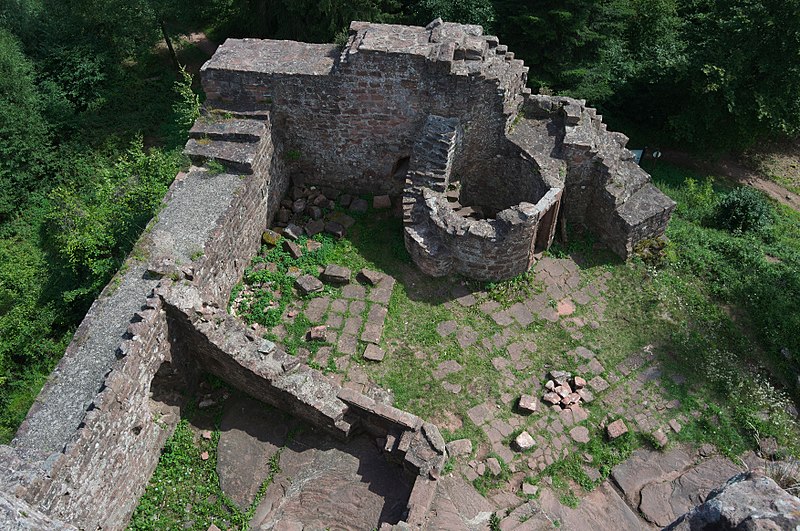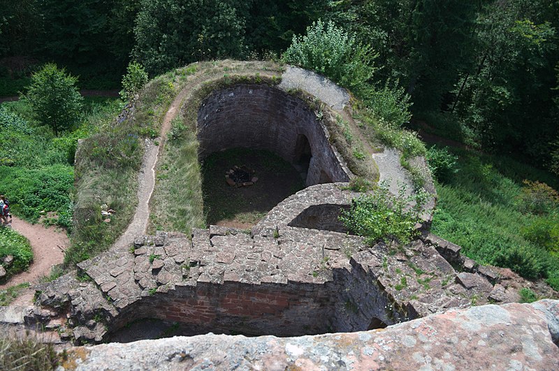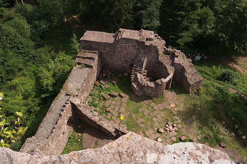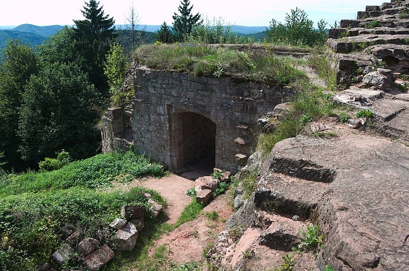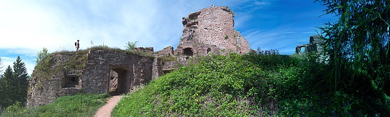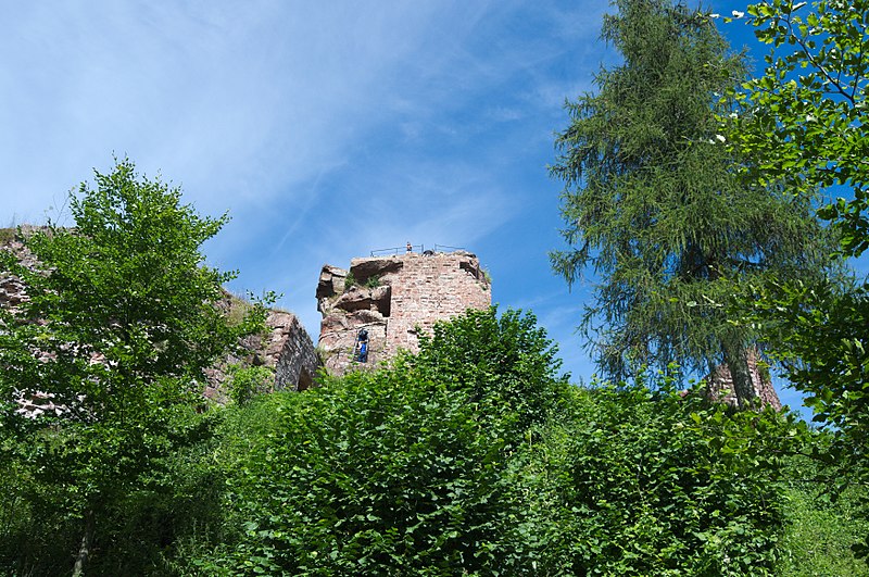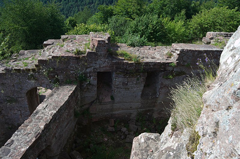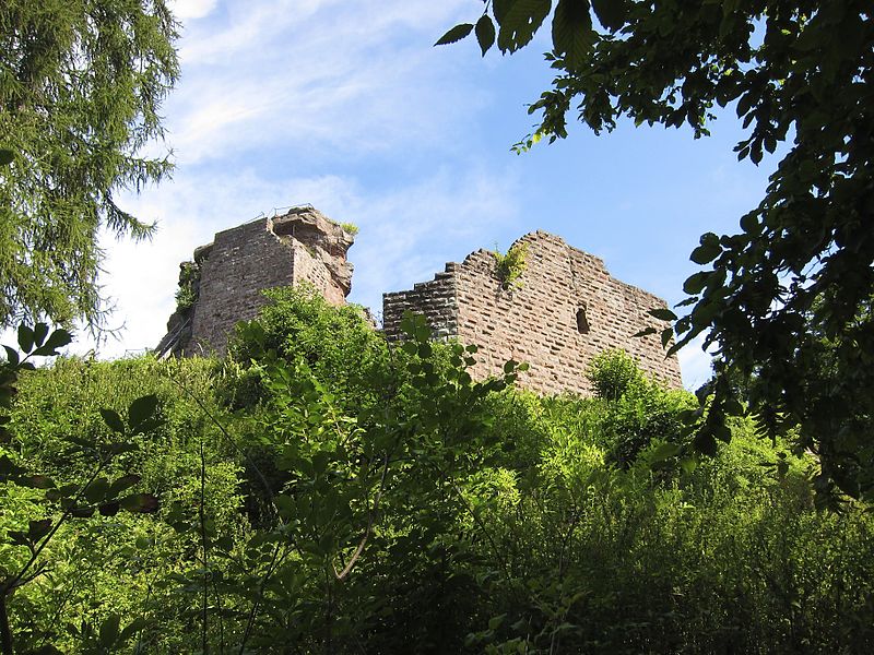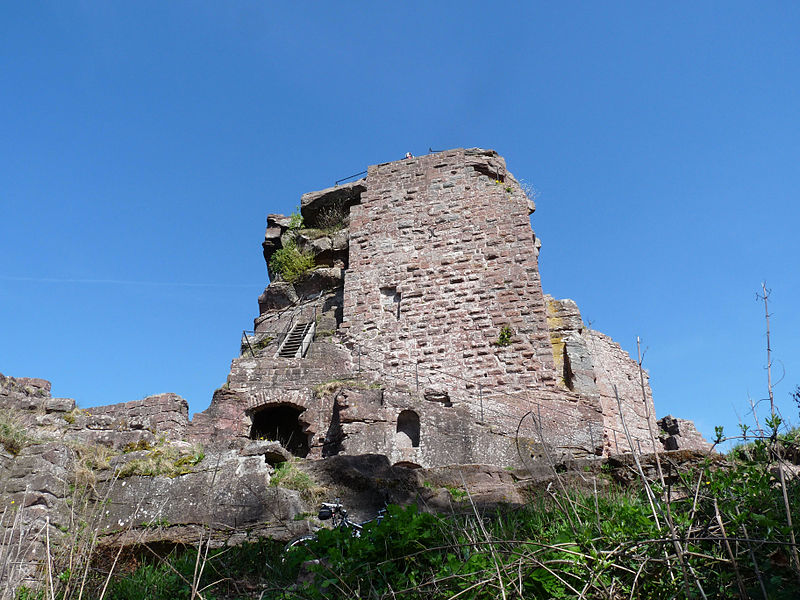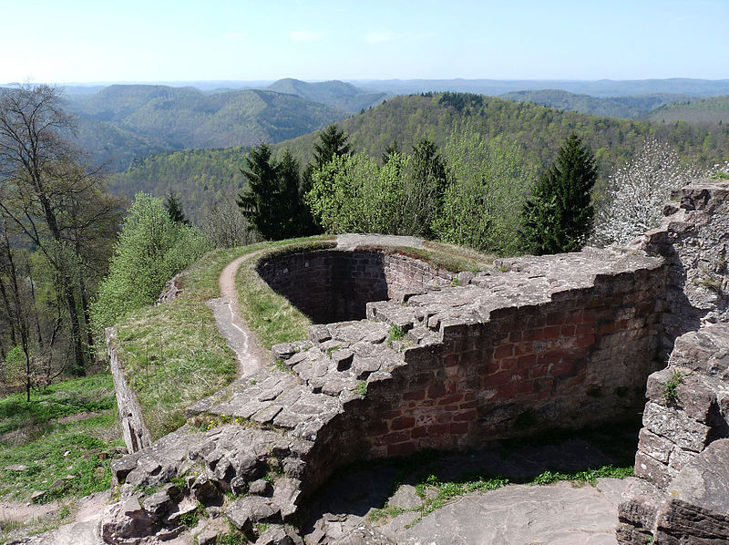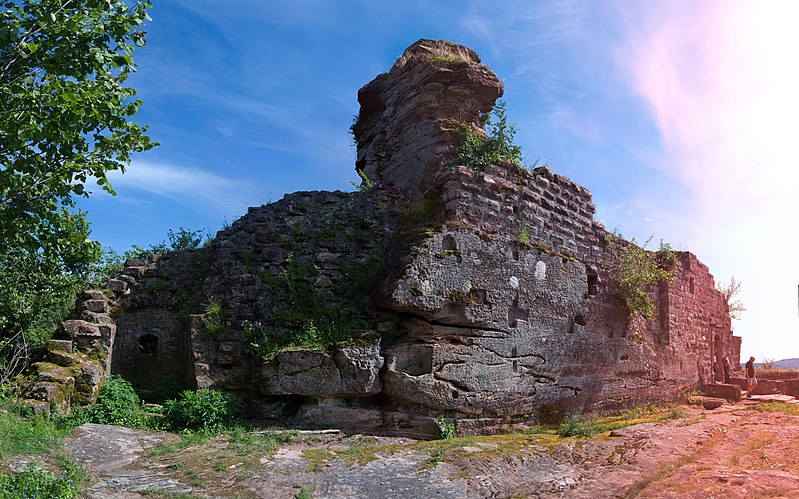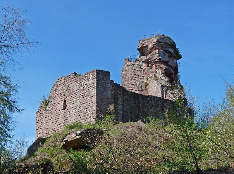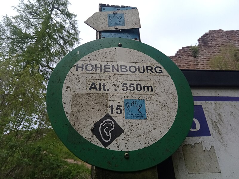 Le château de Hohenbourg se situe dans le Bas‑Rhin, sur la commune de Wingen (au nord de Lembach), à ne pas confondre avec Wingen‑sur‑Moder. Il est classé au titre des monuments historiques depuis décembre 1898. Ses origines restent incertaines : le château primitif daterait probablement de la fin du XIIe siècle, tandis que l’édifice semi‑troglodytique fut développé au milieu du XIIIe siècle. Les premiers occupants connus sont les Puller, issus des Fleckenstein, apparus en 1236 et se disant Puller de Hohenbourg à partir de 1262 ; certaines seigneuries étaient partagées avec la famille de Fleckenstein, entraînant des rivalités. Parmi les vestiges anciens subsistent des tronçons du mur d’enceinte, la partie inférieure excavée du logis nord (actuel dépôt lapidaire), une pièce creusée dans le rocher pourvue d’une porte en plein cintre, et le puits. Le château fut modernisé entre 1420 et 1440 par Wirich II le vieux. Après la mort du dernier Puller de Hohenbourg en 1482, il passa par héritage aux Sickingen. Au début du XVIe siècle, François de Sickingen le modernisa et fit construire des barbacanes ; le château fut partiellement détruit en 1523 puis relevé en 1542 par François Conrad de Sickingen, et la porte de la tourelle porte la date de 1578. Abandonné pendant la guerre de Trente Ans, il fut détruit par Montclar en 1680. Lors de travaux en 1879‑1880, de nombreux éléments sculptés gothiques et Renaissance portant millésimes et armes des Sickingen furent mis au jour et exposés ; ils ont en grande partie été volés mais sont partiellement visibles sur des photographies anciennes. Sur le plan architectural, le bastion d’artillerie en fer à cheval, percé de deux grandes portes et de deux bouches à feu, présente des murs épais de 3,60 à 4,60 mètres et illustre l’art militaire de la fin du XVe et du début du XVIe siècle. De la même période subsiste une porte de style Renaissance. Depuis la terrasse, le panorama s’étend sur les Vosges du Nord et le Palatinat. Pour accéder au site depuis Lembach, emprunter la route de Bitche puis la route de la frontière et la route forestière jusqu’au Gimbelhof, puis suivre le sentier du Club vosgien balisé de pastilles blanches cerclées de rouge.