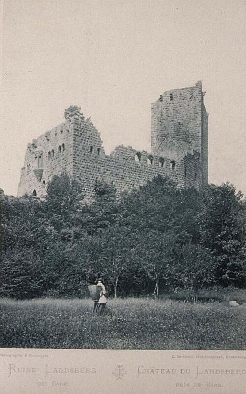 Le château du Landsberg, situé sur la commune de Heiligenstein dans le Bas-Rhin, s'élève sur un contrefort granitique à 580 m d'altitude, en contrebas du Mont Sainte-Odile et du Mur païen. Le terrain avait appartenu à l'abbaye de Niedersmunster avant que Conrad de Vienhege, chevalier, n'y fasse édifier le château entre 1197 et 1200 et n'en prenne le nom. Une charte de 1200, signée notamment par Otton de Bourgogne, atteste de l'existence du domaine et de ses dépendances, parmi lesquelles une carrière de pierre et une fosse à calcaire. Vers 1235, le site est agrandi au nord-ouest par un nouveau château doté d'une courtine flanquée de deux tours circulaires, de deux logis et d'une vaste basse-cour. Conçu pour contribuer à la défense des abbayes de Hohenbourg (Mont Sainte-Odile), Niedermunster, Truttenhausen et Andlau, le Landsberg se compose de deux châteaux séparés par un fossé : le château dit "vieux" et le château dit "neuf". Le château vieux comprend un donjon quadrangulaire protégeant un palais, tandis que le château neuf, de plan carré, comporte trois courtines, deux tours rondes d'angle percées d'archères et deux logis. Vers la fin du troisième quart du XVe siècle, le complexe délabré est remanié, étendu vers le sud-est et adapté à l'usage des armes à feu, ce qui entraîne l'unification des deux ensembles. Sur la façade est du palais du vieux château, un oriel daté du XIIe siècle abrite le chœur de la chapelle castrale et présente une ouverture cruciforme ; ce chœur était décoré de peintures murales, dont un Christ bénissant entouré d'anges protégeant symboliquement l'entrée. Le château appartient à la famille de Turckheim depuis 1808 et fait l'objet d'un classement au titre des monuments historiques depuis octobre 1965.