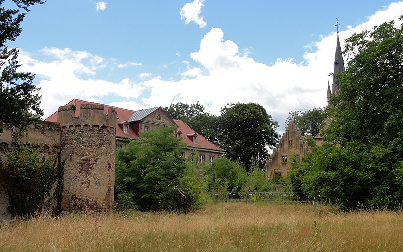 Le château sur l'assiette historique de son terrain en totalité, dont les éléments suivants : le donjon avec les tours Landsberg et de la glacière, son rempart, y compris les substructions et les murs arasés ainsi que tous les éléments lapidaires remployés y compris la colonne torse armoriée et la vasque conchoïdale entre donjon et grand logis seigneurial ; le tertre situé dans le parc au nord-est du donjon ; le grand logis y compris ses parties intérieurs ; l'ancien logis seigneurial dont la tour des Cigognes avec son escalier et son avant-corps et le bâtiment à pignons à redents adossé y compris la porte métallique Renaissance du premier niveau de la tour et tous les éléments lapidaires remployés ; la fontaine circulaire et le puits situés dans la cour ; les bâtiment des communs ; la chapelle funéraire à l'extrémité nord-est du domaine en totalité ; la clôture du domaine et son portail néo-gothique y compris le ponceau et les fragments de rempart subsistant sur le périmètre du domaine (cad. 01 84, 85, 87 à 92, 150, 94, 93, 186 188, 190, 192, 194, 196, 158) : inscription par arrêté du 30 janvier 2008