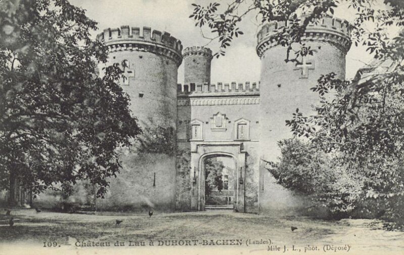 Le château du Lau, situé à Duhort-Bachen dans les Landes, est classé aux monuments historiques par arrêté du 2 avril 1997. Reconstruit au milieu du XVe siècle sur l'emplacement d'un castelnau médiéval, il a été édifié pour Antoine de Castelnau du Lau, chambellan de Louis XI. Antoine de Castelnau exerça d'importantes fonctions, notamment comme sénéchal de Guyenne, du Bazadais et des Lannes ; Louis XI le récompensa puis le disgracia en 1466. Le château, encore habité de nos jours par ses descendants, présente une architecture marquée par une influence flamande. À l'est se trouve un corps de logis en briques du XVe siècle flanqué de deux tours rondes crénelées. Au sud, une aile en retour d'équerre, issue de la fin du Moyen Âge, a été réaménagée au XIXe siècle, et à l'ouest le châtelet d'entrée, ouvrage défensif, a lui aussi été rhabillé au XIXe siècle. Ces éléments s'organisent autour d'une cour intérieure fermée au nord par un fossé en eau dont le tracé courbe épouse le contour d'une butte arasée, vestige possible d'une motte féodale. La façade s'ouvre sur huit fenêtres à meneaux en pierre finement moulurés dont les consoles sont sculptées de motifs animaliers et végétaux. La salle principale conserve un plafond à solives de chêne d'origine, quatre hautes fenêtres à croisée avec coussièges et une cheminée à hotte richement sculptée ; les pieds-droits sont surmontés de chapiteaux ornés de lions, les tambours prismatiques bordés de guirlandes ou de personnages. Le linteau porte deux frises de feuillages, fleurs, escargots et personnages traités avec humour ; entre elles se trouve un blason incliné, coiffé d'un cimier à lambrequin, qui portait sans doute les armes du premier propriétaire et est surmonté d'une clé sculptée représentant une femme battant son mari. Des notices et ressources consacrées au château figurent notamment dans la base Mérimée et sur plusieurs portails dédiés aux monuments historiques, aux châteaux et au Moyen Âge tardif.