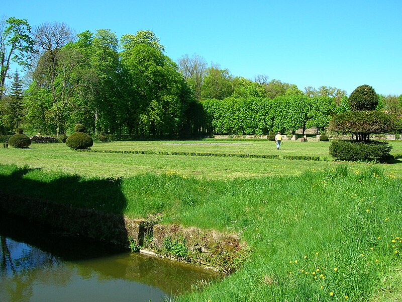 Le parc et les jardins complètent le site : une allée de tilleuls organisée en « marquise » conduit vers une perspective centrale qui s’achève sur une chambre de verdure offrant la vue sur la façade sud‑est ; la parcelle boisée renferme des arbres remarquables, tels que le noyer noir d’Amérique, le catalpa et le marronnier rose, et le jardin conserve des pièces d’eau notables.