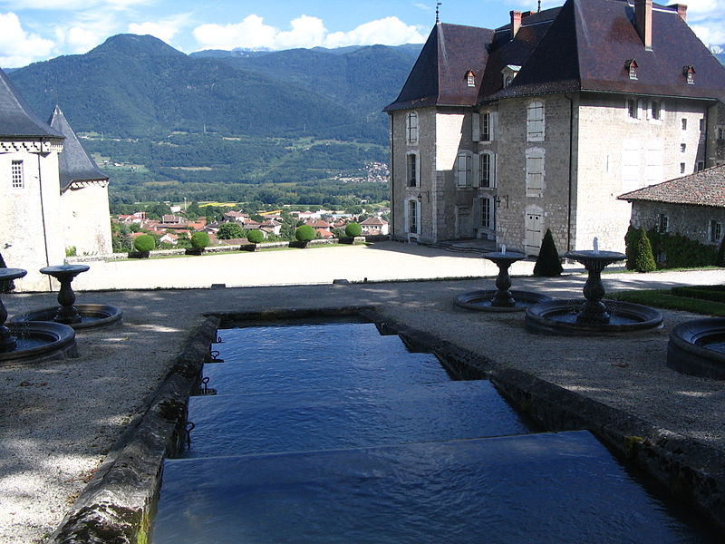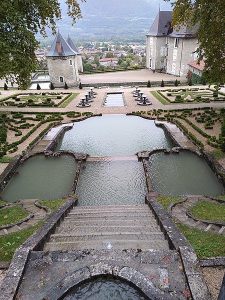 Le château du Touvet, ancien château fort du XIIIe siècle, se dresse sur la commune du Touvet dans la vallée du Grésivaudan, entre Grenoble et Chambéry, à la frontière historique entre le Dauphiné et le duché de Savoie. Construit par la famille d'Entremont, il ne conserve qu'un corps de logis qui, encore en 1963, portait le nom de château de Qinsonnas. Acquis en 1528 par Guigues Guiffrey, compagnon du chevalier Bayard, il appartient ensuite aux familles des Monteynard puis des Marcieu et reste habité par la même lignée depuis plus de cinq siècles. La disposition actuelle du château et de ses jardins doit l'essentiel des travaux de reconstruction entrepris au milieu du XVIIIe siècle par le comte Pierre de Marcieu ; des documents d'archives attestent l'ampleur des interventions menées entre 1753 et 1762. L'escalier d'eau, daté du troisième quart du XVIIIe siècle, a été conçu par le Sieur Potin et exécuté par le maître maçon Venture en 1759 ; Pierre de Marcieu fit également établir des cascades, des terrasses à la française et enrichir l'intérieur de décors et de mobilier aujourd'hui exposés. Avec le temps, l'influence du goût romantique et des parcs à l'anglaise altéra la rigoureuse composition classique des jardins ; les deux platanes encadrant l'escalier d'eau datent du XIXe siècle. Les escaliers d'eau ont été inscrits au titre des monuments historiques le 17 mars 1959, puis l'ensemble du château, y compris la décoration en cuir de Cordoue d'une salle, les vestiges des anciennes fortifications et le parc, a été classé le 16 novembre 1964. Propriété privée ouverte au public, le château appartient aujourd'hui à Bruno et Isabelle Pourroy de Lauberivière de Quinsonas-Oudinot, descendants du maréchal Oudinot et liés aux familles de Quinsonas et de Virieu. Les jardins à la française, conçus par Letellier et Potin et reconnus « jardins remarquables de France », alternent jeux d'eau et bassins avec parterres de buis. Restaurés de 1997 à 1999 sur la base des documents du XVIIIe siècle sous la direction de l'architecte en chef des Monuments Historiques et en liaison avec le propriétaire, les travaux se sont déroulés en trois phases : maçonnerie des escaliers d'eau du réservoir aux douves, création de huit bassins figurant sur le plan du XVIIIe siècle mais jamais réalisés auparavant, et reconstruction des parterres de broderie.