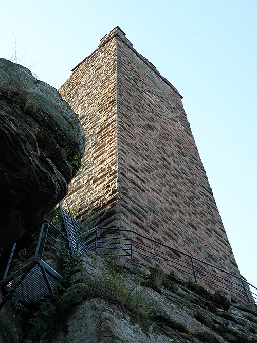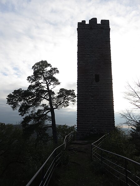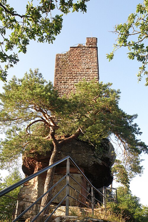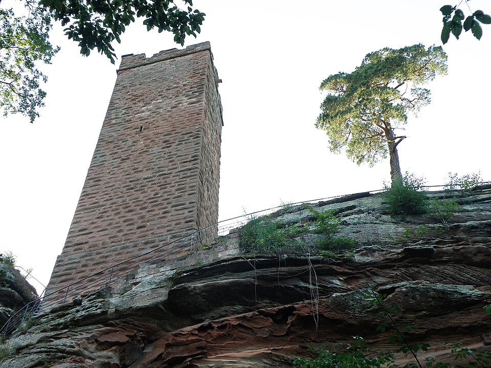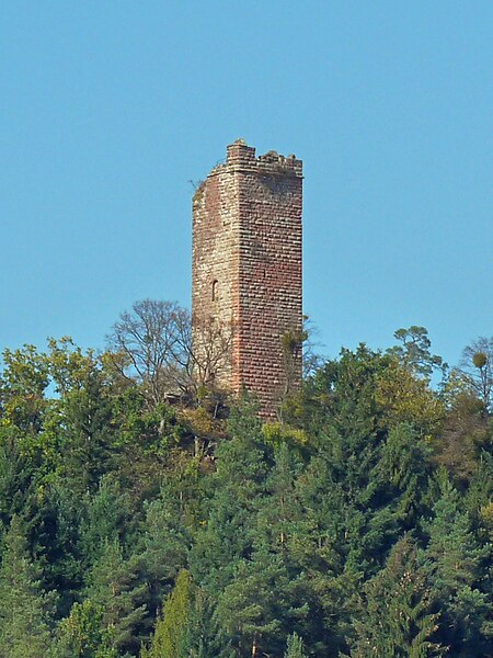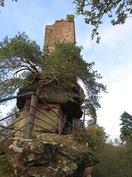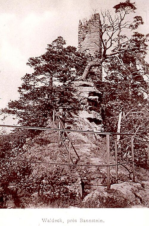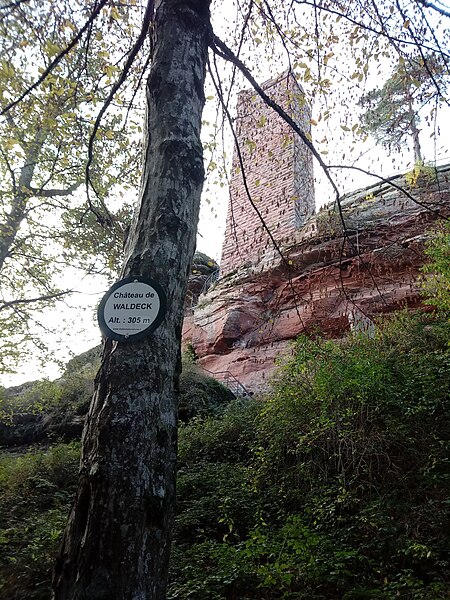 Le château de Waldeck est une ruine dominant l'écart de Waldeck, sur un éperon gréseux à l'ouest de l'écart et dans la commune d'Éguelshardt, en Moselle. On y accède par un sentier depuis l'étang de Waldeck, lui‑même rejoignable par l'écart de Bannstein et la RN62. Construit à la limite des XIIIe et XIVe siècles, le site occupe trois rochers et servait de poste d'observation pour contrôler la route entre l'Alsace, l'abbaye de Sturzelbronn et le Palatinat ; il est lié dans les sources aux Lichtenberg et au duc Ferry III de Lorraine. Les mentions anciennes le nomment Waldeske (1227), Waltecke/Waldecken (1337), Waleck (1490) et Valderken (1594). Au cours du Moyen Âge et de la période moderne, la seigneurie a successivement appartenu aux Limanges (Leiningen), aux Kirkel (descendants des Sarrewerden), aux Lichtenberg puis aux comtes de Deux‑Ponts‑Bitche ; en 1316 la moitié du château était aux Kirkel et une part fut donnée aux Lichtenberg, la famille de Kirkel s'éteignant en 1387. Après divers transferts, Frédéric de Deux‑Ponts‑Bitche devient unique propriétaire en 1443 ; en 1570 Jacques, dernier comte de Deux‑Ponts‑Bitche, meurt et Philippe V de Hanau‑Lichtenberg hérite du domaine. Un différend sur les obligations de vassalité conduit, en 1606, au rattachement de tout le comté de Bitche au duché de Lorraine et à la pose de bornes frontalières encore visibles aujourd'hui. La forteresse a été démantelée par les troupes françaises du maréchal de la Force en 1633. Un engagement militaire a de nouveau eu lieu le 26 mars 1761, lorsque les troupes de Nicolas d'Origny, régiment d'infanterie de Turpin, délogèrent un bataillon anglais ; la victoire coûta la vie au colonel d'Origny. Le château comprenait jusqu'au XIXe siècle deux hautes tours carrées : la tour nord fut détruite par la foudre au XIXe siècle, tandis que la tour sud, restaurée en 1900 par le Club Vosgien, est en appareil régulier de grès à bossages et a conservé son crénelage. Du côté est subsistent les vestiges de la basse‑cour et de son enceinte, accessibles à la base de la tour par une échelle mobile autrefois ; à l'extrémité nord de la plate‑forme une grande salle troglodyte à pilier central a été creusée dans le rocher, et l'on peut encore observer l'entrée de cette salle ainsi que la citerne. Du site la vue porte sur la vallée de l'Erbsenthal et l'étang de Hanau. Le château est classé au titre des monuments historiques depuis le 16 février 1930 ; l'accès aux ruines est interdit depuis 1999.