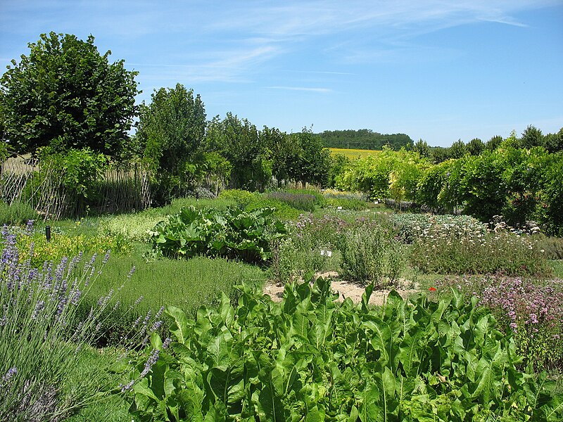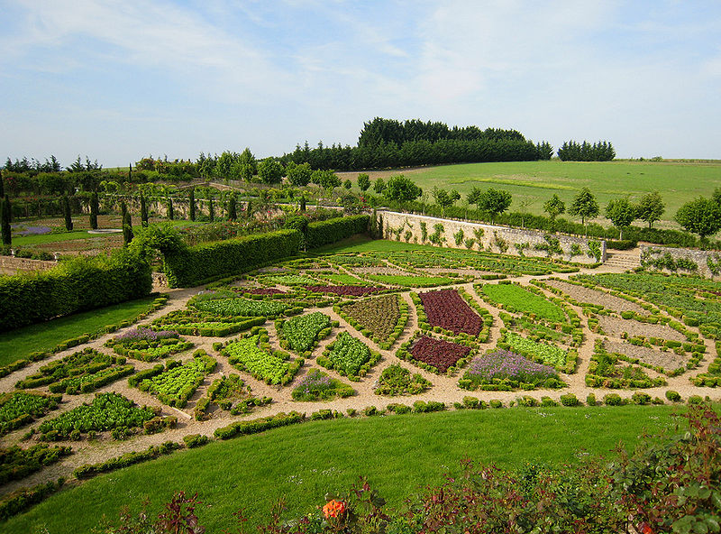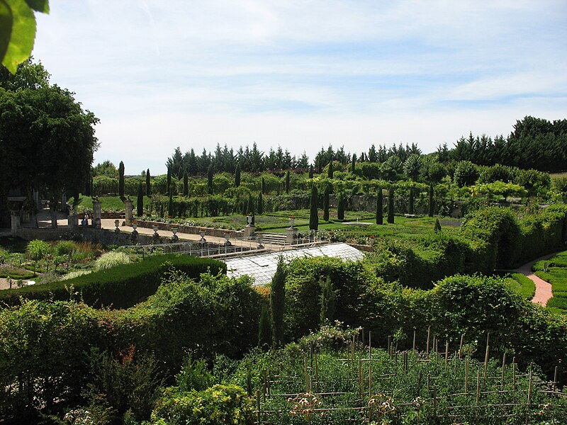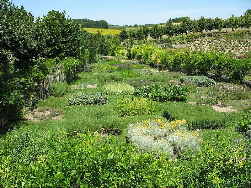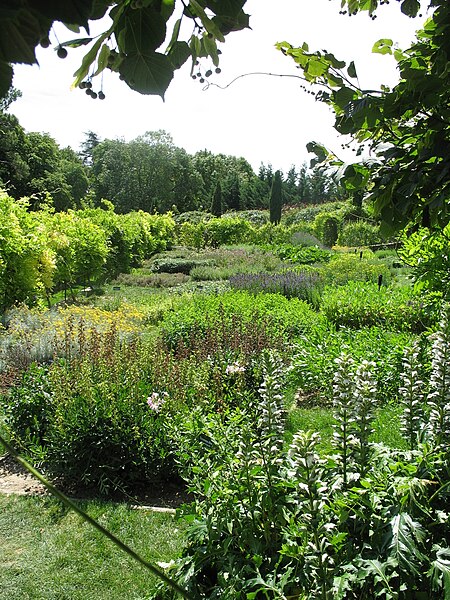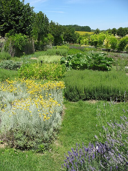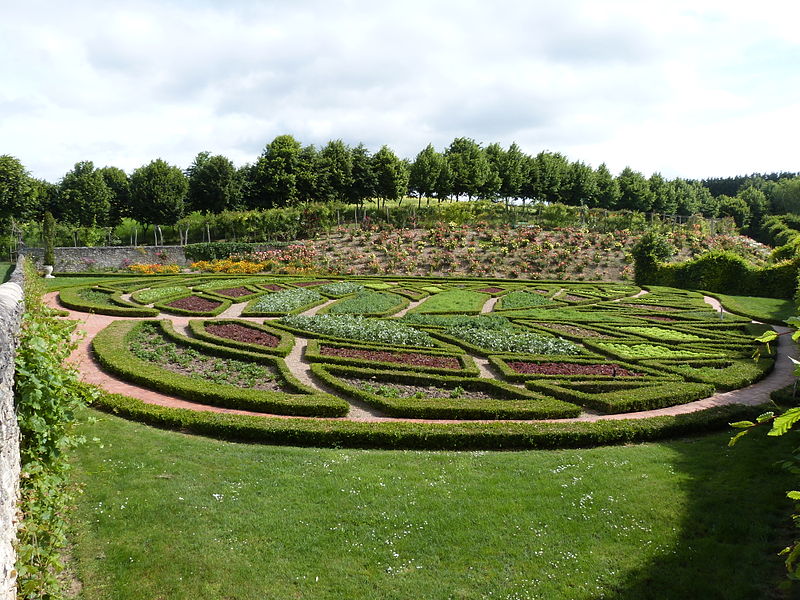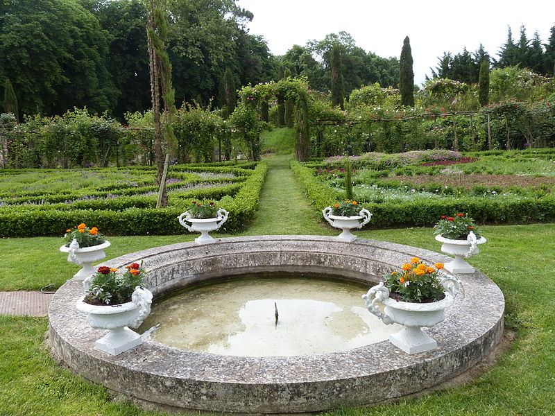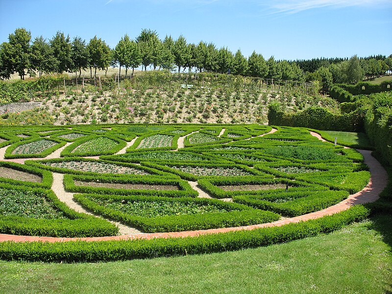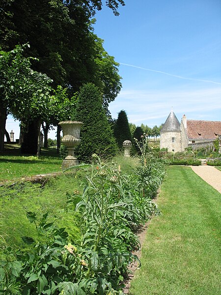 Au sud du manoir, le vallon de l'Élégance offre un salon de verdure sous de hauts tilleuls et des ifs en cône, orné de statues, de vases, de bosquets et de points de vue ; ses glacières, labyrinthes et parterres alternent au fil des saisons — narcisses en mars, tulipes en avril, roses en mai, dahlias en été et un million de cyclamens en automne — et une aquarelle de 1933 représente la façade avec une terrasse créée en 1893, supprimée en 2009. À l'abri d'un coteau planté d'un millier de rosiers couleur de feu, le Jardin de l'Abondance révèle un potager organisé entre buis taillés, où fraises, poireaux, aubergines, basilic, ciboulette, persil, tomates, céleris, choux, blettes et poivrons s'inscrivent dans un dessin en feuille de rosier. À l'aplomb, le Jardin de l'Intelligence, jardin à la française, est encadré de pergolas couvertes de roses rouges et de clématites bleues et présente quatre carrés bleus et rouges animés d'arabesques. Entouré d'un cloître aux arcades bordées d'osier vivant, le Jardin des Sciences se compose d'un damier de quatre‑vingt carreaux alternant gazon et plantes aromatiques médicinales employées au Moyen Âge.