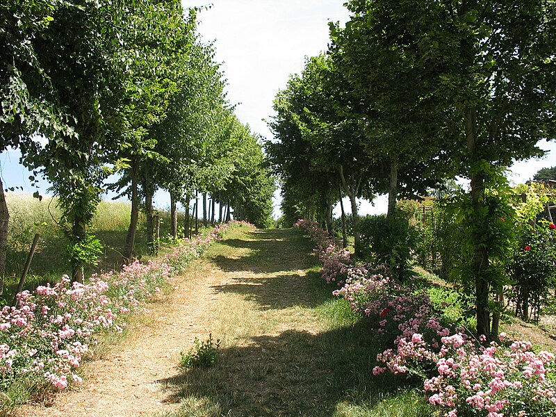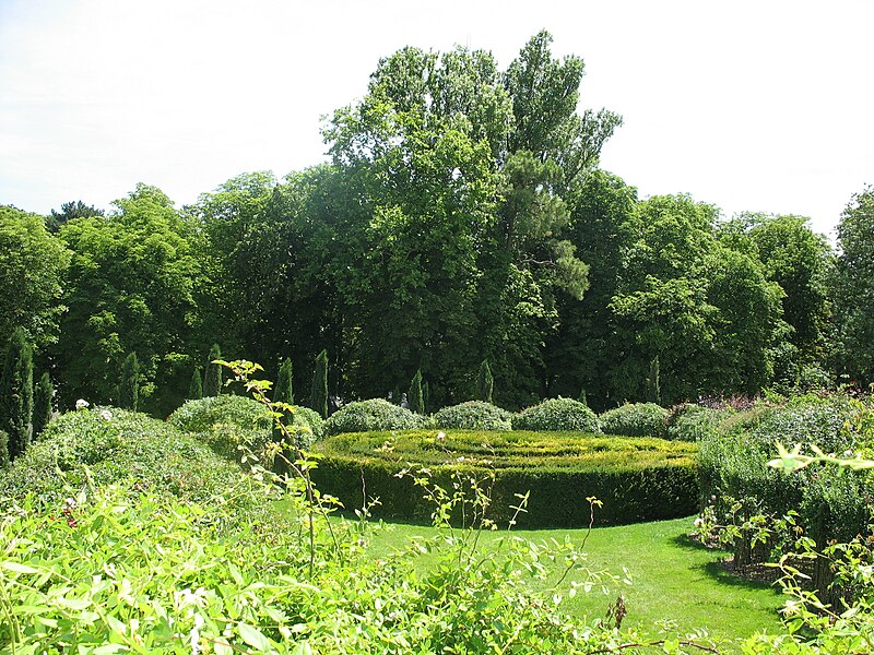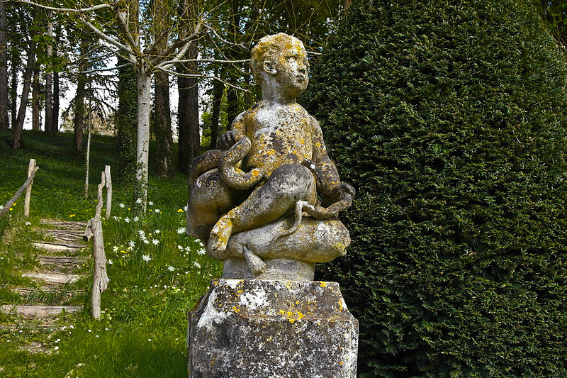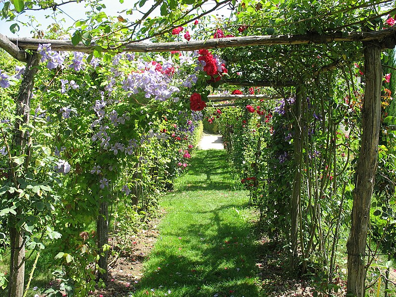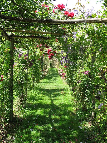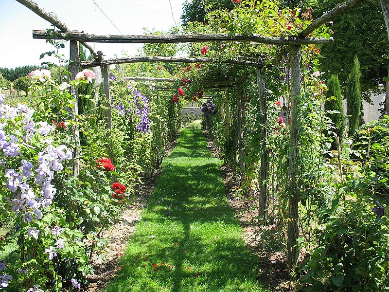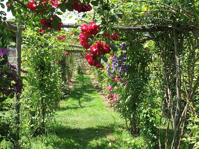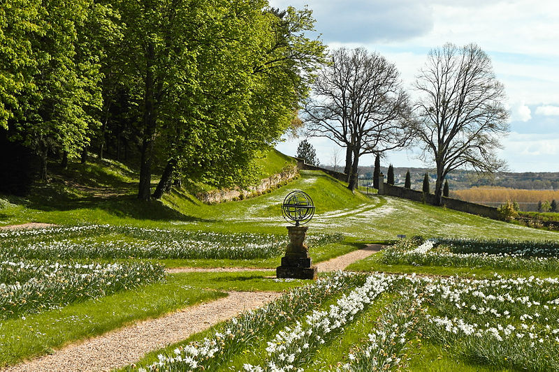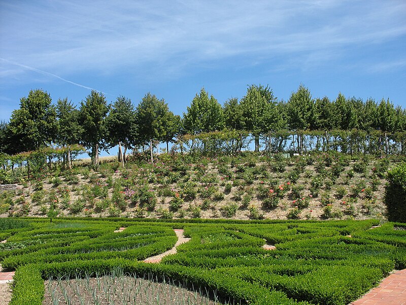 Au sud du manoir, le vallon de l'Élégance offre un salon de verdure sous de hauts tilleuls et des ifs en cône, orné de statues, de vases, de bosquets et de points de vue ; ses glacières, labyrinthes et parterres alternent au fil des saisons — narcisses en mars, tulipes en avril, roses en mai, dahlias en été et un million de cyclamens en automne — et une aquarelle de 1933 représente la façade avec une terrasse créée en 1893, supprimée en 2009. À l'abri d'un coteau planté d'un millier de rosiers couleur de feu, le Jardin de l'Abondance révèle un potager organisé entre buis taillés, où fraises, poireaux, aubergines, basilic, ciboulette, persil, tomates, céleris, choux, blettes et poivrons s'inscrivent dans un dessin en feuille de rosier. À l'aplomb, le Jardin de l'Intelligence, jardin à la française, est encadré de pergolas couvertes de roses rouges et de clématites bleues et présente quatre carrés bleus et rouges animés d'arabesques. Entouré d'un cloître aux arcades bordées d'osier vivant, le Jardin des Sciences se compose d'un damier de quatre‑vingt carreaux alternant gazon et plantes aromatiques médicinales employées au Moyen Âge.