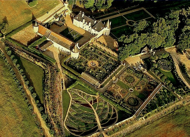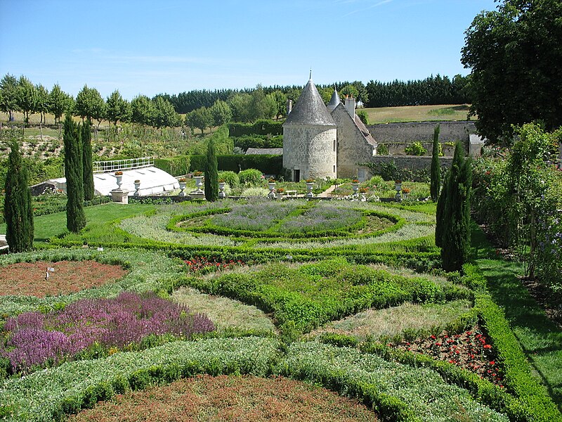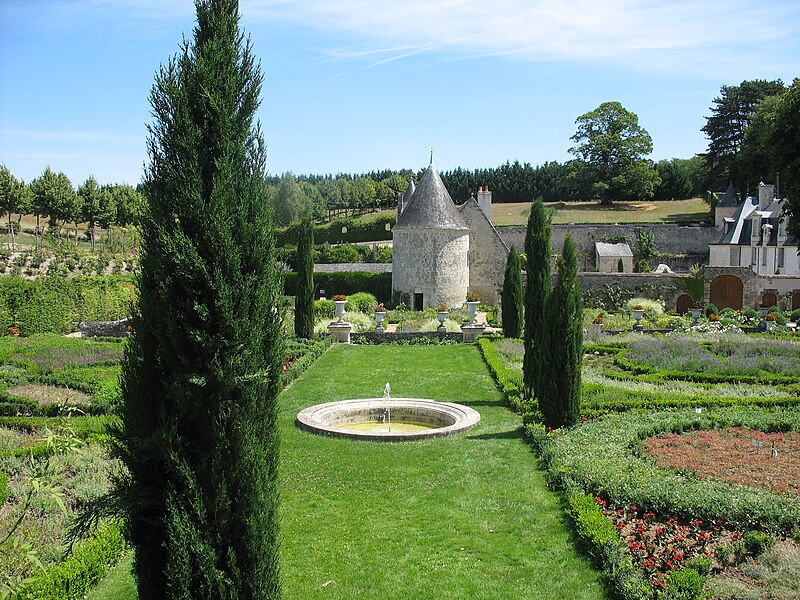 Au cœur de l'ensemble, le Jardin du Silence, structuré par des cyprès, des carrés de gazon et de buis ornés de vases, conserve un vieux puits et un colombier et présente un caractère à la fois gracieux et sévère. À l'ouest, au pied des tours médiévales, le Jardin des Sens, centré sur un bassin, reprend l'exubérance des mixed borders anglais au sein d'un dessin de buis ; ses massifs concentriques de vivaces et ses rosiers tiges sollicitent la vue, l'ouïe, l'odorat, le toucher et le goût. Le Jardin de la France, qui recouvre collines et mamelons, rend hommage à la Touraine par un vaste espace sauvage où six hectares de coquelicots et de bleuets forment des vagues mouvantes, alternant selon les saisons avec des cosmos. Enroulé autour d'une tour médiévale et inséré dans des murs de laurier, le Théâtre de l'Impertinence accueille gradins de gazon et tomettes rouges et évoque la tradition des théâtres de verdure. Enfin, l'Allée de la Chance ceinture les jardins d'ornement : dessinée en équerre et plantée de tilleuls parfumés, elle suit le mouvement pentu des mamelons.