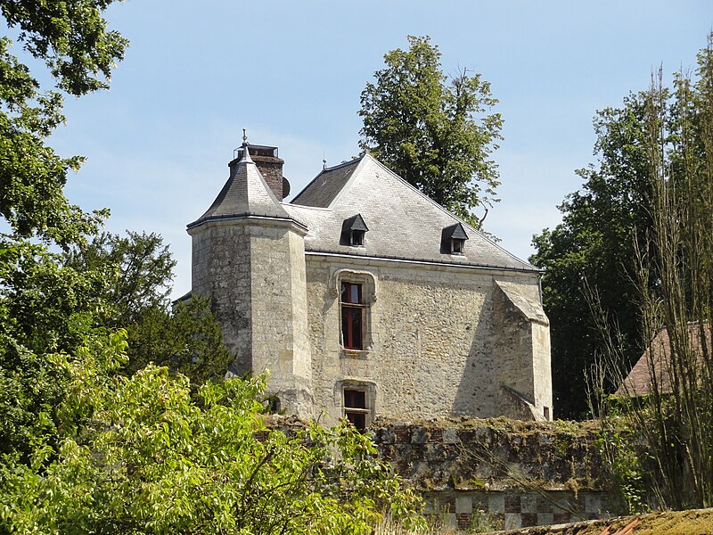 Le château et le pigeonnier en face de l'entrée se situent dans la commune d'Arthies, dans le Val-d'Oise en Île-de-France, à la sortie du village en direction de Mantes-la-Jolie. La partie la plus ancienne est une maison forte de trois étages, édifiée vers 1430 par le seigneur local appartenant à la famille de Théméricourt. À gauche de la façade donnant sur la cour se dresse une tour, d'abord pentagonale puis octogonale, qui abrite l'escalier desservant les différents niveaux. Le manoir conserve, à droite de cette tour, une série de trois fenêtres à meneaux superposées. À la fin du XVe siècle, la seigneurie est vendue à la famille de Silly de La Roche-Guyon, qui y installe un capitaine et un intendant jusqu'à la fin de l'Ancien Régime. Sous les Silly, au XVIe siècle, sont construits la muraille d'enceinte avec sa porte fortifiée flanquée de deux courtes tours, ainsi que le pigeonnier octogonal. Ces éléments présentent une façade en damier de pierre de taille et de briques rouges, caractéristique de l'influence de l'architecture normande. Les briques, de 4 cm d'épaisseur et de 17 cm de long, ont été cuites dans un four mis au jour en 1898 à 15 mètres du château. Les murs étaient à l'origine surmontés d'un crénelage, propre aux constructions militaires médiévales. Le pigeonnier conserve en son intérieur des boulins en brique, et sur la façade un larmier destiné à empêcher rats et belettes d'accéder à la lucarne en bâtière. Le château a été le lieu d'un affrontement entre un corps franc et des soldats allemands en août 1944. Il est inscrit au titre des monuments historiques par arrêté du 27 janvier 1948.