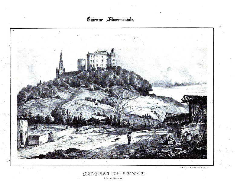 Le château de Buzet-sur-Baïse, implanté sur une assise dont des substructures pourraient remonter au XIe siècle, présente un plan rectangulaire flanqué de deux tours rondes à l’est et à l’ouest et d’une tour hexagonale sur la façade qui abrite un escalier à vis. Les premières mentions du site apparaissent dans des chartes liées aux comtes de Gascogne, et le comte Sanche y aurait fait fortifier une demeure antérieure, établissement probable de l’édifice primitif. Au Moyen Âge le site connut une co‑seigneurie et, jusqu’au XIIIe siècle, deux châteaux se faisaient face ; l’un d’eux ne subsiste aujourd’hui que par une tour isolée. En 1293-1294, les deux châteaux furent pillés et incendiés par les Anglais ; l’ensemble fut reconstruit puis remanié aux XVe et XVIe siècles, avec des aménagements poursuivis durant les siècles suivants. Au XVIe siècle la famille de Grossolles fit du château sa résidence principale : plusieurs éléments, dont une tour octogonale avec bel escalier, témoignent de travaux de cette époque, et Philippe Araguas et Nicolas Fauchère ont émis l’hypothèse d’une reconstruction pour les Grossolles, peut‑être par Georges d’Hozières. Le château reçut la visite du roi Charles IX le 1er août 1565. À l’intérieur, les chambres orientales et occidentales conservent des plafonds peints à la française du XVIIe siècle, et d’autres traces de peinture subsistent en divers lieux. Le parc, aménagé progressivement à partir du XVIIIe siècle et transformé en jardin « anglo‑chinois » puis en jardin à l’anglaise, s’étend au sud et en avant du château ; il conserve une haute tour ronde, vestige de l’ancien château fort, ainsi que des « fabriques » — petit pavillon en ruine, grottes artificielles, crypte Saint‑Joseph — et les tracés d’allées. Le bourg castral du Haut‑Buzet fut largement démantelé pour faire place à ces aménagements, dont certains furent confiés à des artisans et architectes parisiens sous Agésilas Joseph de Grossolles. L’ancienne église paroissiale, datée des XIIIe et XVIe siècles, et la vieille tour constituent les principaux vestiges du bourg médiéval ; l’église fut transformée en temple de la Raison pendant la Révolution, victime d’un effondrement de voûte en 1849, puis définitivement fermée et vendue, la paroisse trouvant ensuite sa place dans une nouvelle église construite au XIXe siècle. Aux XVIIIe et XIXe siècles, les propriétaires successifs modernisèrent le château et le parc : extensions, aménagements intérieurs et transformation de l’église en chapelle privée figurent parmi ces interventions, l’architecte Duphot étant notamment impliqué pour une aile orientale. Au XIXe siècle le château connut une fréquentation mondaine, notamment sous la famille de Beaumont, qui y reçut des contemporains comme George Sand. Après des périodes d’abandon et de troubles révolutionnaires, le domaine fut vendu aux frères Kröss en 1931 ; pendant la Seconde Guerre mondiale il accueillit des réfugiés et, en 1944, fut occupé temporairement par une unité allemande. Mis sous séquestre de 1944 à 1951, le château subit pillages et dégradations, puis des campagnes de sauvegarde eurent lieu dans les années 1960, sans empêcher un incendie criminel en 1969 qui détruisit l’aile Est. En 1972 des habitants rachetèrent la propriété et démolirent les ailes des XVIIIe et XIXe siècles, y compris la chapelle qu’elles recouvraient ; des travaux de restauration furent entrepris ensuite par des propriétaires privés dans les années 1980 et 1990. Le château et certains de ses éléments (façades, toitures, communs, tour du parc, vestiges architecturaux et portique) ont été inscrits au titre des monuments historiques en 1989, et les plafonds peints des chambres du premier étage ont été classés en 1991. Après une mise en vente en 2014, le domaine de douze hectares a été acquis en 2018 par la Cave des vignerons de Buzet.