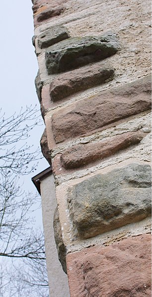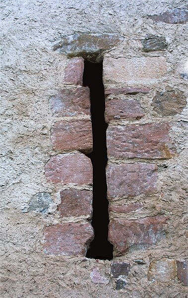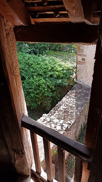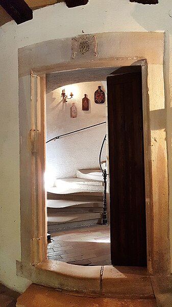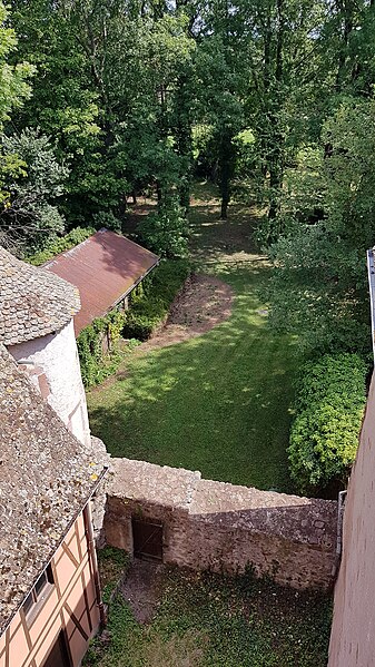 L'entrée principale est une porte en plein cintre inscrite dans un encadrement rectangulaire préparé pour un pont-levis en position haute, sans herse, et une porte datée de 1562 donne directement sur l'escalier en vis de la tourelle ; la charpente a été reconstruite après les bombardements de la Première Guerre mondiale. Un évier en pierre, fixé sur la tablette extérieure d'une fenêtre, permettait d'évacuer les eaux usées vers les douves. Des marques de pose gravées sur les pierres attestent la présence et le décompte des tailleurs de pierre ayant travaillé sur le chantier. Une porte cochère, adjonction du XVIIIe siècle, permettait l'accès des véhicules.
