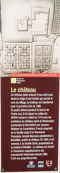 Le château de Hartmannswiller, situé à la périphérie nord du village près de l'église, est un ancien fief de l'évêché de Bâle. Il est mentionné dès 1308, année où Dietrich de Haus le céda à l'Église de Bâle qui le remit en fief la même année, et des membres de la famille liée au village apparaissent dans des actes de 1288 et du début du XIVe siècle. Frédéric, évêque de Bâle, donna le fief castral à Hermann V de Waldner, investiture qui fut renouvelée au milieu du XVe siècle et à nouveau en 1476 en faveur de membres de la famille Waldner. Partiellement détruit pendant la guerre de Trente Ans, le château fut réparé au XVIIe siècle et rebâti par la suite par Chrétien Charles-Philippe de Waldner, qui utilisa en 1718 des matériaux provenant du château ruiné de Weckenthal à Berrwiller avec l'autorisation de l'évêque de Bâle. Il resta dans la branche des Waldner de Freundstein jusqu'à la Révolution, puis passa au XIXe siècle entre les mains de l'horticulteur Joseph Baumann de Bollwiller, avant d'être acquis par Constant Zeller, industriel de la tuilerie d'Ollwiller, qui transforma le lieu en centre de rencontres intellectuelles. La tuilerie de Zeller développa une production de tuyaux en argile bénéficiant d'un vernis propre à son procédé, ce qui lui valut des distinctions et un important développement industriel au XIXe siècle. Pendant la Première Guerre mondiale, le village subit d'importants tirs d'artillerie ; en raison de la proximité du front du Hartmannswillerkopf, les habitants furent évacués en juin 1940 et la commune occupée par les troupes allemandes, trente-deux jeunes gens y furent incorporés de force dans la Wehrmacht, dont onze ne revinrent pas. Le château, resté intact durant cette période, servit de lieu de refuge pour les habitants.