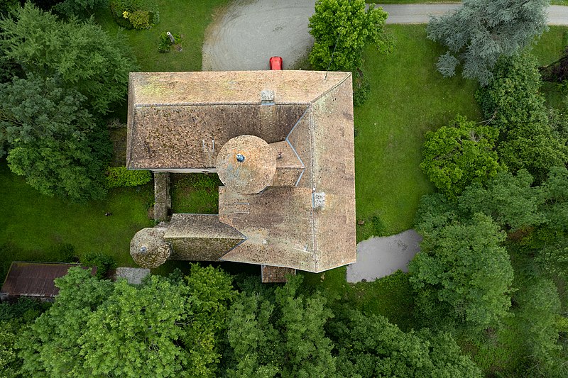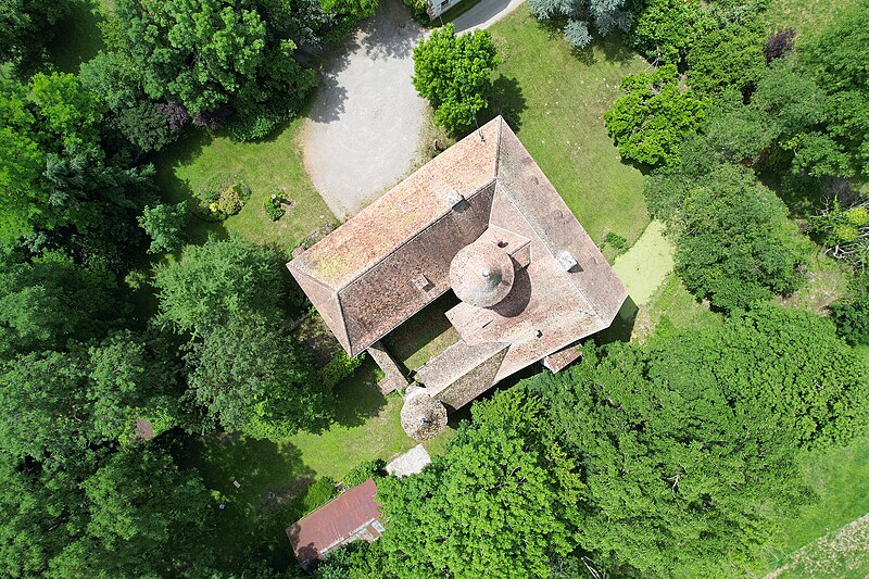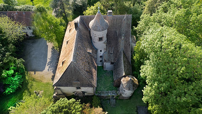 Façades et toitures, à l'exception des ajouts sur les façades nord et est ; vestibule, cave, petit escalier en vis, assise du pressoir dans le garage, ancienne chapelle présumée voûtée d'arêtes, tourelle avec l'escalier en vis principal, plafond à caissons dans la pièce à l'angle sud-ouest du second étage (cad. 1 34) : inscription par arrêté du 9 mai 1988