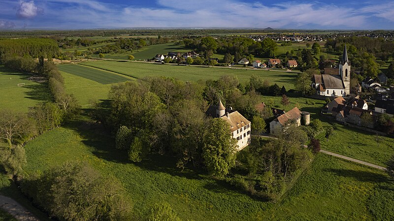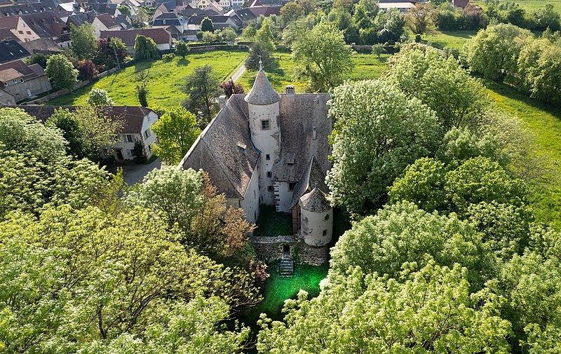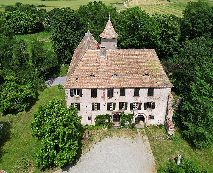 L'édifice actuel présente un grand logis en équerre dont une partie pourrait remonter au XIVe siècle ; on note particulièrement des pierres d'angle à bossages et, à l'intérieur, une tourelle d'escalier circulaire dont l'entrée porte la date de 1562. À l'angle sud-est subsistent les vestiges d'une tour carrée et, à l'angle nord-est, une tour en poivrière ; la plupart des fenêtres ont été repercées aux XVIIIe et XIXe siècles. Un plan de 1756 montre qu'une vaste basse-cour trapézoïdale flanquée de deux tours rondes précédait l'édifice au sud-ouest et que l'ensemble était entouré de larges fossés d'eau. Les bossages, hérités de l'Antiquité, donnent volontairement à la maçonnerie un aspect de solidité et ont une valeur symbolique dans l'architecture seigneuriale ; leur mise en œuvre est plus longue et plus coûteuse que celle d'un appareil lisse. La cave est voûtée en berceau, ses murs dépassent trois mètres d'épaisseur et elle est surélevée pour éviter les inondations. L'aile nord abrite une salle voûtée d'arêtes composée de quatre quartiers, classée monument historique et interprétée tantôt comme une ancienne chapelle, tantôt comme un chartrier médiéval, les deux types pouvant prendre la forme de salles voûtées résistantes aux incendies. Deux colonnes en grès adossées à un mur de refend soutiennent le poutrage de la pièce voisine.
