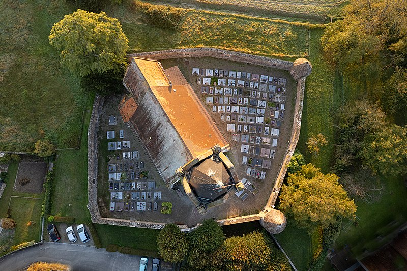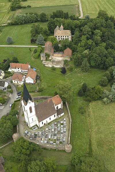 Le château de Weckenthal, incendié et ruiné après des transformations et des conflits, fournira des matériaux réutilisés pour la restauration de Hartmannswiller en 1718. Le cimetière fortifié de Hartmannswiller, l'un des deux seuls du département encore en bon état, a été érigé vers la fin du XVe siècle comme dernier refuge pour la population ; il forme un polygone irrégulier pourvu de trois tours de flanquement dont l'une a conservé sa hauteur primitive, l'une est partiellement démantelée et abrite un petit musée lapidaire, et la troisième n'est plus qu'un amorce de tour et une porte murée. L'enceinte, bâtie en grès rose provenant du Sandgrubenkopf, était entourée d'un large fossé aujourd'hui comblé, et la courtine a été partiellement démantelée au XIXe siècle pour raison de vétusté. Enfin, le domaine abrite des arbres remarquables plantés vers 1810 par les pépinières Baumann : deux cyprès chauves, un hêtre pourpre et un marronnier à fleurs doubles, tous âgés d'environ deux cents ans et présentant des circonférences supérieures à quatre mètres.