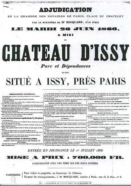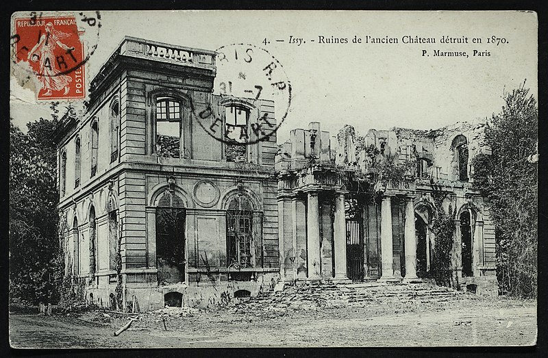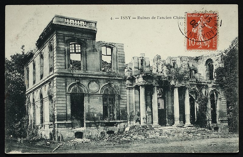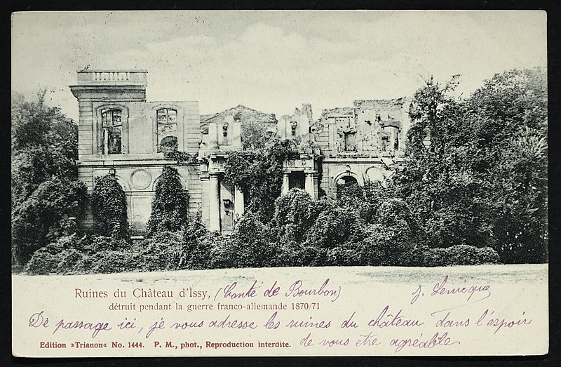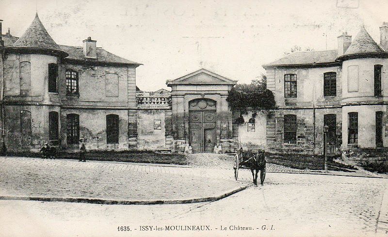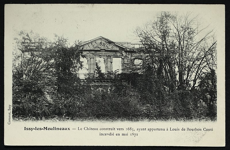 Le château d'Issy, aujourd'hui disparu, se trouvait sur le territoire de l'actuelle commune d'Issy-les-Moulineaux, dans les Hauts-de-Seine. Dès le XIIIe siècle l'emplacement était occupé par deux domaines principaux, le vieux château de Villepreux et le fief de Mérainviller. En 1606 la reine Margot se réfugia à Issy pour fuir la peste, acheta la maison de Jean de La Haye et donna au domaine le nom de « Petit Olympe ». Après la mort de la reine en 1615, la propriété resta en litige et fut vendue aux enchères en 1622 à M. de Choisy. Réuni à la châtellenie de Villepreux en 1660 par le financier Macé Bertrand de la Bazinière, le Petit Olympe devint une maison de plaisance. En 1681 Denis Talon acquit la parcelle et fit édifier un petit château par l’architecte Pierre Bullet ; il confia à André Le Nôtre et à Pierre Desgots l’aménagement des jardins et des fontaines. En 1699 le domaine fut acheté par François Louis de Bourbon, prince de Conti, qui entreprit d’importantes transformations, faisant notamment exécuter une façade à péristyle de colonnes doriques, une entrée en hémicycle et un pavillon des bains pour son fils. Sous la famille de Conti les jardins dessinés par Le Nôtre furent développés et le domaine atteignit son apogée, accueilli et décrit avec admiration par des contemporains. En 1716 la veuve du prince donna une fête brillante en l’honneur de la duchesse de Berry, mais après le drame familial de 1736 la fréquentation du château diminua. La propriété resta dans la maison de Conti jusqu’en 1776, lorsque Louis François Joseph de Bourbon-Conti décida de vendre ses biens à Issy. Entre 1776 et 1782 le château appartint à Adrien Jules Gaultier Designy, puis fut cédé à la princesse de Chimay. Pendant la Révolution la princesse fut arrêtée et exécutée en 1793 et le château fut confisqué comme bien national, amorçant le déclin du domaine. Acquis en mars 1809 par la famille du comte de l'Espine, l'ensemble connut des aménagements tels qu'un pigeonnier, une orangerie et un pavillon symétrique à l'hémicycle. En 1852 le docteur Léopold Wertheim y fonda un établissement d'hydrothérapie, puis le domaine fut racheté en 1857 par le Comptoir central de Crédit, qui lança une opération de lotissement en 1866. Pendant la guerre de 1870 le château fut occupé par des troupes françaises et le lieutenant-colonel commandant le régiment s'installa dans ses locaux ; le 4 mai 1871 les canonniers de la Commune mirent le feu au château, qui fut entièrement détruit et livré aux flammes. Les ruines restèrent à l'abandon plus de quarante ans avant une démolition partielle en 1910 ; le pavillon des bains fut démoli en mai 1939 et remplacé par un immeuble. Certains fragments sculptés et architecturaux furent rachetés par Auguste Rodin et remontés en 1907-1908 à sa villa des Brillants à Meudon, puis intégrés à un musée élevé entre 1929 et 1931 dont la façade reproduit celle du château d'Issy, une réplique figurant également au Rodin Museum de Philadelphie. Aujourd'hui ne subsistent que la moitié la plus récente de l'hémicycle d'entrée — qui abrite la galerie d'histoire du musée de la Ville d'Issy au sein du musée français de la carte à jouer —, l'orangerie, le colombier et une fontaine inscrite au titre des monuments historiques par arrêté du 8 mai 1933. Une partie du parc, acquise par la commune puis largement vendue en lots, a été transformée en parc municipal Henri-Barbusse, inauguré le 5 juillet 1936, où le bassin historique a été conservé.