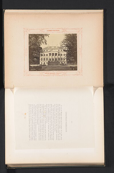 Le Château Margaux est un domaine viticole de la commune éponyme s’étendant sur 262 hectares en appellation Margaux, dans le Médoc bordelais, et classé « premier grand cru » lors de la classification de 1855. Les premières mentions remontent au XIIIe siècle sous le nom de « château de La Mothe Margaux ». Au début du XIXe siècle, l’ancien château fort fut démoli pour laisser place à l’édifice actuel, élevé sur les plans de Louis Combes et entouré d’un parc paysager comprenant d’importants chais. L’architecture est néo-palladienne : construction néoclassique sur quatre niveaux, larges baies et façade principale ornée d’un péristyle colossal de quatre colonnes ioniques surmonté d’un fronton triangulaire. Les chais, longs d’environ cent mètres et larges de vingt-trois mètres, présentent une charpente en chêne soutenue par des colonnes doriques. Le site est classé au titre des monuments historiques depuis 1946, classement confirmé par arrêté en 1965. En 2000, Paul Pontallier a créé au château un département de recherche et développement, intégré en 2015 au nouvel ensemble de bâtiments conçu par Lord Norman Foster, qui comprend un chai d’environ 800 m², une vinothèque souterraine et un centre d’accueil.