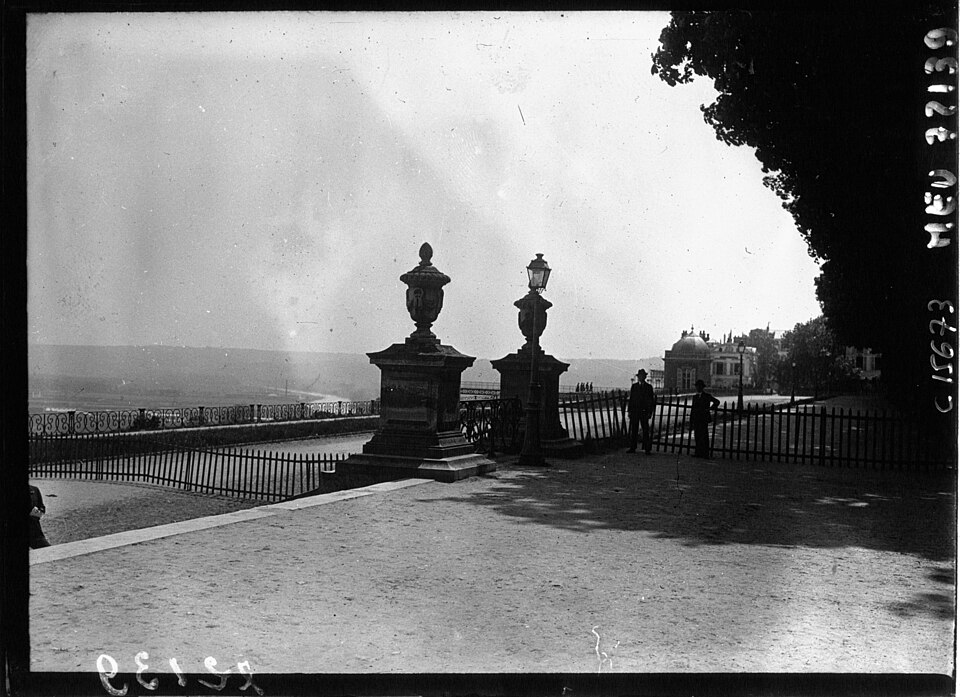 Le mur des Lions et la rampe des Grottes, avec les pavillons Henri IV et Sully, constituent les principaux vestiges du Château-Neuf et de ses jardins en terrasses. Le Château-Neuf a été créé à la fin du XVIe siècle sous Henri IV et fut pendant longtemps la résidence royale principale jusqu'à l'époque de Louis XIII. L'édifice initial a été engagé pour Henri II, le corps central étant élevé par Philibert de l'Orme entre 1557 et 1559, puis repris par Le Primatice et d'autres maîtres d'œuvre. Au début du XVIIe siècle, le château fut prolongé en équerre et enrichi de pavillons, dont ceux du roi et de la reine, ainsi que des pavillons Henri IV et Sully; les intérieurs reçurent des décors peints, notamment de Toussaint et de Simon Vouet. Henri IV fit agrandir la demeure et aménager des terrasses jusqu'à la Seine, avec des parterres et des jeux d'eau réalisés par des artisans tels que Tommaso Francini, sur des dessins d'Étienne Dupérac, et des plantations supervisées par Claude Mollet. Les grottes et leurs automates hydrauliques, disposées sous les terrasses, formaient un dispositif décoratif important, complété par statues et rocailles venues d'Italie. Les aménagements comprenaient cinq terrasses successives et des escaliers en hémicycle autour de la fontaine de Mercure. À partir de la seconde moitié du XVIIe siècle, l'entretien des jardins se dégrada; plusieurs structures et mécanismes hydrauliques furent endommagés et seules des restaurations partielles furent entreprises. Louis XIV délaissa le site au profit de Versailles et le Château-Neuf tomba en ruine. En 1777 Louis XVI céda le château au comte d'Artois, qui fit établir des projets de démolition et de reconstruction néo‑classique confiés à François‑Joseph Bélanger; l'ensemble fut finalement démoli et le projet ne vit pas le jour. Après la Révolution, le terrain fut loti et les matériaux vendus; il ne subsiste aujourd'hui que quelques pavillons, la terrasse et des murs de soutènement. Le pavillon de l'oratoire, dit pavillon Henri IV, fut acquis en 1837 par Barthélémy Plante, qui l'avait déjà restauré et agrandi; il passa ensuite à la Compagnie des chemins de fer de l'Ouest puis fut loué à divers restaurateurs et entrepreneurs. En 1895 la société Guerain‑Catelain prit le bail et réunit les deux hôtels voisins; c'est probablement à cette époque que l'aile la plus récente fut reconstruite. L'autre vestige important, le pavillon dit de la Reine et aujourd'hui appelé « Château Neuf », occupe l'emplacement de l'ancien pavillon de la reine et avait été flanqué de deux ailes avant 1820. Ce bâtiment, confisqué après la propriété du comte d'Artois, passa entre plusieurs mains avant d'être acquis en 1829 par le marquis de Blérancourt, qui l'agrandit et l'embellit. En 1884 Léopold Louis Dreyfus le loua avec promesse de vente, devenue effective en 1902; l'édifice fut ensuite remanié par l'architecte Sauvestre avant 1907. En 1952 Madame Louis Dreyfus aménagea l'étage en supprimant une pièce transformée en terrasse. La chapelle conserve un décor du XVIIe siècle assorti d'un sous‑décor du XIXe siècle. Le parc et le quartier conservent de nombreux vestiges des terrasses et des murs de soutènement du XVIIe siècle, ainsi que des éléments dispersés dans les caves et constructions voisines.