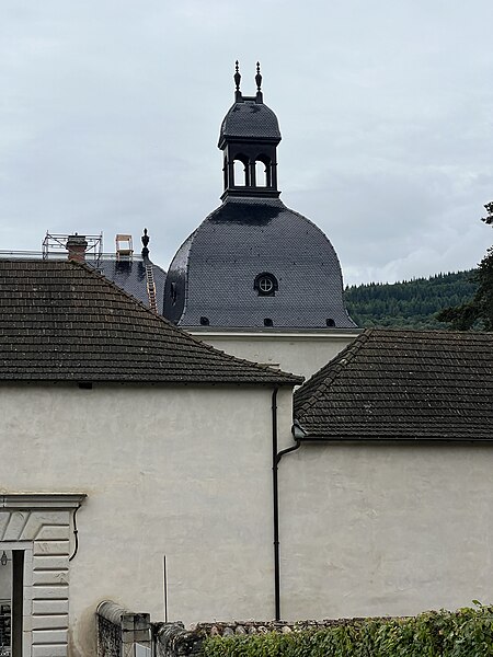 Le bâtiment principal, situé au bord du Rhône, est flanqué de quatre tours d'angle carrées; celles côté village sont coiffées de toits à l'impériale. Le domaine s'ouvre par un portail monumental, situé à côté de l'église, qui donne sur une allée pavée en têtes de chat; les bâtiments des communs s'intercalent entre les maisons du village et le château.