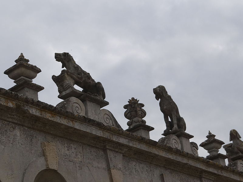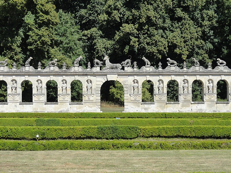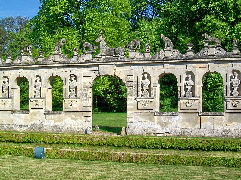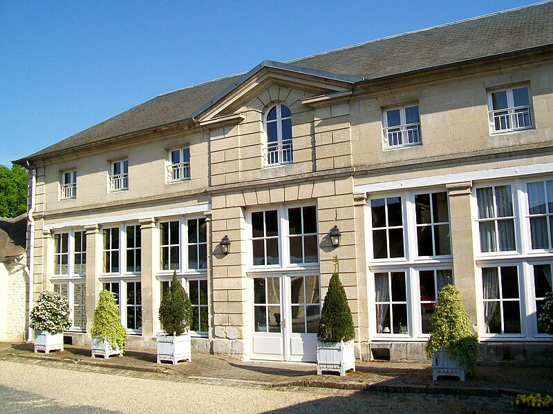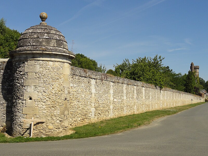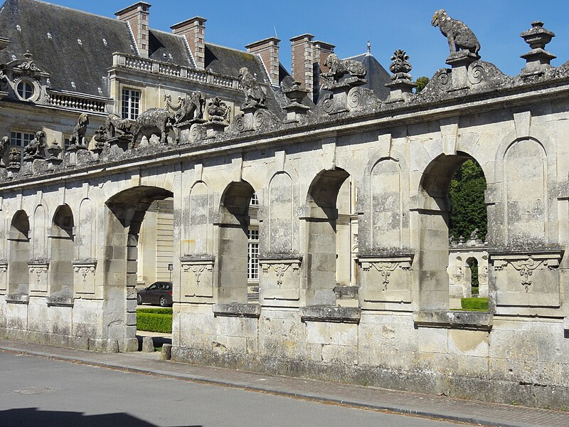 Le parc est clos par un mur d'enceinte daté de 1610-1620, ponctué de quatre tourelles et comportant la Porte rouge au nord, contemporaine des balustrades et remarquable pour ses vantaux peints de cette couleur. Cette porte, qui donne accès à la forêt et célébrait la chasse, porte un linteau surmonté d'une Diane assise entre deux lévriers et est soutenue par des pilastres évoquant des cariatides ; comme pour les haies, la porte aurait été déplacée, une carte de 1723 la situant à l'est du château. La Porte rouge, située sur le terrain du golf, n'est pas accessible au public ; deux des tourelles d'angle ouvrent toutefois sur la rue RD 26 en provenance de Senlis ; dépourvues de meurtrières, elles présentent de simples orifices et sont coiffées de toits en pierre en dôme ornés d'une boule. Le pignon des anciennes écuries, inscrit aux Monuments historiques avec le mur de clôture, se trouve rue Nicolas‑de‑Lancy, presque en face de l'église ; son échauguette en encorbellement est de plan rectangulaire. Dans la cour de service attenante, aujourd'hui parking du golf, subsiste un colombier rond qui n'est cependant pas protégé.