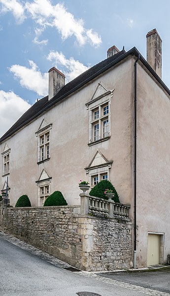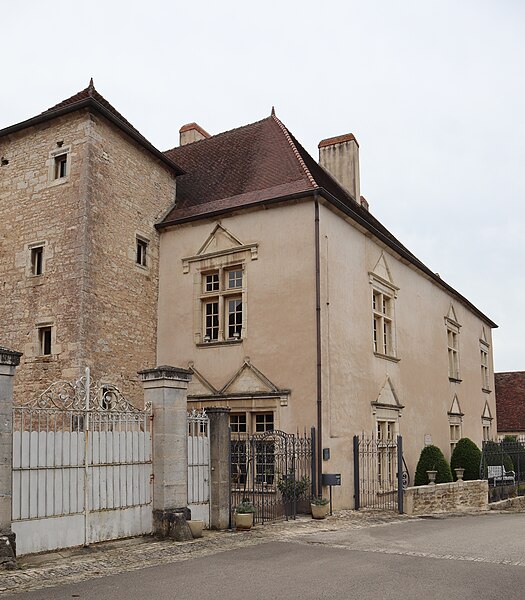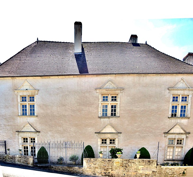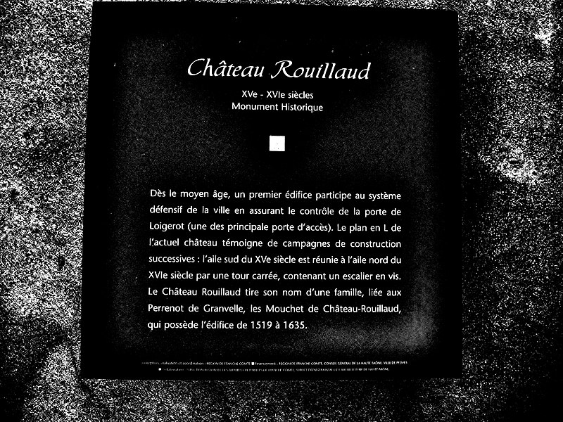 Le château Rouillaud se situe sur la commune de Pesmes, dans le département de la Haute-Saône. Son nom vient de la famille des Mouchet de Château-Rouillaud, liée aux Perrenot de Granvelle, qui posséda l’édifice de 1519 à 1635. Dès le Moyen Âge, une construction antérieure faisait partie de la seigneurie de Pesmes et assurait le contrôle de la porte de Loigerot ; ce premier édifice fut détruit au cours des guerres médiévales. L’actuel bâtiment présente un plan en L, résultat de campagnes de construction successives : l’aile sud date de la seconde moitié du XVe siècle, tandis que l’aile nord, sur la rue, appartient à la seconde moitié du XVIe siècle et aurait été réalisée vraisemblablement par Guyon Mouchet, époux d’Étiennette Perrenot de Granvelle. Les deux ailes sont reliées par une tour carrée qui abrite un escalier en vis. À la Révolution de 1789, le château fut vendu comme bien national et subit de nombreuses mutilations. Au XIXe siècle, l’ancien chais fut transformé en maison d’habitation. À partir de 1891, l’ensemble passa entre les mains d’un unique propriétaire qui entreprit des travaux de restauration. L’édifice a été inscrit au titre des monuments historiques en 1977.