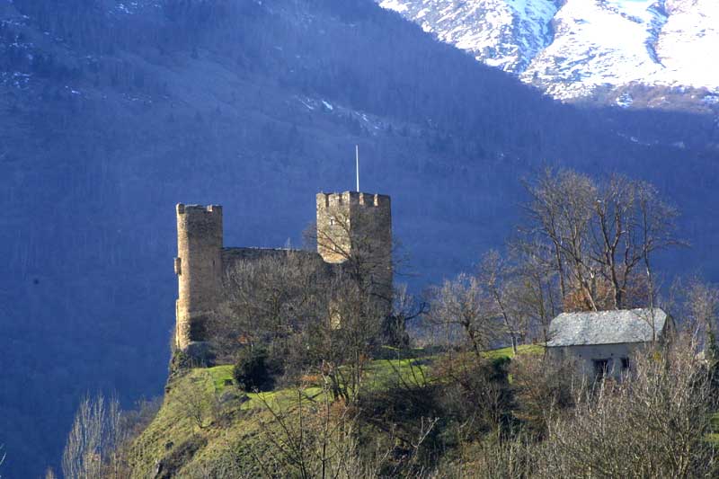Le château Sainte-Marie, en ruines, se situe dans les Hautes-Pyrénées, sur la commune d’Esterre, bien qu’il soit souvent associé à Luz-Saint-Sauveur. Perché sur un éperon rocheux, il a longtemps joué un rôle stratégique pour la protection de la vallée et a servi de refuge pour la population. La tradition attribue sa construction au Xe siècle au comte de Bigorre Centule III, mais son origine semble plus ancienne et il aurait été occupé par les Arabes. Au cours du XIVe siècle, il fut largement reconstruit et occupé par les Anglais jusqu’en 1404, date à laquelle Jean II de Bourbon, aidé par les habitants de la vallée sous le commandement d’Aougé de Coufitte, mit fin à cette occupation. Progressivement abandonné, le site comportait autrefois une chapelle, le prieuré de Sainte-Marie ; cette chapelle, en ruine vers 1800, fut détruite et ses vestiges ont été inscrits aux monuments historiques en 1930. De nombreuses légendes entourent le château, dont une évocation d’une évasion d’Arsène Lupin par un tunnel. Des travaux de restauration engagés dans les années 1980 ont permis de sauver cet élément marquant de l’histoire locale ; jusque vers 1988 il était envahi par les ronces. Claude Massoure, alors président de la commission syndicale, a conclu un bail de trente ans avec la famille Fontobo, ce qui a favorisé la consolidation et l’éclairage du site jusqu’à l’expiration du bail en 2018. En juin 2019, la commune d’Esterre a acquis le château pour un euro symbolique. Ne subsistent aujourd’hui qu’une tour ronde et un donjon carré ; le site, à 630 mètres d’altitude, domine Luz-Saint-Sauveur, Esquièze-Sère et Esterre et offre un large panorama. L’enceinte, très étroite, témoigne d’une fonction à la fois militaire et seigneuriale. La tour carrée, au nord, est percée de meurtrières et couronnée de créneaux ; à la fin du XIXe siècle elle servait de grange et était en mauvais état, comme l’était alors le donjon rond.
