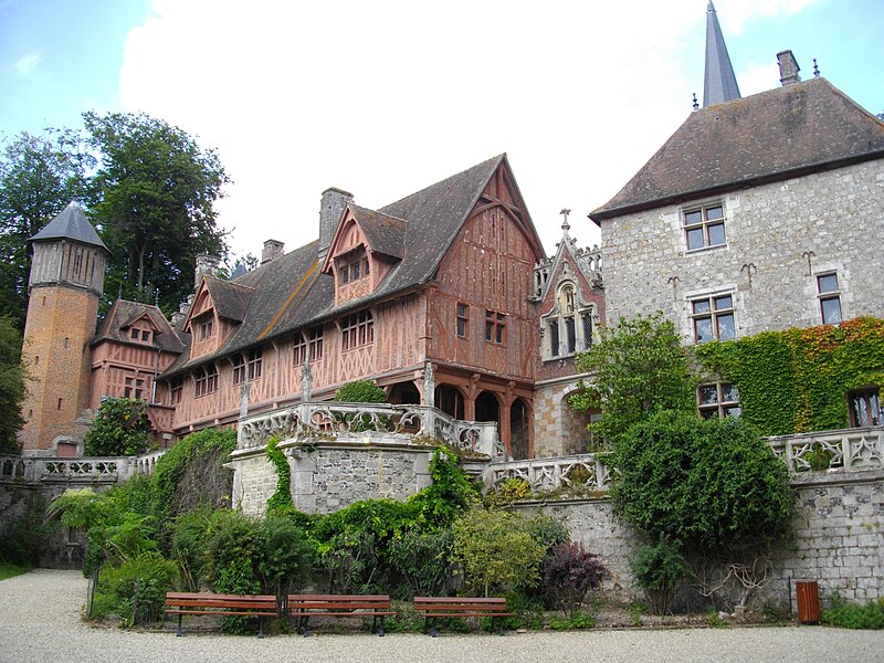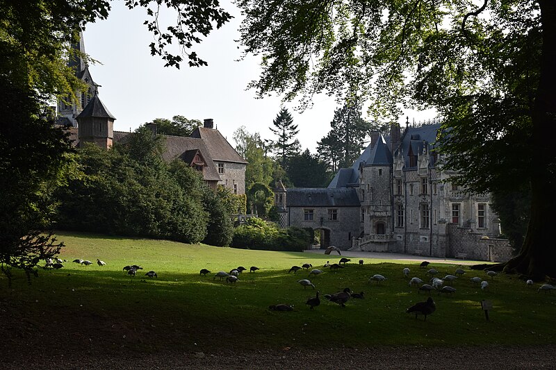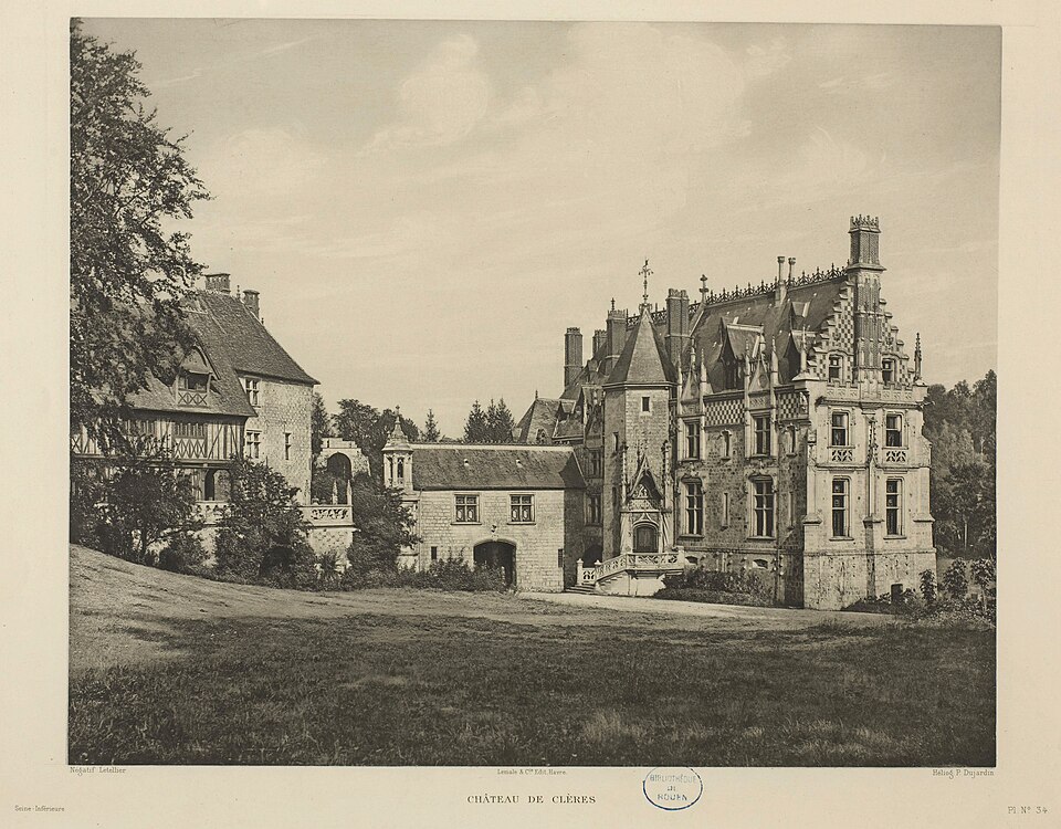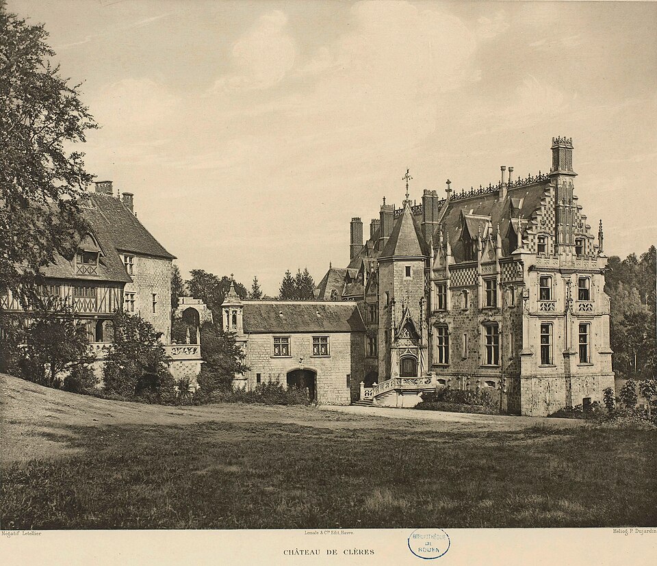 Le château de Clères se dresse sur la commune de Clères, avenue du Parc, dans le département de la Seine‑Maritime en Normandie. Il occupe un site occupé depuis le haut Moyen Âge, où subsistent des ruines sur une motte correspondant au premier château des Xe‑XIe siècles. L'organisation de l'enclos seigneurial, autrefois entouré de douves, conserve un front défensif au nord constitué d'un ensemble de dépendances dont les parties les plus anciennes datent du XIIIe siècle. Le logis et la galerie adjacente relèvent des aménagements des XVe‑XVIe siècles, avec des reprises et un rhabillage des dépendances côté cour. Berceau de la famille de Clères, le domaine passa ensuite aux Fontaine‑Martel, puis aux Béthune‑Charost et enfin aux Galard de Béarn. Partiellement démoli puis confisqué en 1418 par Henri V après la bataille d'Azincourt, il fut reconstruit à la fin du XVe siècle puis au XVIe siècle. Le château reçut en 1563 le roi Charles IX, et, pendant les guerres de religion, Jacques de Clères y accueillit le roi Henri IV en 1590 et 1592. En 1621 la seigneurie fut transmise par mariage aux Fontaine‑Martel; ces derniers, partisans de la Fronde, subirent la prise du château de Clérel par les troupes royales en 1649. La propriété demeura dans la descendance jusqu'à l'alliance avec les Béthune‑Charost, puis, en 1837, elle échoit aux Galard de Béarn. Au milieu du XIXe siècle, Hector de Galard, prince de Béarn, fit transformer et agrandir l'ensemble avec l'architecte Henri Parent et le sculpteur Foucher, donnant au bâtiment un aspect néo‑gothique après la démolition de l'aile sud ; le parc fut redessiné par le paysagiste Bussigny. Le château fut endommagé pendant la Première Guerre mondiale; après le conflit il fut acquis par l'ornithologiste Jean Delacour (1890‑1985), qui transforma le parc en jardin zoologique. De 1966 à 1989 le domaine appartint au Muséum d'histoire naturelle, puis il fut racheté par le conseil départemental de la Seine‑Maritime. Bâti en pierres, silex et grès, l'ensemble comprend le château, les communs et le manoir entourant la cour, la terrasse qui les porte, la motte et ses ruines, ainsi que le portail et la maison du régisseur. Cet ensemble bâti historique est inscrit au titre des monuments historiques par arrêté du 9 mai 2017, selon la délimitation figurant sur le plan annexé à l'arrêté.