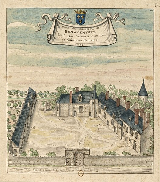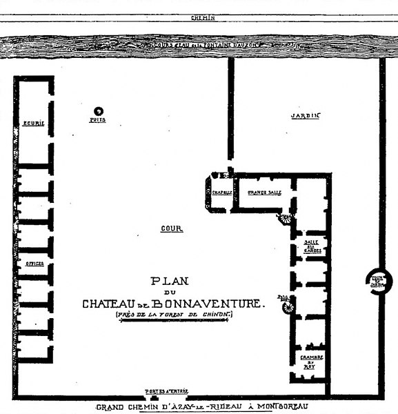 Le château de Bonaventure était une maison de chasse bâtie par Louis XI, qui y séjourna en 1480 et en 1482 ; le logis principal, situé à l'ouest de la cour, a été entièrement démoli en 1745, de même que la chapelle dédiée à saint Bonaventure. À l'est de la cour se dressait le bâtiment des Offices, parallèle au logis principal, dont subsiste le mur gouttereau oriental ; dans le mur nord du parc subsistent la porte d'entrée en plein cintre accompagnée d'un guichet et une maçonnerie en brique appartenant au logis principal. La tour sud‑ouest de l'enceinte, dite Tour des Jardins, est amortie par un crénelage.