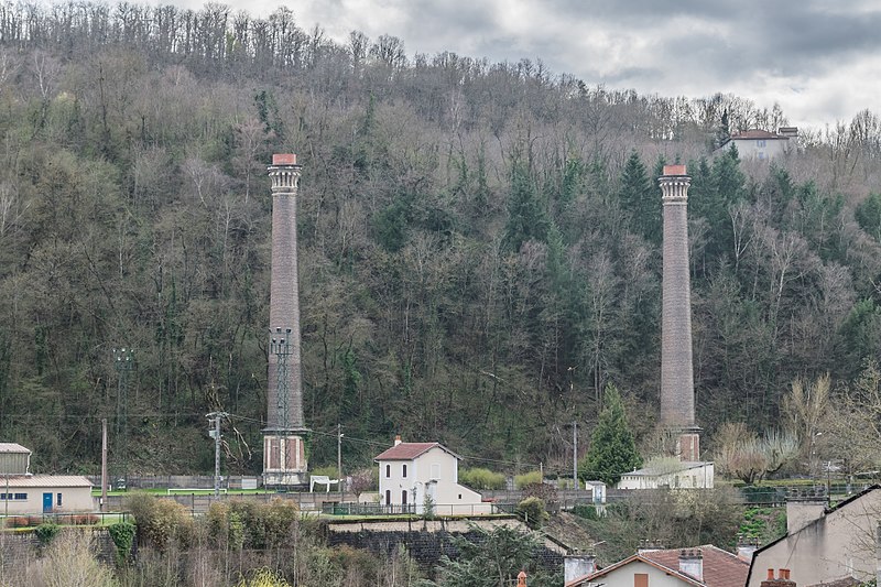 Les deux cheminées d'usine d'Aubin, situées dans la commune d'Aubin (Aveyron), sont liées au complexe sidérurgique des Forges d'Aubin, fondé en 1846 par la Compagnie des forges et fonderies d'Aubin. Elles ont été édifiées en 1847, une datation qui est parfois rapprochée des années 1850. Implantées en bordure de la voie ferrée Montauban–Rodez, ouverte en 1856, ces cheminées jumelles témoignent du développement industriel associé à l'essor des chemins de fer au milieu du XIXe siècle. Chaque cheminée repose sur un socle polygonal en briques et pierres et adopte un vocabulaire néo-classique. La partie sommitale est une souche ornementée constituant un chapiteau posé sur une colonne. Le sommet de ces cheminées a fait l'objet d'une restauration au début des années 1980. L'édifice a été inscrit au titre des monuments historiques en 2008.