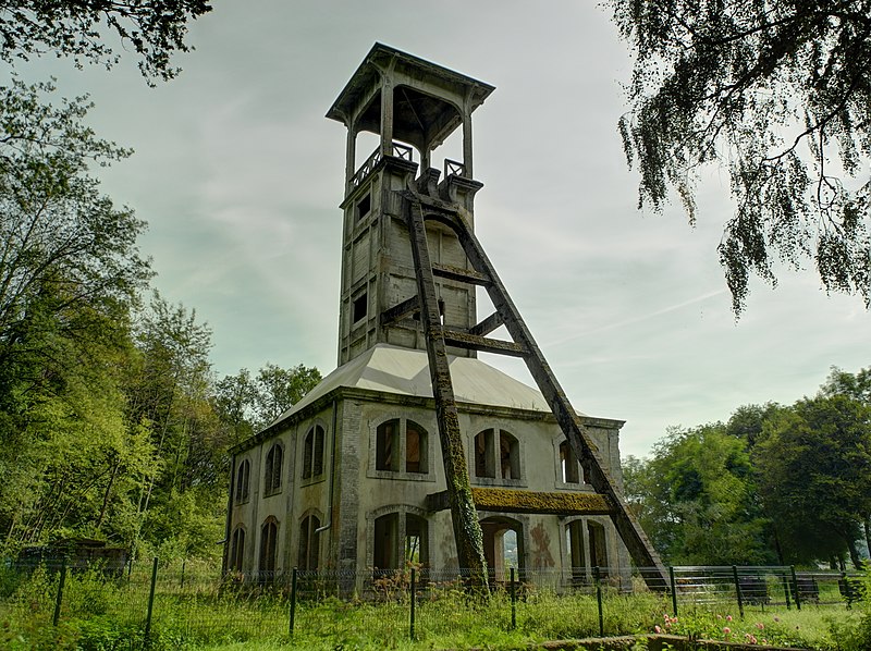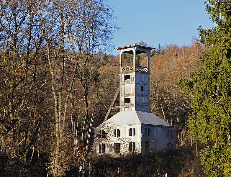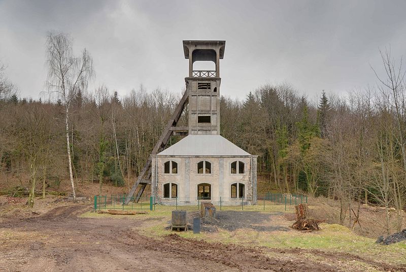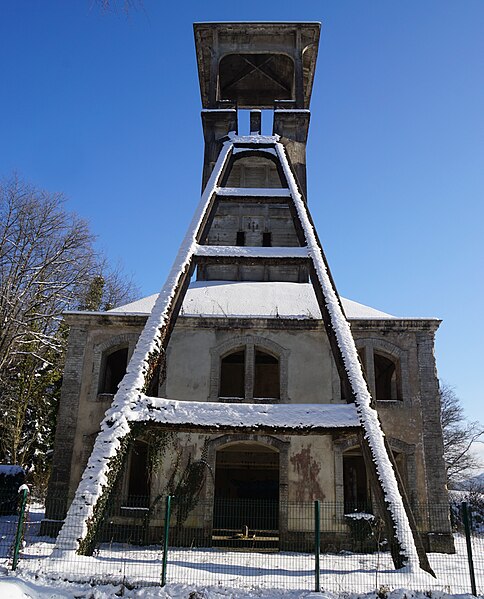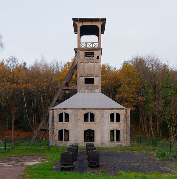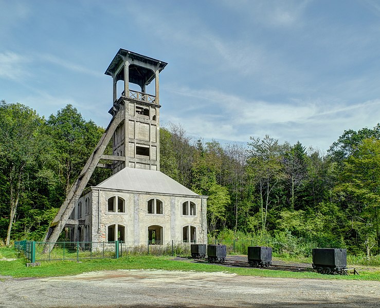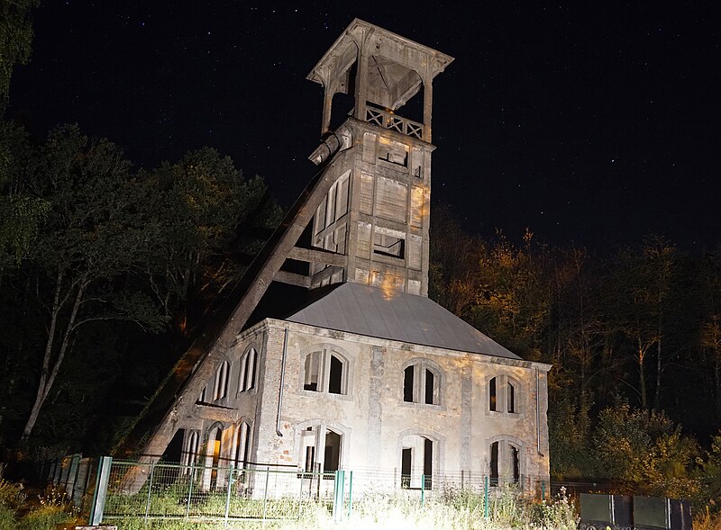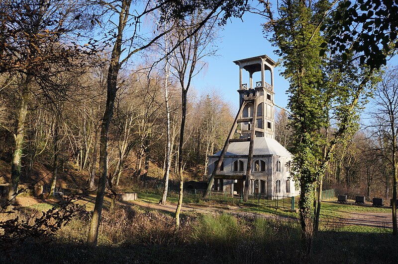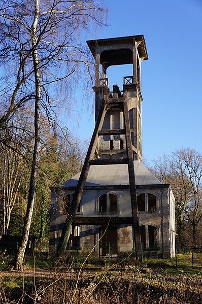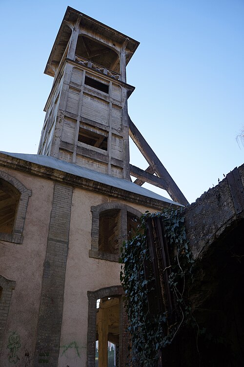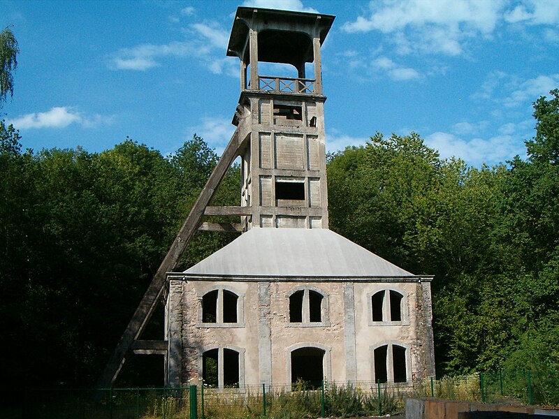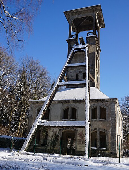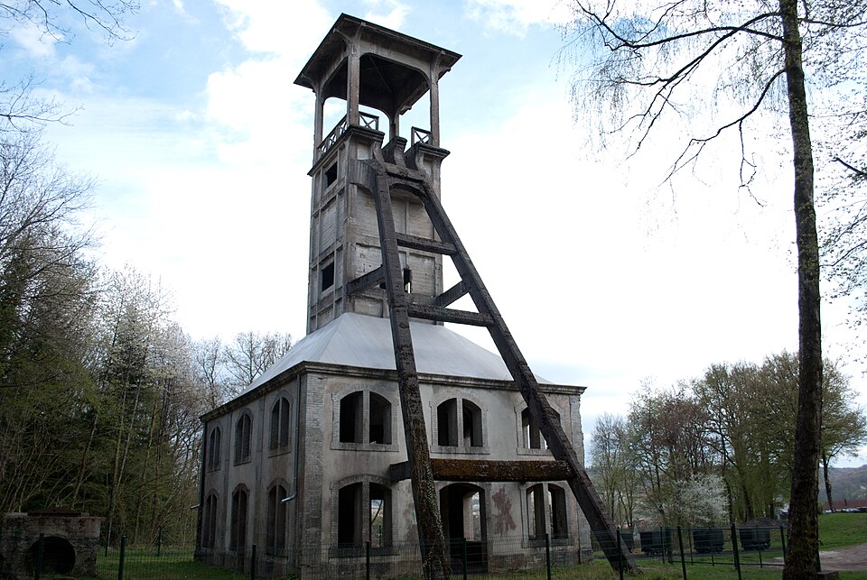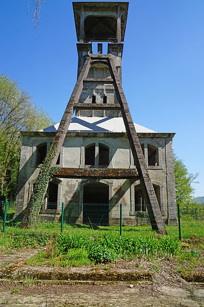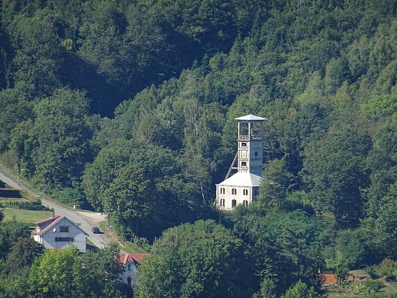 Le chevalement du puits Sainte‑Marie est le dernier témoin architectural des mines de houille de Franche‑Comté et l'un des derniers vestiges de l'activité minière locale. Construit en béton armé avec des chambranles de baies en brique, il présente une recherche de symétrie et d'harmonie rappelant l'architecture privée, ce qui atténue son caractère utilitaire. Le puits Sainte‑Marie a été foncé à partir de 1864 ; la couche de houille fut atteinte en 1866 à 305 mètres de profondeur, mais ne mesurait que 60 centimètres d'épaisseur. Malgré le percement de galeries de recherche, il ne donna pas les résultats attendus ; une galerie de jonction le relia au puits Saint‑Charles en 1869 et il servit alors d'aérage. Abandonné après la fermeture du puits Saint‑Charles, le site tomba en ruine. Vers 1920, le fonçage du puits du Chanois entraîna sa réhabilitation et, en 1924, la fosse fut équipée d'une machine d'extraction électrique et d'un chevalement en béton armé reconstruit. La pénurie de fer motiva l'emploi du béton armé pour la nouvelle structure. Le chevalement servit peu comme puits d'extraction mais assura l'aérage des bassins du Chanois et du Magny. Après la nationalisation des houillères, le bassin de Ronchamp fut confié à Électricité de France et, en 1950, les molettes et la machine d'extraction furent retirées pour être remontées sur un autre chevalement. Le puits cessa toute activité en 1950 ; il fut comblé en 1958 et ses installations démantelées, à l'exception du chevalement. La démolition du chevalement fut envisagée, mais il fut sauvé grâce aux protestations de la population et à l'action du docteur des mines Marcel Maulini, qui en fit un symbole à préserver. En 1972, la structure, alors propriété d'Électricité de France, fut cédée au conseil général de la Haute‑Saône pour un franc symbolique, sous l'impulsion d'un comité de rachat et d'aménagement. Restauré en 1979 par l'entreprise Meuziau, le site fut ensuite aménagé avec une locomotive et des berlines de mine en 1994. Le chevalement a été inscrit aux monuments historiques et a reçu le label « Patrimoine du XXe siècle » le 29 mars 2001. L'ouvrage, conçu en 1924 par l'ingénieur liégeois Charles Tournay, est de type avant carré porteur : quatre piliers verticaux supportent le plancher des molettes, surmonté d'un toit à quatre pans. Deux jambes de force, dirigées vers la machine d'extraction, s'appuient sur le plancher des molettes. Le bâtiment de recette associe poutres de béton hourdées de briques et toit à quatre pans. L'axe des molettes se situe à 18,50 mètres de hauteur et leur diamètre est de 3,30 mètres. La similitude avec d'autres chevalements conçus par Charles Tournay, notamment celui du puits de Sauwartan, se remarque dans la partie supérieure et les bigues. La forme générale et l'association du béton et de la brique rouge traduisent une volonté architecturale d'estomper le caractère utilitaire de l'édifice, caractéristique que révèlent également les vues aériennes et l'observation de la structure interne.