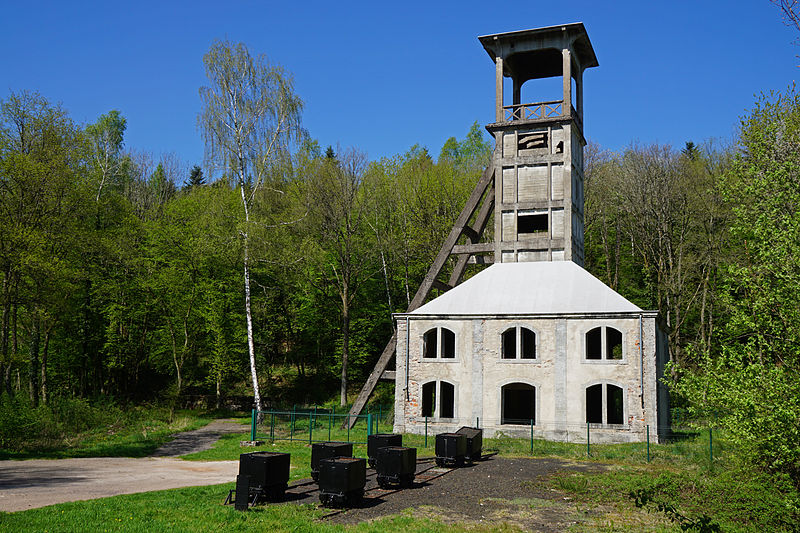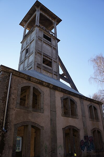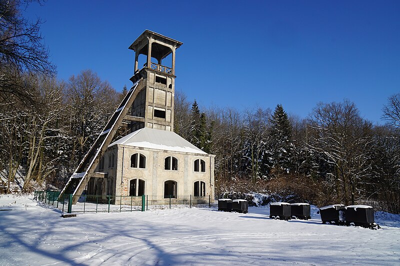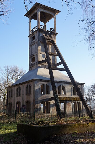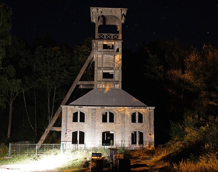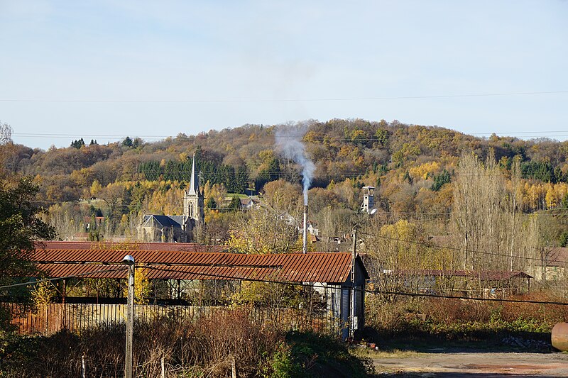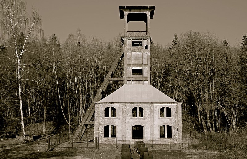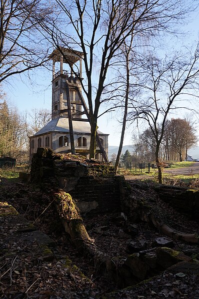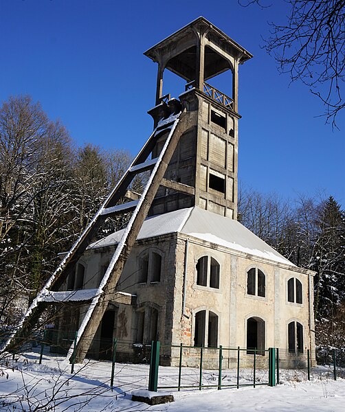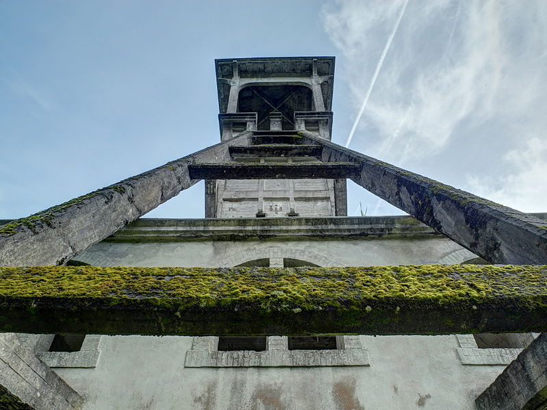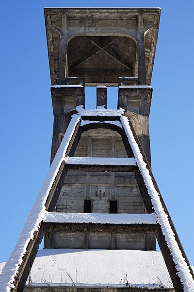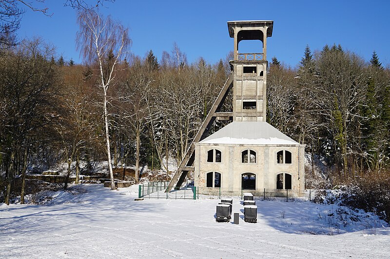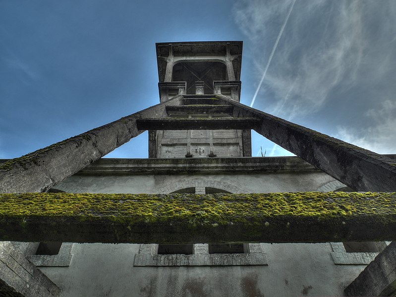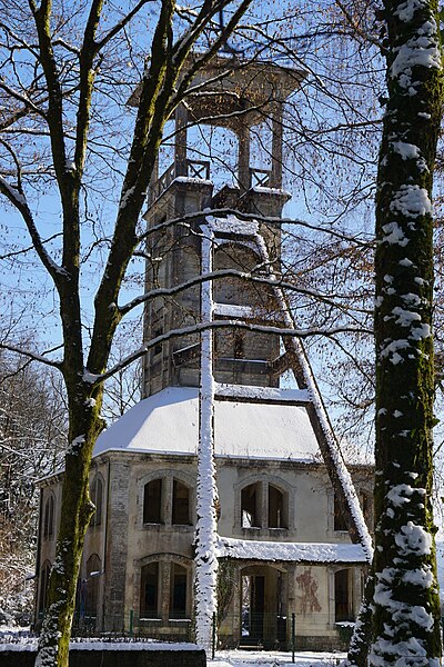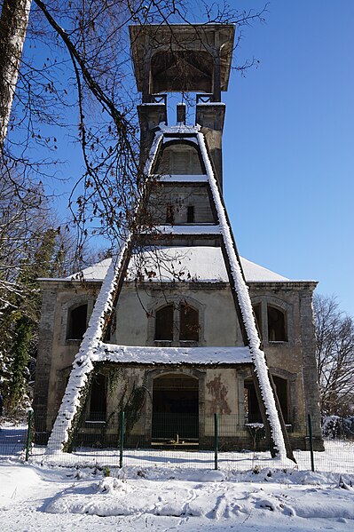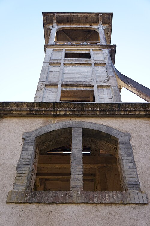 Le chevalement du puits Sainte‑Marie est le dernier témoin architectural des mines de houille de Franche‑Comté et l'un des derniers vestiges de l'activité minière locale. Construit en béton armé avec des chambranles de baies en brique, il présente une recherche de symétrie et d'harmonie rappelant l'architecture privée, ce qui atténue son caractère utilitaire. Le puits Sainte‑Marie a été foncé à partir de 1864 ; la couche de houille fut atteinte en 1866 à 305 mètres de profondeur, mais ne mesurait que 60 centimètres d'épaisseur. Malgré le percement de galeries de recherche, il ne donna pas les résultats attendus ; une galerie de jonction le relia au puits Saint‑Charles en 1869 et il servit alors d'aérage. Abandonné après la fermeture du puits Saint‑Charles, le site tomba en ruine. Vers 1920, le fonçage du puits du Chanois entraîna sa réhabilitation et, en 1924, la fosse fut équipée d'une machine d'extraction électrique et d'un chevalement en béton armé reconstruit. La pénurie de fer motiva l'emploi du béton armé pour la nouvelle structure. Le chevalement servit peu comme puits d'extraction mais assura l'aérage des bassins du Chanois et du Magny. Après la nationalisation des houillères, le bassin de Ronchamp fut confié à Électricité de France et, en 1950, les molettes et la machine d'extraction furent retirées pour être remontées sur un autre chevalement. Le puits cessa toute activité en 1950 ; il fut comblé en 1958 et ses installations démantelées, à l'exception du chevalement. La démolition du chevalement fut envisagée, mais il fut sauvé grâce aux protestations de la population et à l'action du docteur des mines Marcel Maulini, qui en fit un symbole à préserver. En 1972, la structure, alors propriété d'Électricité de France, fut cédée au conseil général de la Haute‑Saône pour un franc symbolique, sous l'impulsion d'un comité de rachat et d'aménagement. Restauré en 1979 par l'entreprise Meuziau, le site fut ensuite aménagé avec une locomotive et des berlines de mine en 1994. Le chevalement a été inscrit aux monuments historiques et a reçu le label « Patrimoine du XXe siècle » le 29 mars 2001. L'ouvrage, conçu en 1924 par l'ingénieur liégeois Charles Tournay, est de type avant carré porteur : quatre piliers verticaux supportent le plancher des molettes, surmonté d'un toit à quatre pans. Deux jambes de force, dirigées vers la machine d'extraction, s'appuient sur le plancher des molettes. Le bâtiment de recette associe poutres de béton hourdées de briques et toit à quatre pans. L'axe des molettes se situe à 18,50 mètres de hauteur et leur diamètre est de 3,30 mètres. La similitude avec d'autres chevalements conçus par Charles Tournay, notamment celui du puits de Sauwartan, se remarque dans la partie supérieure et les bigues. La forme générale et l'association du béton et de la brique rouge traduisent une volonté architecturale d'estomper le caractère utilitaire de l'édifice, caractéristique que révèlent également les vues aériennes et l'observation de la structure interne.